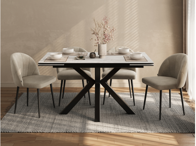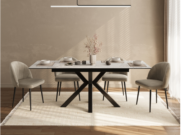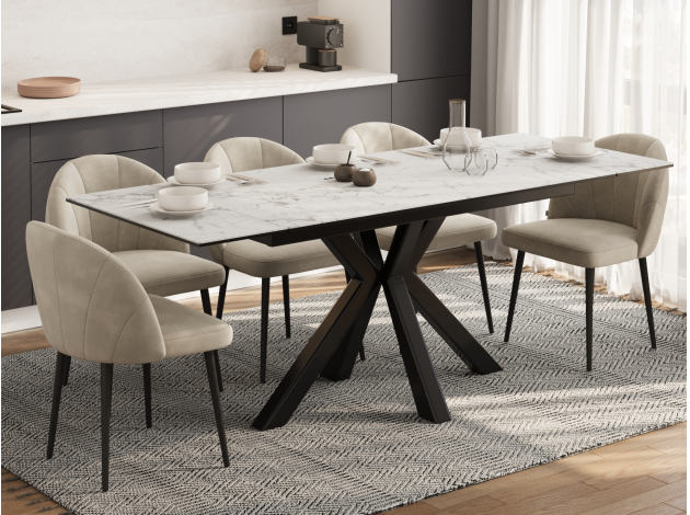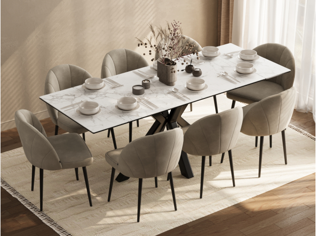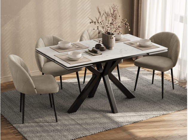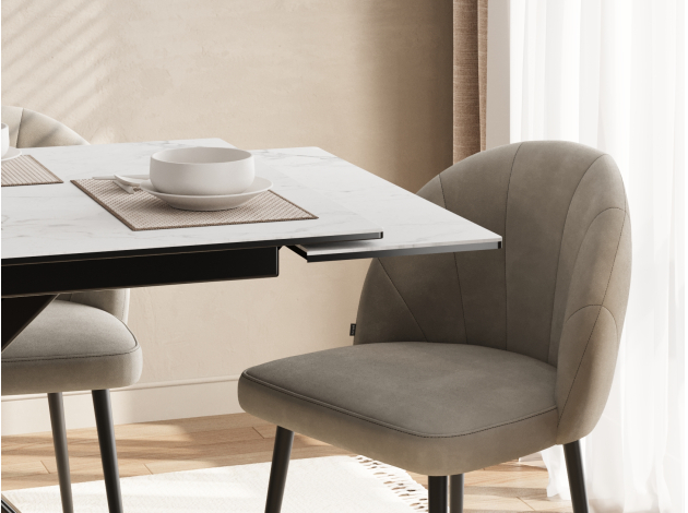 Красивый стол, удобный за счет расположения ножек и выдвижного механизма при увеличении обеденной части стола