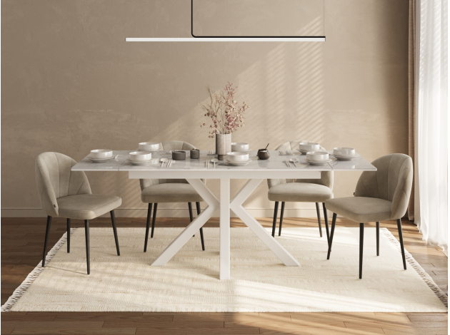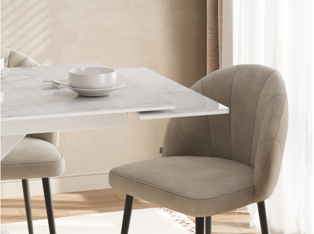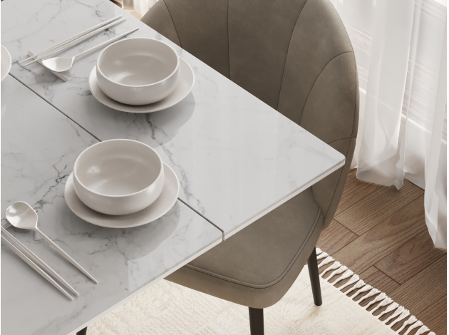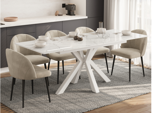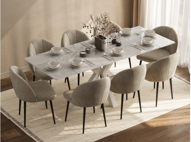 Красивый стол, удобный за счет расположения ножек и выдвижного механизма при увеличении обеденной части стола
