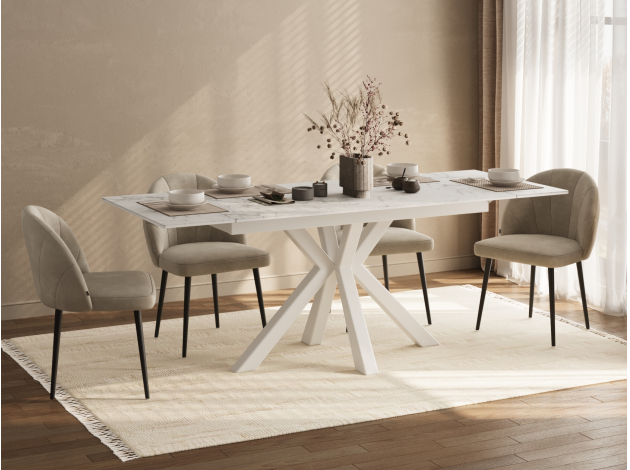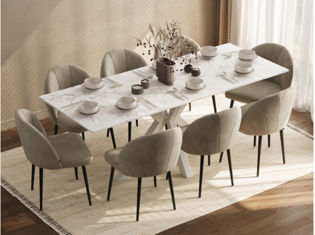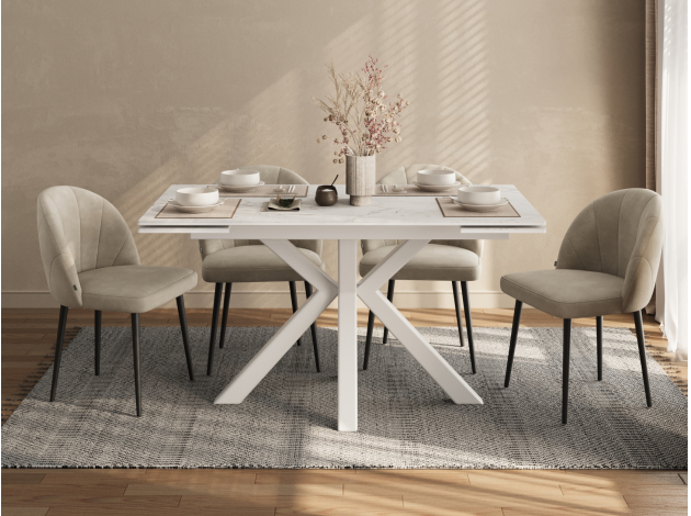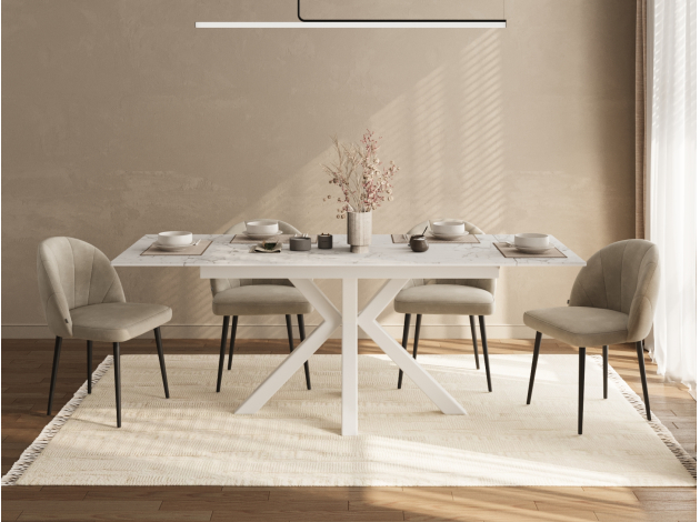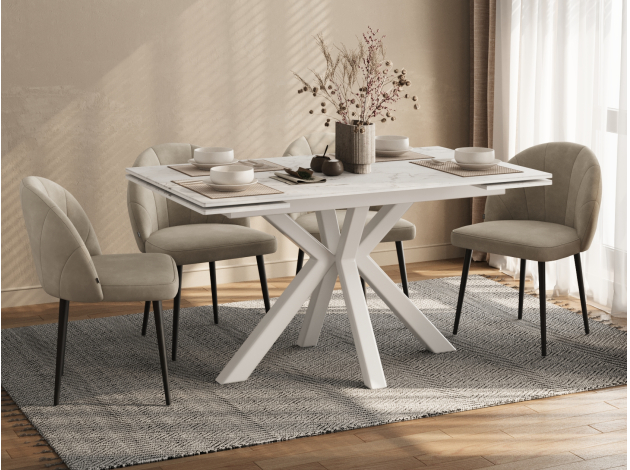 Красивый стол, удобный за счет расположения ножек и выдвижного механизма при увеличении обеденной части стола