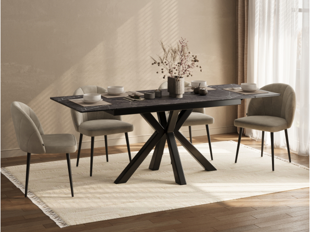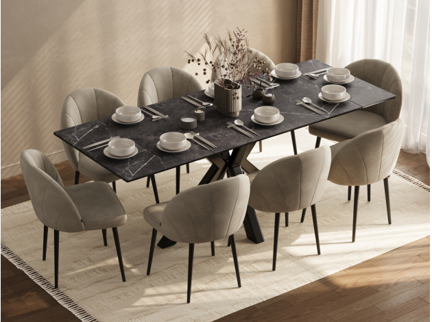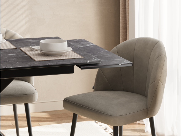 Красивый стол, удобный за счет расположения ножек и выдвижного механизма при увеличении обеденной части стола