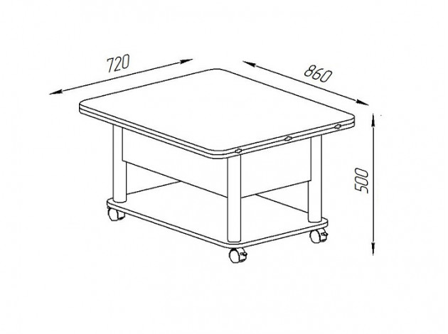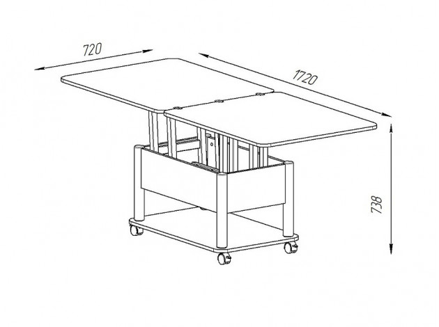 Столешница и нижняя полка произведены из ЛДСП, а ножки изготовлены из металла. Чтобы разложить стол, необходимо потянуть на себя столешницу, когда она поднимется, нужно раскрыть ее.