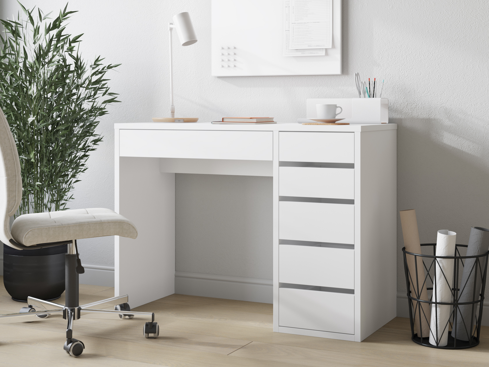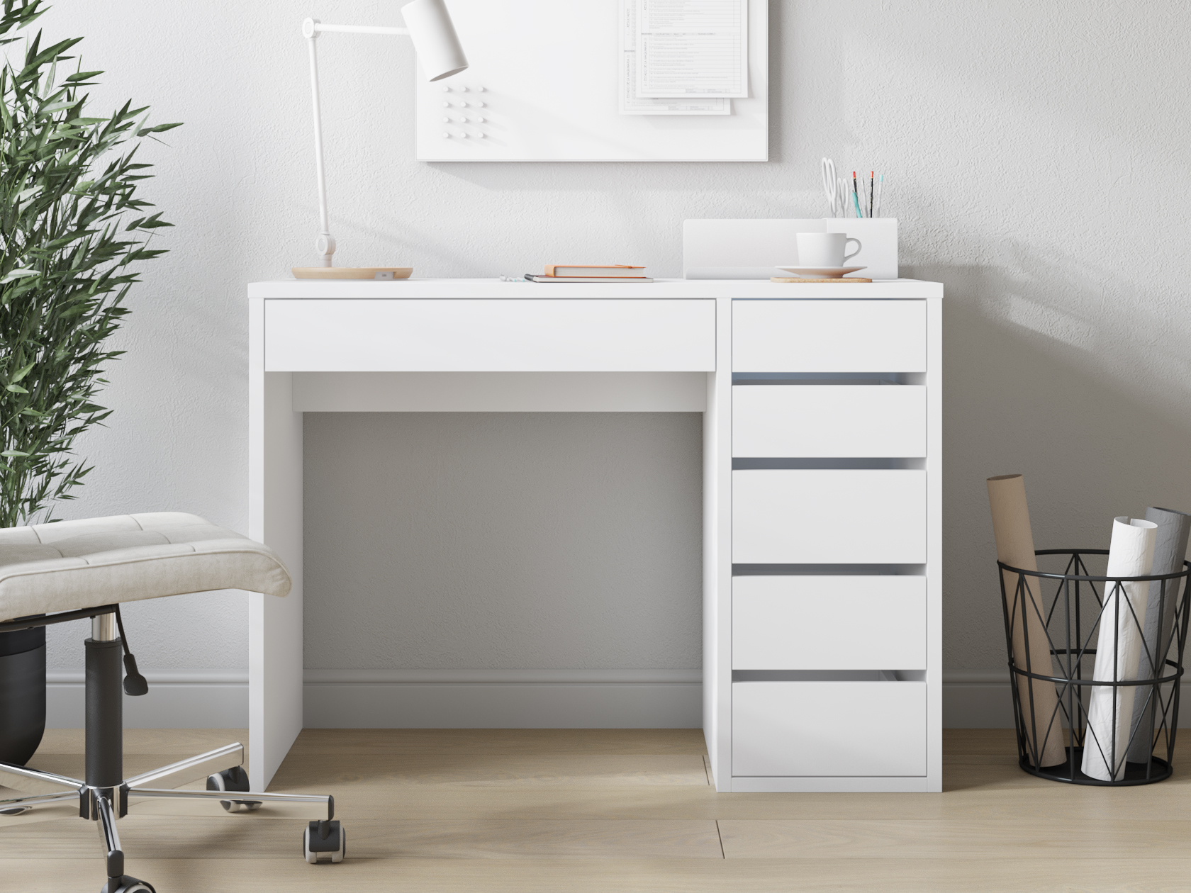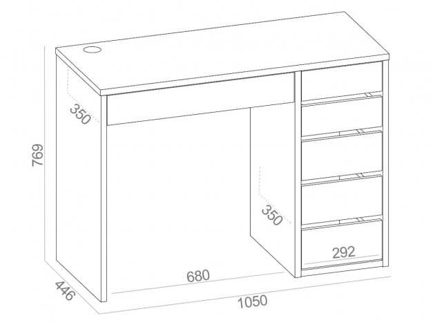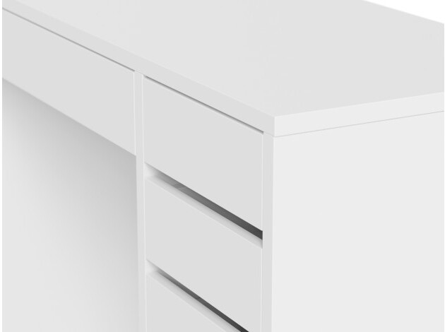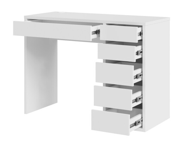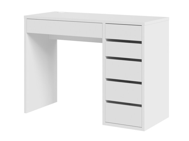 Небольшой письменный стол Алтай удачно дополнит интерьер современной спальни или гостиной. На просторной столешнице разместятся и ноутбук, и необходимые в работе материалы. Модель дополнена тумбой с пятью ящиками разного размера на шариковых направляющих полного выдвижения. Продуманные зазоры между ящиками позволяют отказаться от привычных ручек — чтобы открыть ящик достаточно потянуть за фасад.