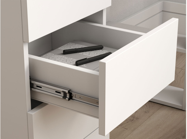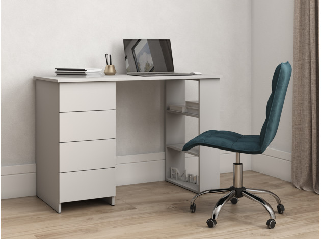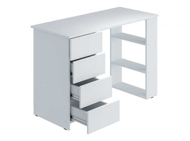 Письменный стол Юта в лаконичном современном дизайне поможет обустроить комфортную рабочую или учебную зону. Тумба с выдвижными ящиками и полки под столешницей позволят хранить в быстром доступе необходимые канцелярские принадлежности, литературу и документы формата А4. Ящики обладают плавным бесшумным ходом и открываются за выступающие края фасадов.