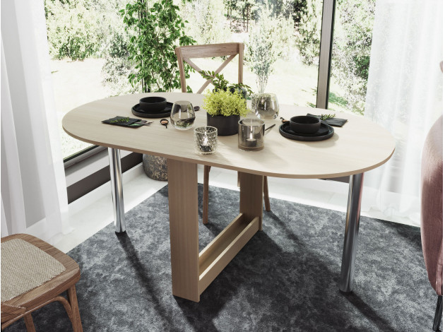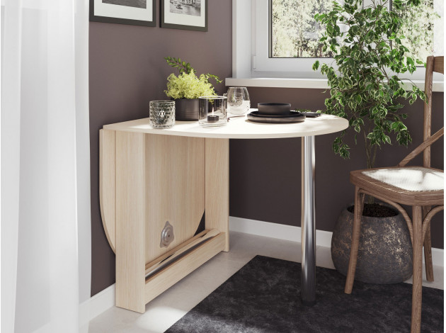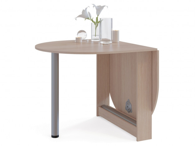 Небольшой овальный стол-книжка с откидной столешницей. Модель будет удобным элементом на небольшой кухне в квартире или в дачном домике. Отсутствие углов у столешницы снижает травмоопасность. При необходимости размеры столешницы можно увеличить, подняв крыло и прикрутив к нему ножку. В сложенном состоянии ножка хранится в специальной нише в основании стола.