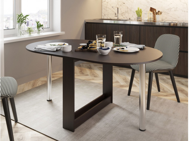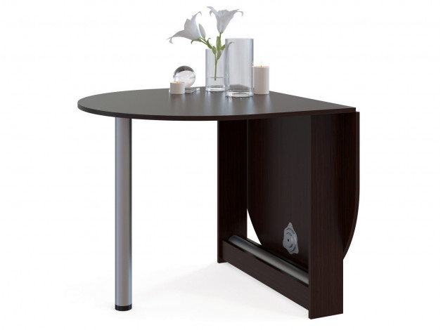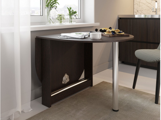 Небольшой овальный стол-книжка с откидной столешницей. Модель будет удобным элементом на небольшой кухне в квартире или в дачном домике. Отсутствие углов у столешницы снижает травмоопасность. При необходимости размеры столешницы можно увеличить, подняв крыло и прикрутив к нему ножку. В сложенном состоянии ножка хранится в специальной нише в основании стола.