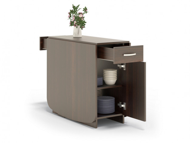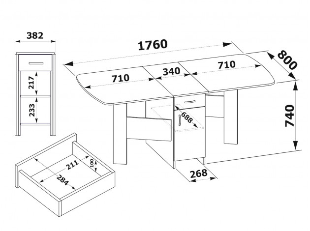 Многофункциональный стол-книжка с ящиками и полочками. Полезный элемент в квартире или загородном домике. В собранном виде может использоваться в качестве тумбы (ширина всего 38,2 см). А при необходимости модель превращается в полноценный обеденный стол шириной 176 см. Внутренние размеры ящиков составляют — 21,1 х 35,4 см.