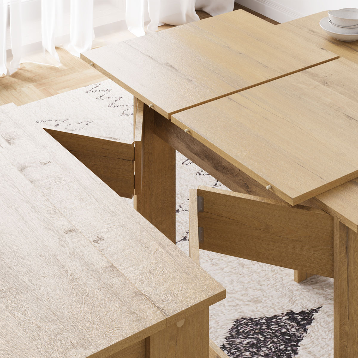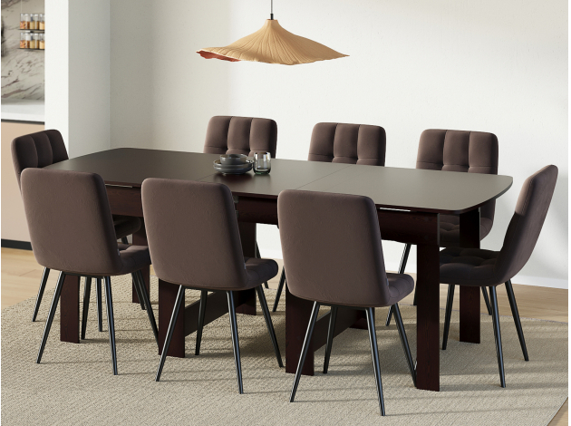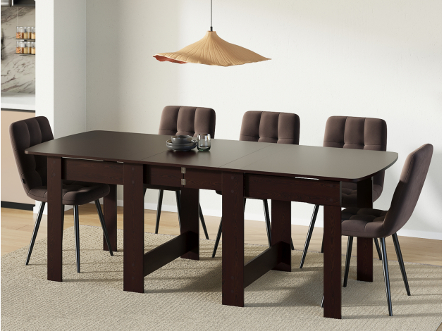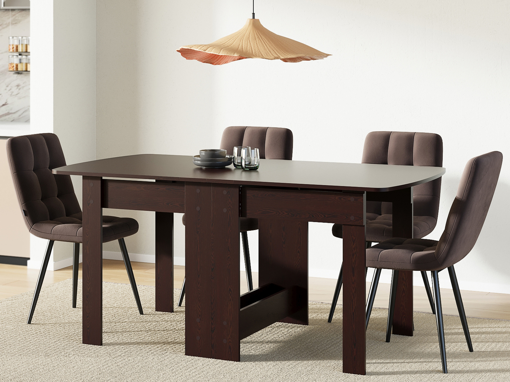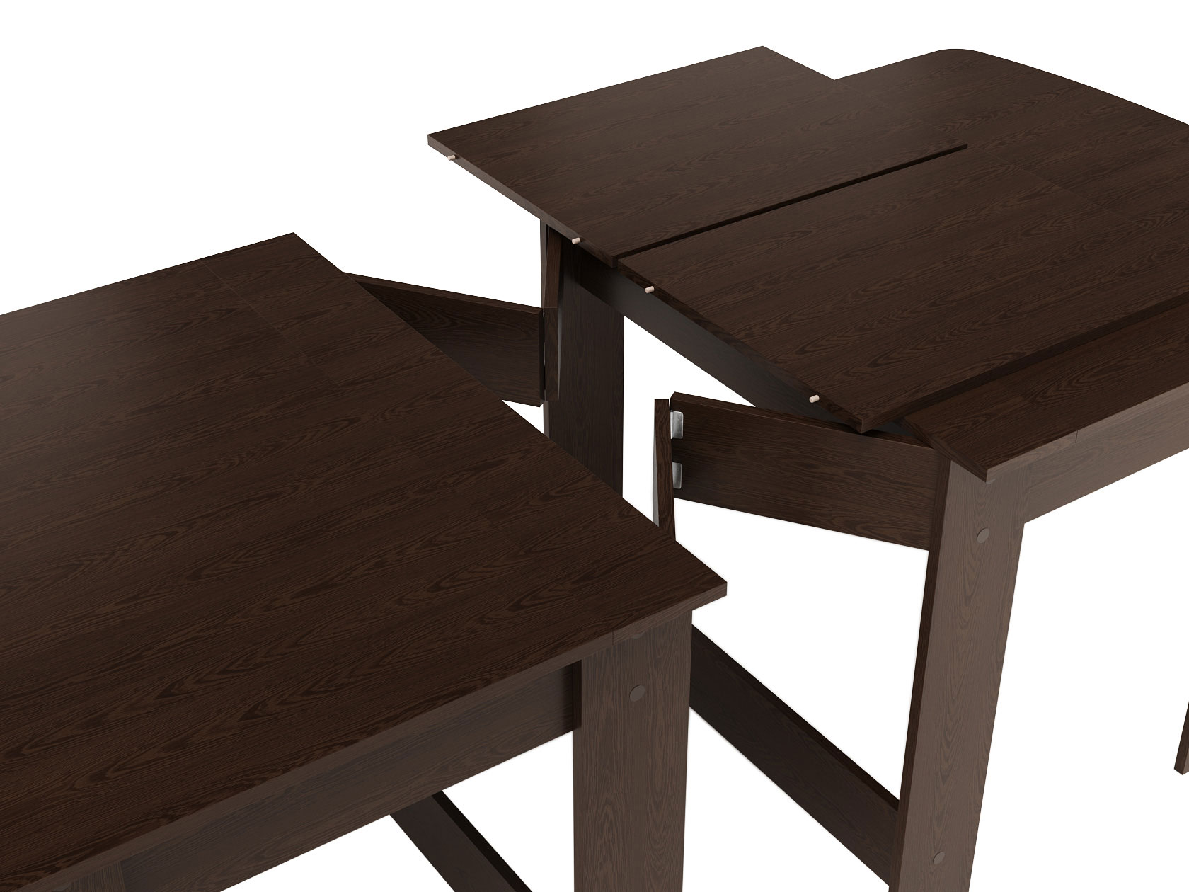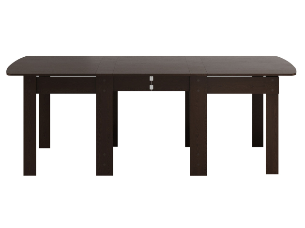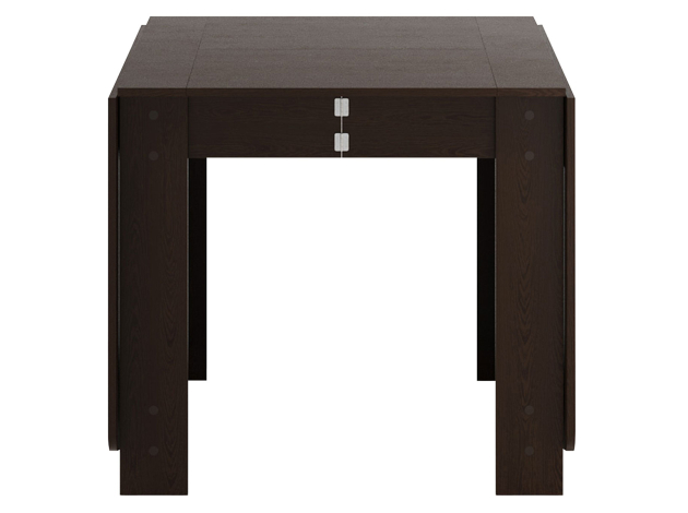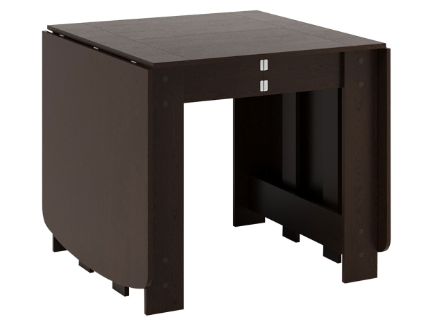 Площадь столешницы можно варьировать в зависимости от нужного количества посадочных мест. В разных положениях стол вмещает от двух до восьми человек.