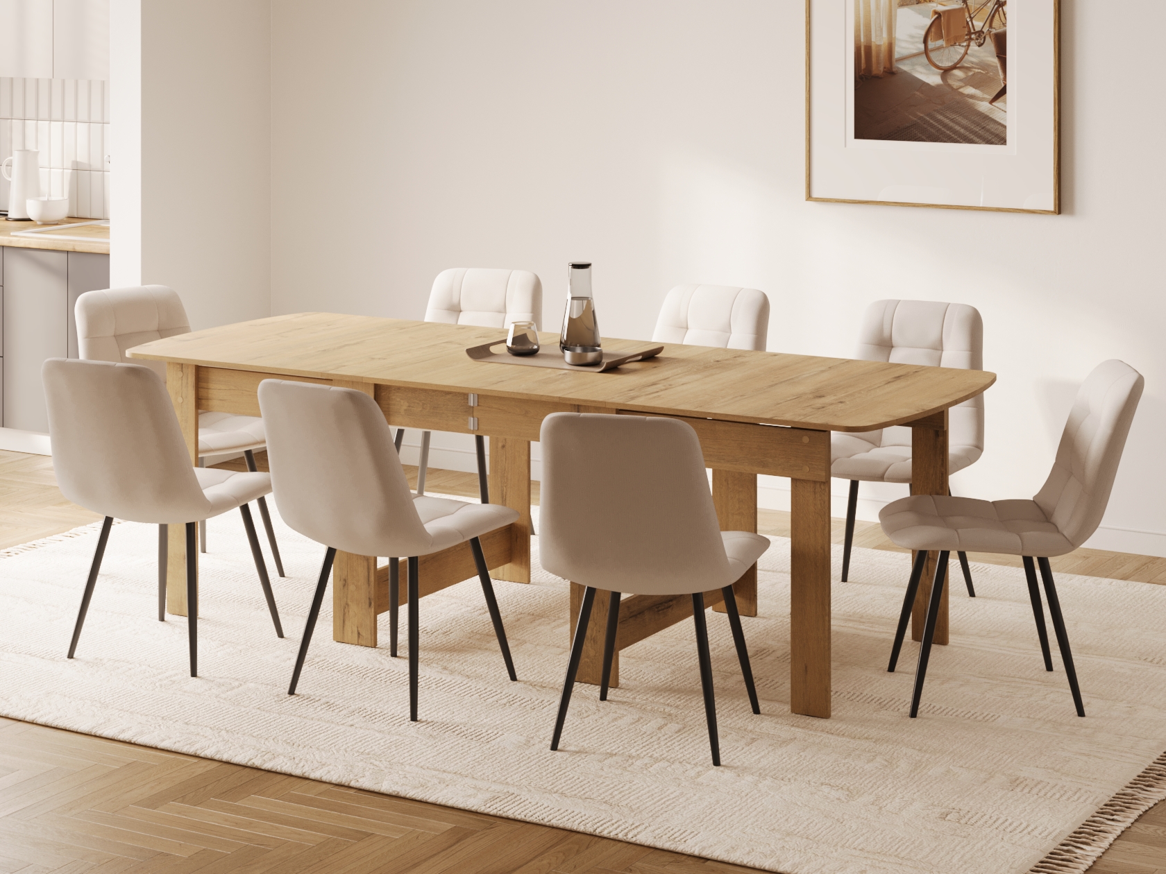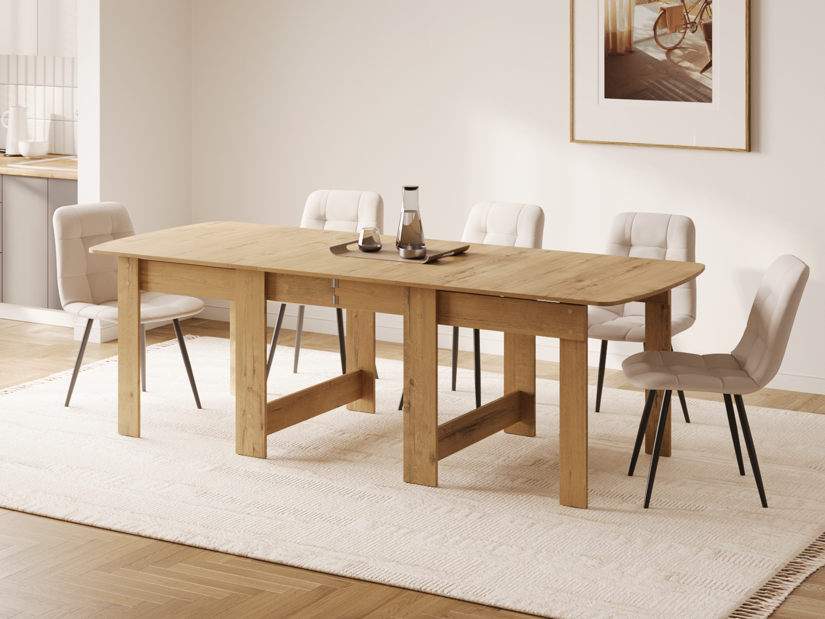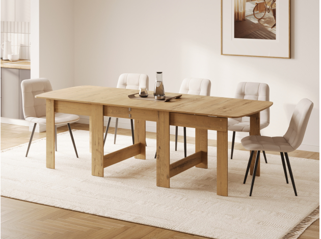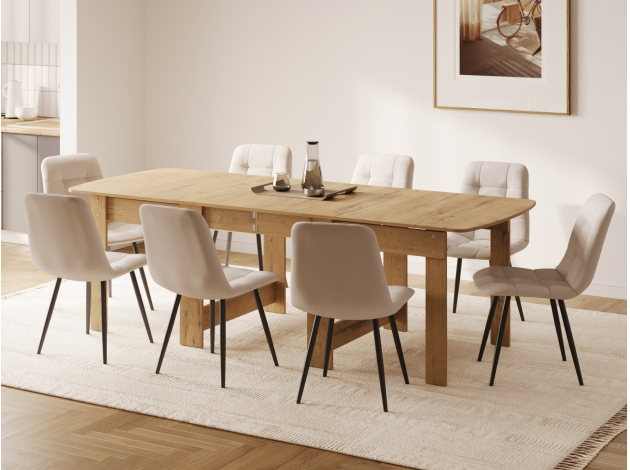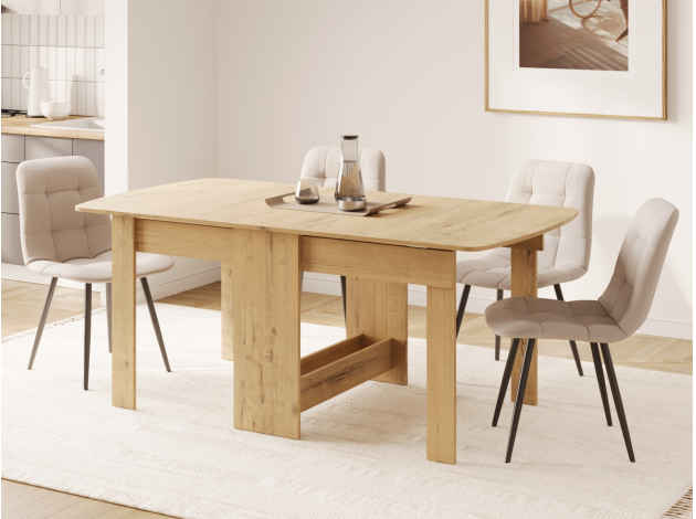 Площадь столешницы можно варьировать в зависимости от нужного количества посадочных мест. В разных положениях стол вмещает от двух до восьми человек.