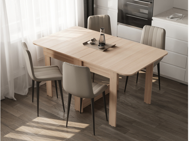 • Стол-книжка Тайга Миди станет практичным решением для небольшой квартиры. В сложенном виде прямоугольная модель не занимает много места, а с помощью простого механизма трансформации легко превращается в более просторную. Отсутствие острых углов обеспечивает безопасную эксплуатацию, а надежные опоры гарантируют устойчивость.
