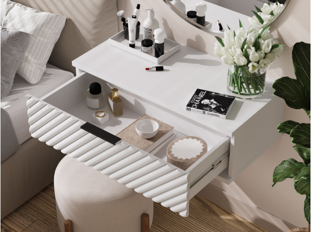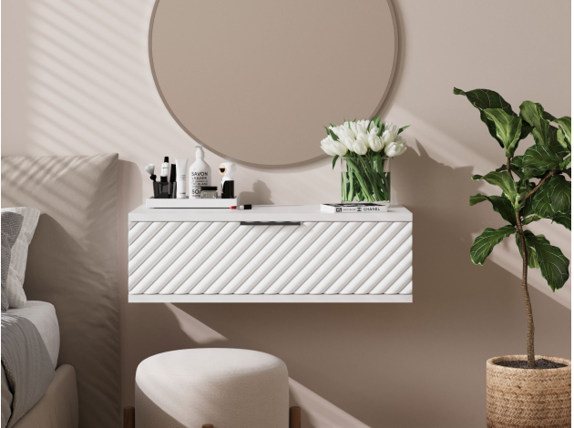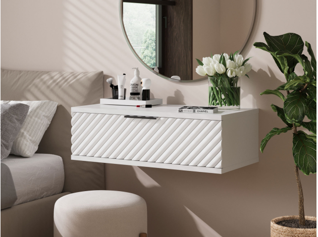 Подвесной туалетный столик Алегра создаст дополнительное место для хранения и внесет разнообразие в меблировку. Рельефный декор и контрастная фурнитура — детали, которые формируют эффектный облик модели. Парящая конструкция экономит пространство и создает визуально легкую обстановку.