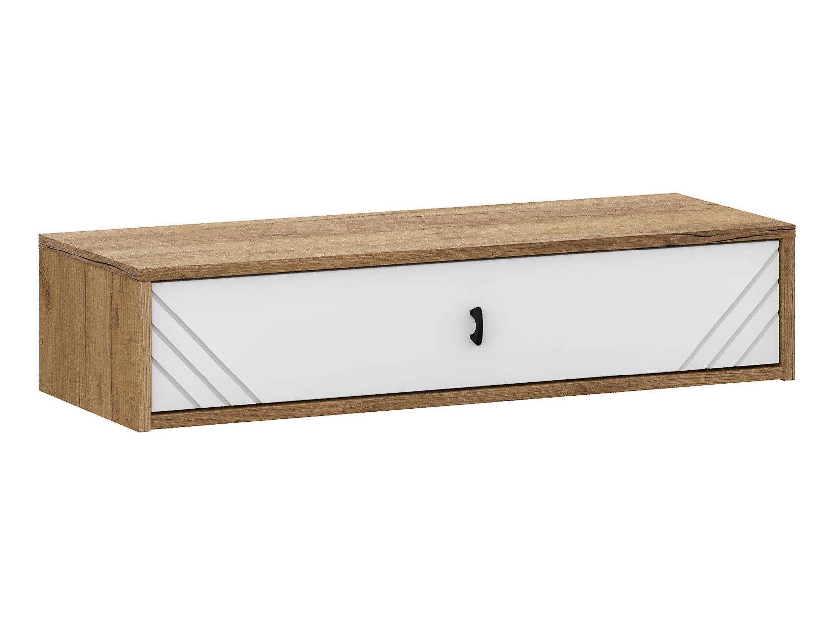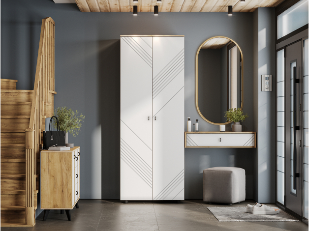 Навесной туалетный столик Кайло создаст дополнительную зону для хранения украшений и косметики без лишних затрат пространства. Парящая конструкция экономит место на полу и создает визуально легкую обстановку. Декоративная фрезеровка и контрастная фурнитура формируют эффектный облик модели.