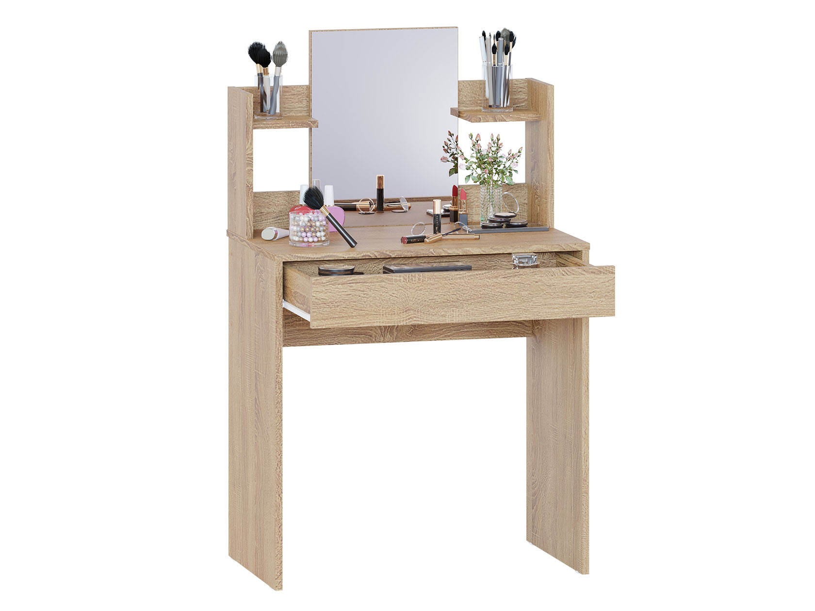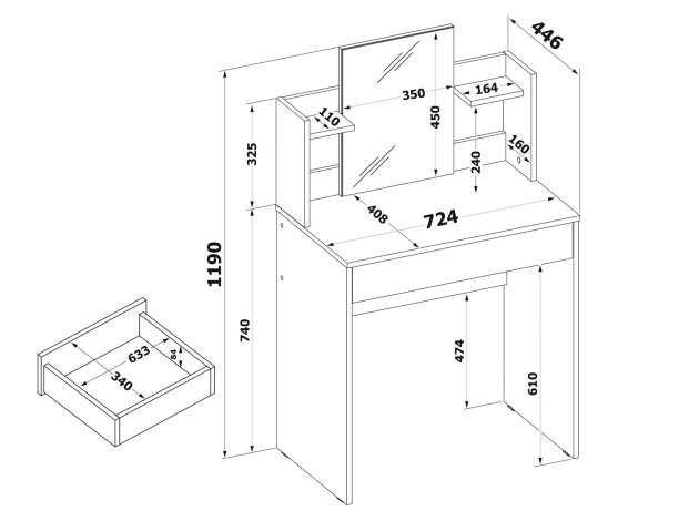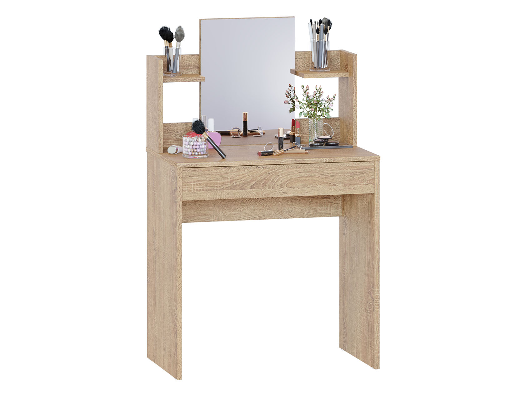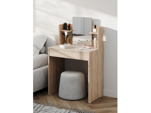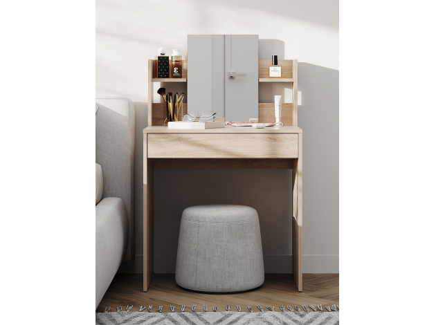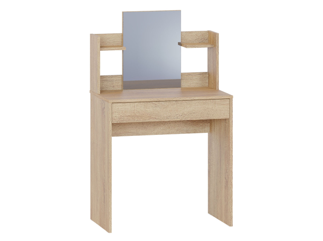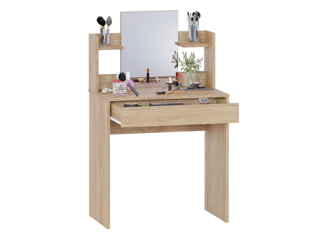 Туалетный столик Кравец компактен и функционален. Небольшое зеркало дополнено удобными полками и выдвижным ящиком для хранения уходовых средств, косметики и необходимых аксессуаров. Минималистичный дизайн можно адаптировать под большинство современных интерьеров.