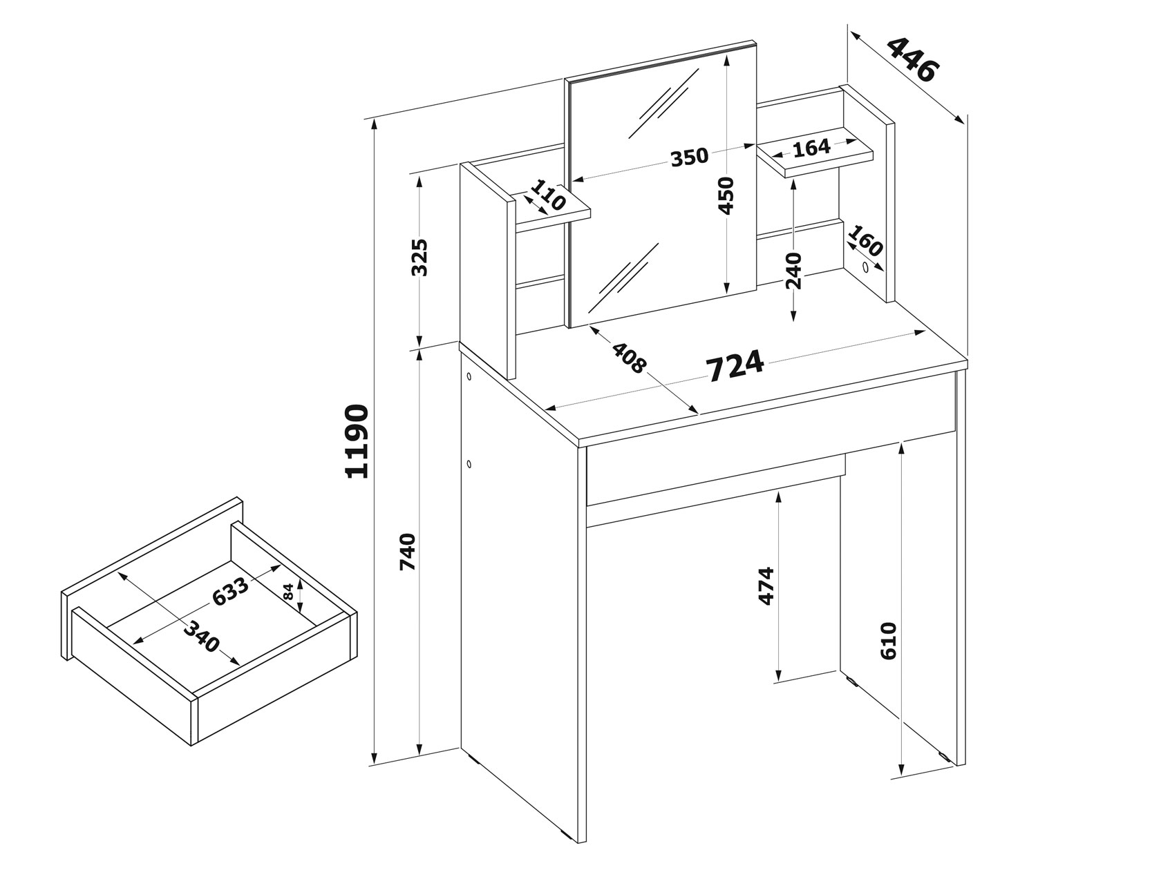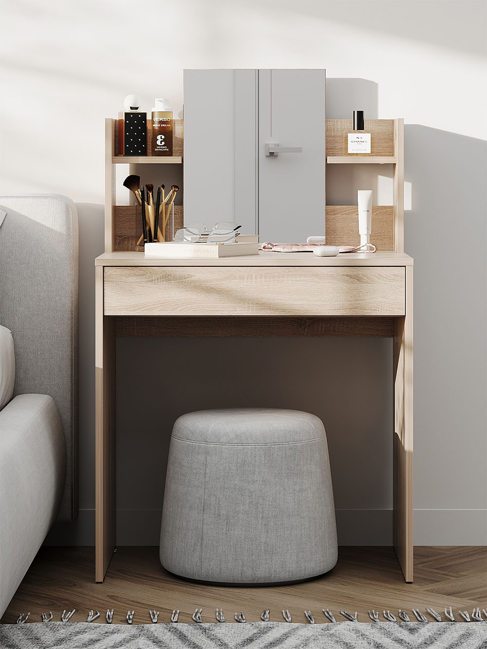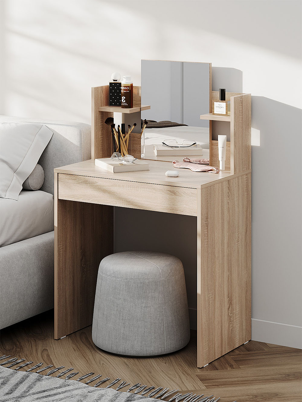 Туалетный столик Кравец компактен и функционален. Небольшое зеркало дополнено удобными полками и выдвижным ящиком для хранения уходовых средств, косметики и необходимых аксессуаров. Минималистичный дизайн можно адаптировать под большинство современных интерьеров.
