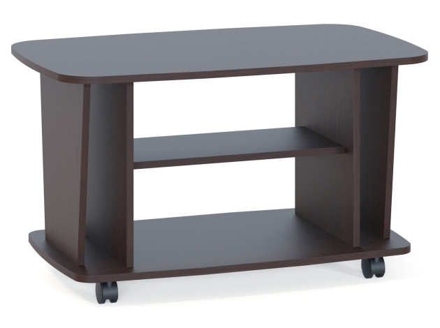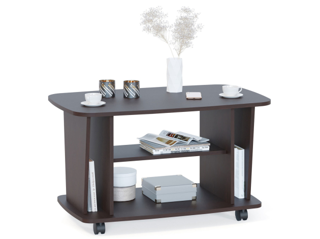 Журнальный столик Альвито оснащен поворотными колесиками, поэтому легко перемещается по комнате. Несколько отделений помогут разместить в быстром доступе книги, ноутбук и коробки с разными мелочами. Края столешницы и основания скруглены. Это делает модель комфортной даже для тесной гостиной, где выше риск удариться об острый угол мебели.