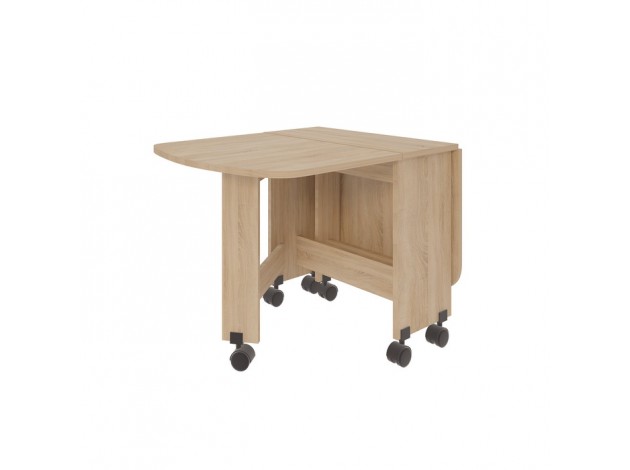 В сложенном состоянии ширина тумбы составляет 28,2 см. Столик можно разложить полностью, подняв оба крыла, и тогда ширина столешницы будет 119,2 см. Конструкция также позволяет использовать модель в полуразложенном состоянии, ширина столешницы будет — 73,7 см.