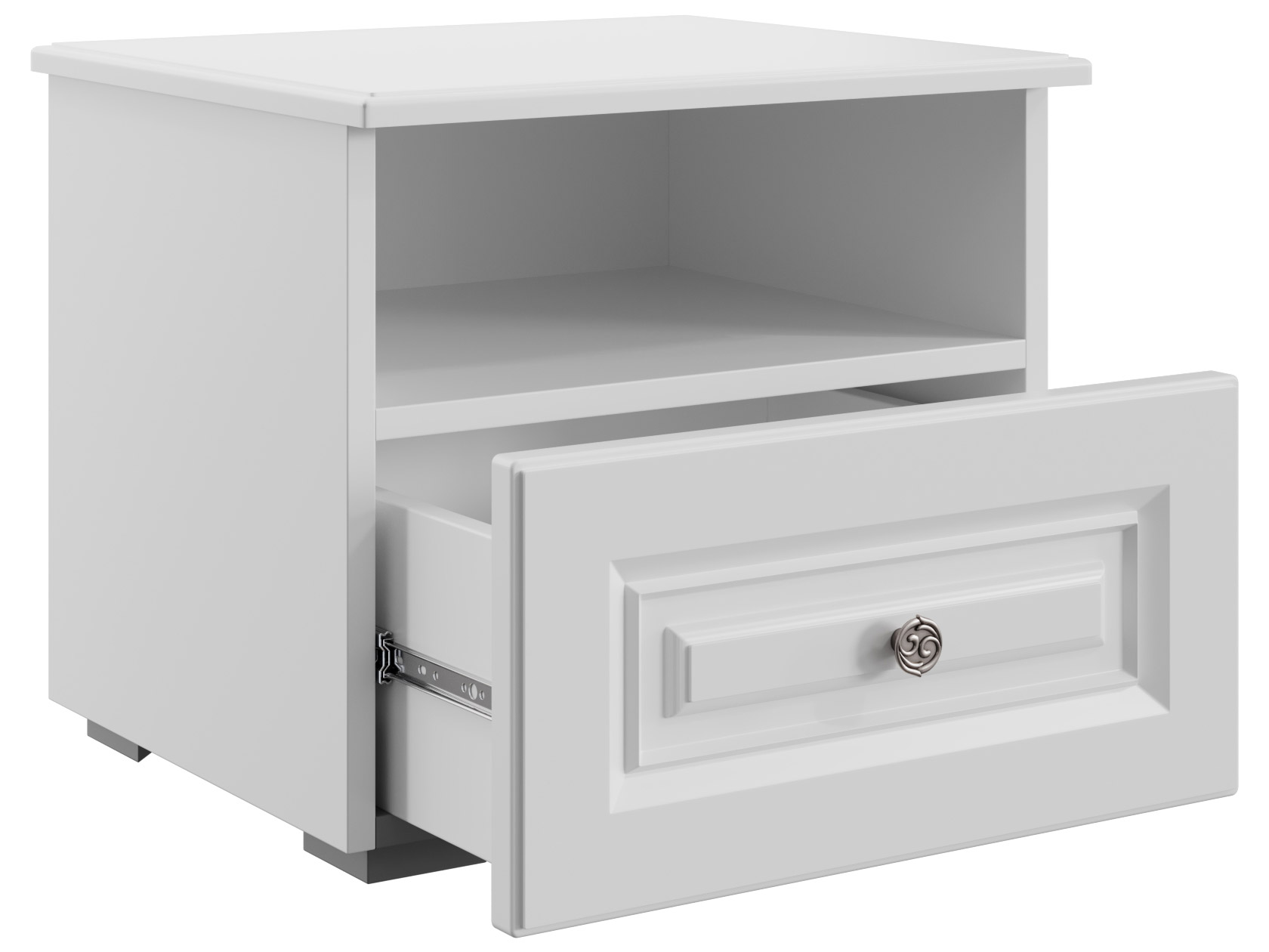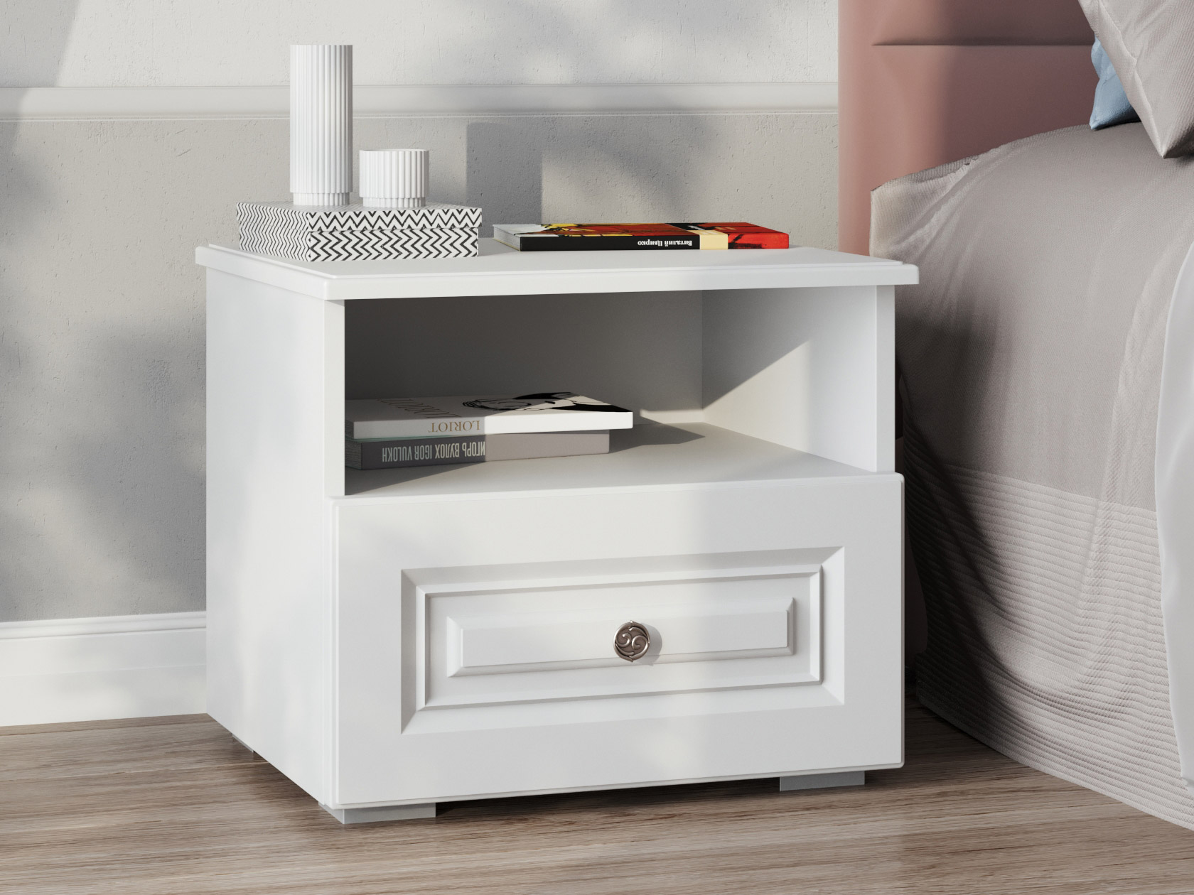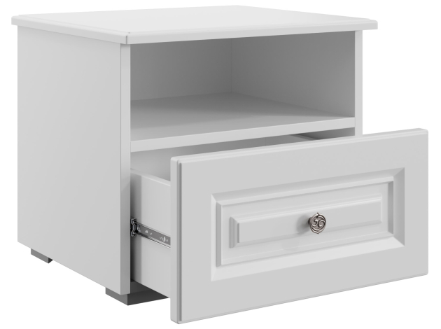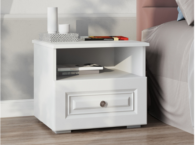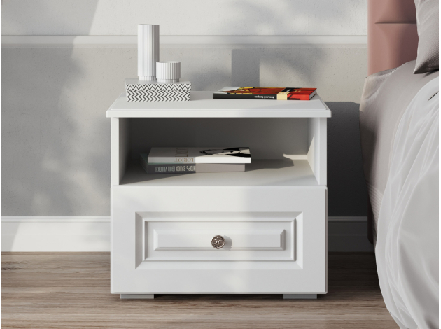 Прикроватная тумба Аврора выполнена в классическом стиле. Стильная фрезеровка и изящная ручка подчеркивают элегантный вид модели. Комбинированное наполнение позволяет удобно расположить рядом с кроватью вещи, которые часто нужны перед сном и после пробуждения.