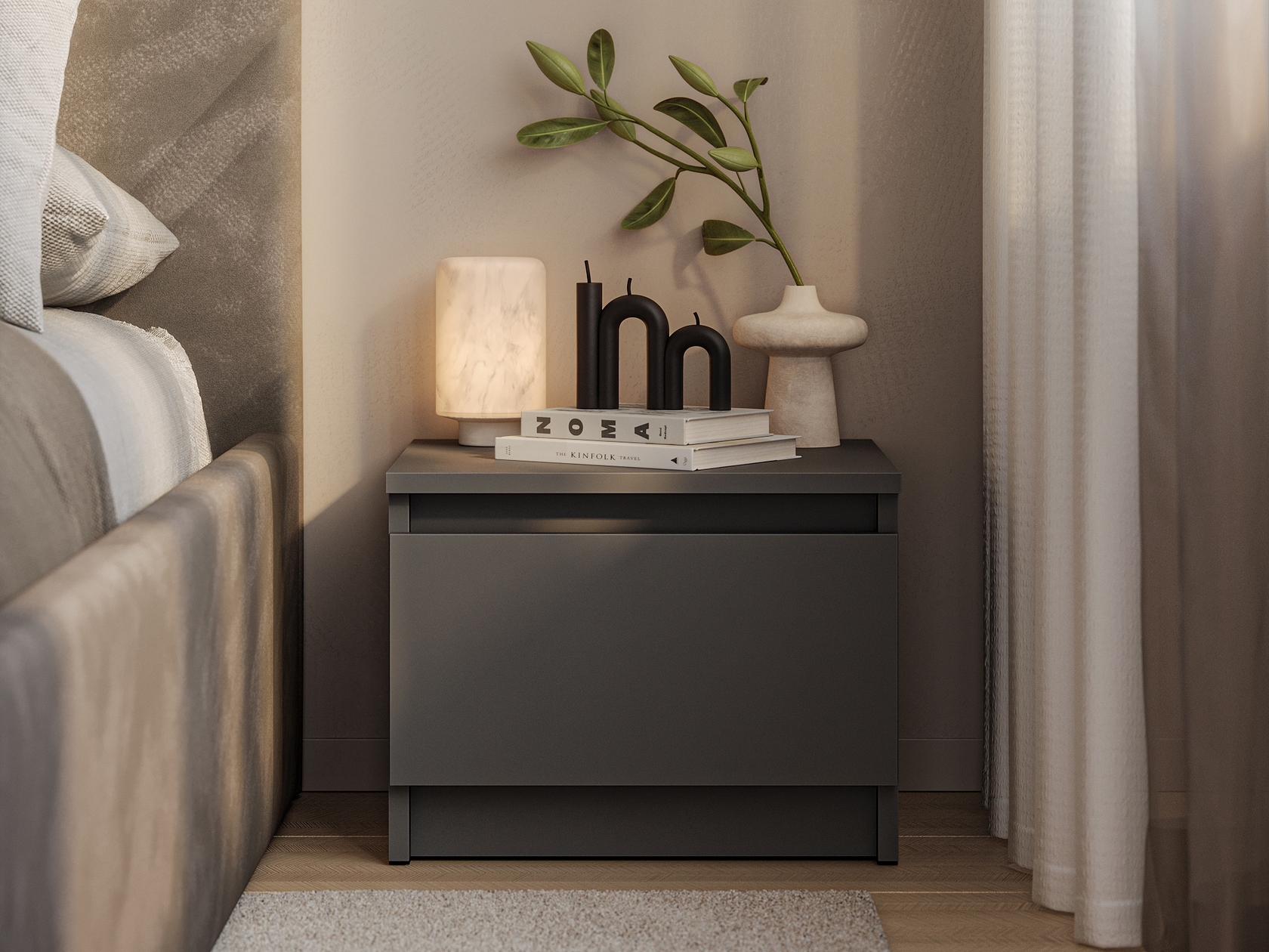 Прикроватная тумба Диксон послужит декоративным элементом в спальне и местом для хранения различных предметов. Компактная модель идеальна для установки рядом с кроватью. Выдвижной ящик обеспечит быстрый доступ к необходимым мелочам. На поверхности можно поставить небольшой ночник или будильник.
