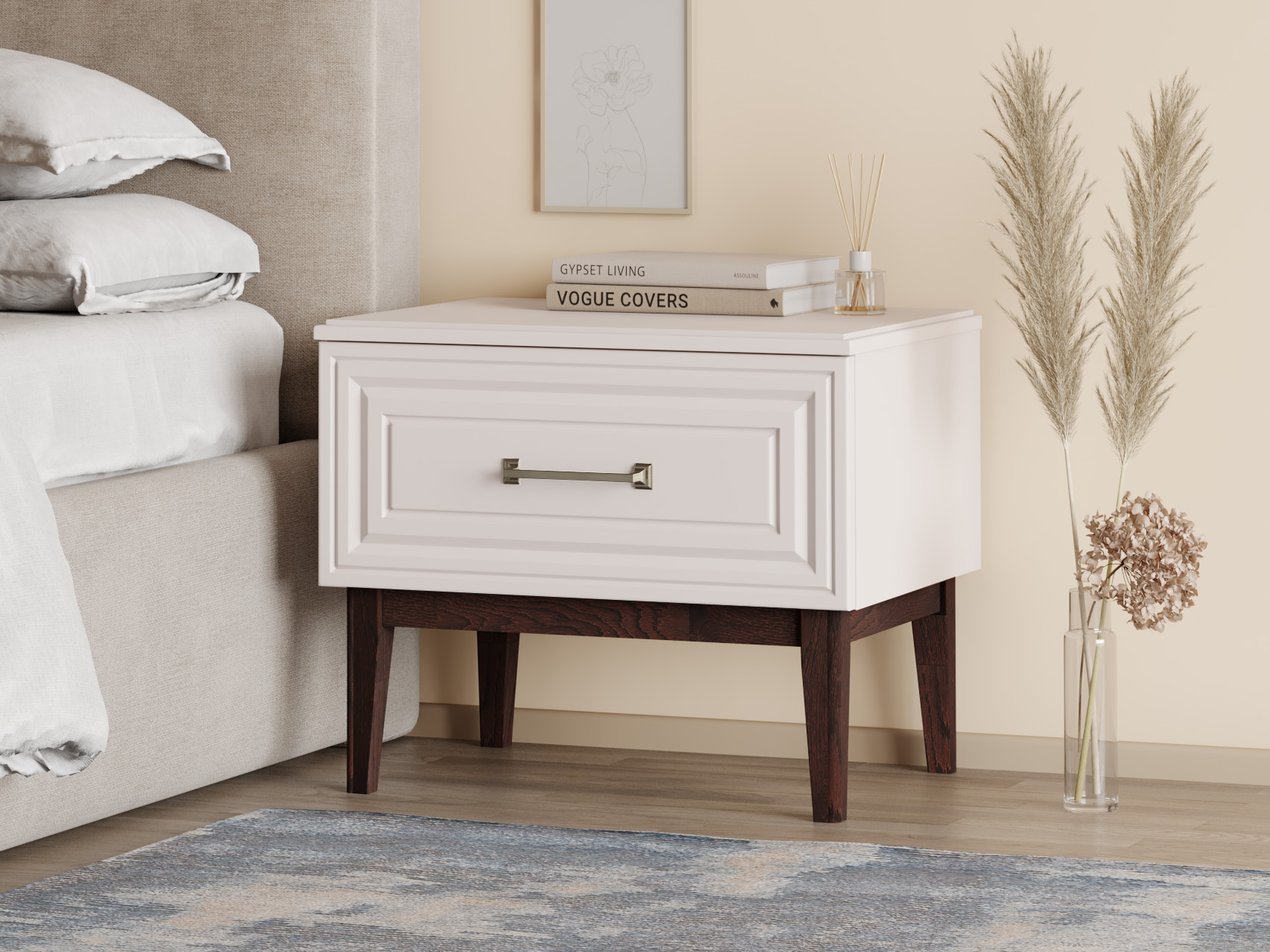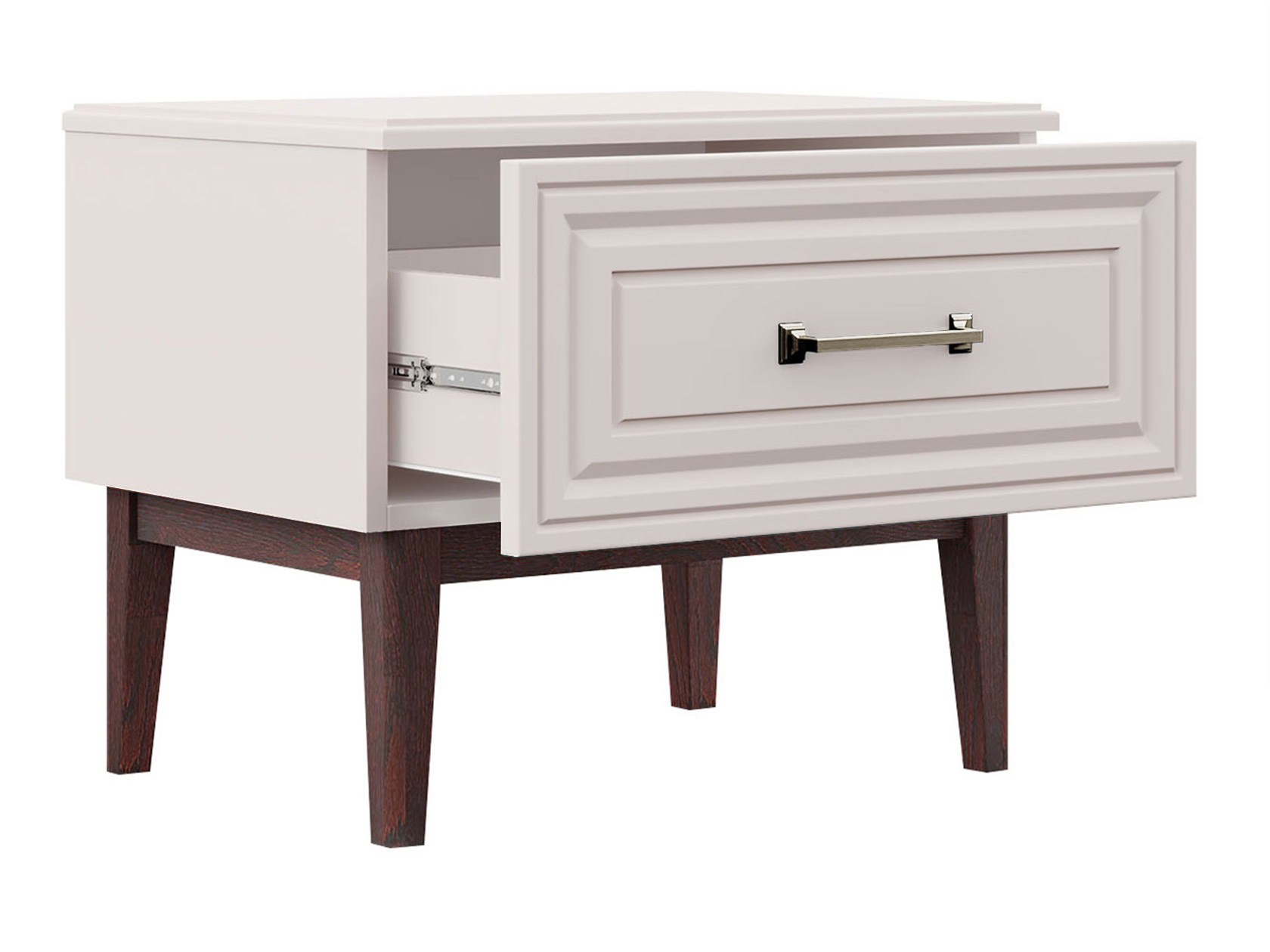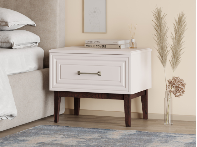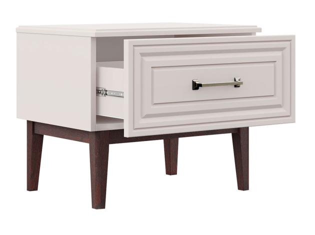 Прикроватная тумба Эвора отличается элегантным дизайном и удобством эксплуатации. В ящике можно хранить зарядку для телефона, очки и другие личные вещи. На поверхности удобно разместить будильник или ночник. Фрезеровка на фасаде придает модели особый шарм, делая ее стильным акцентом интерьера.
