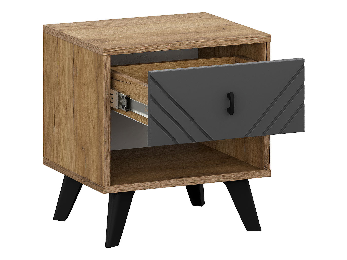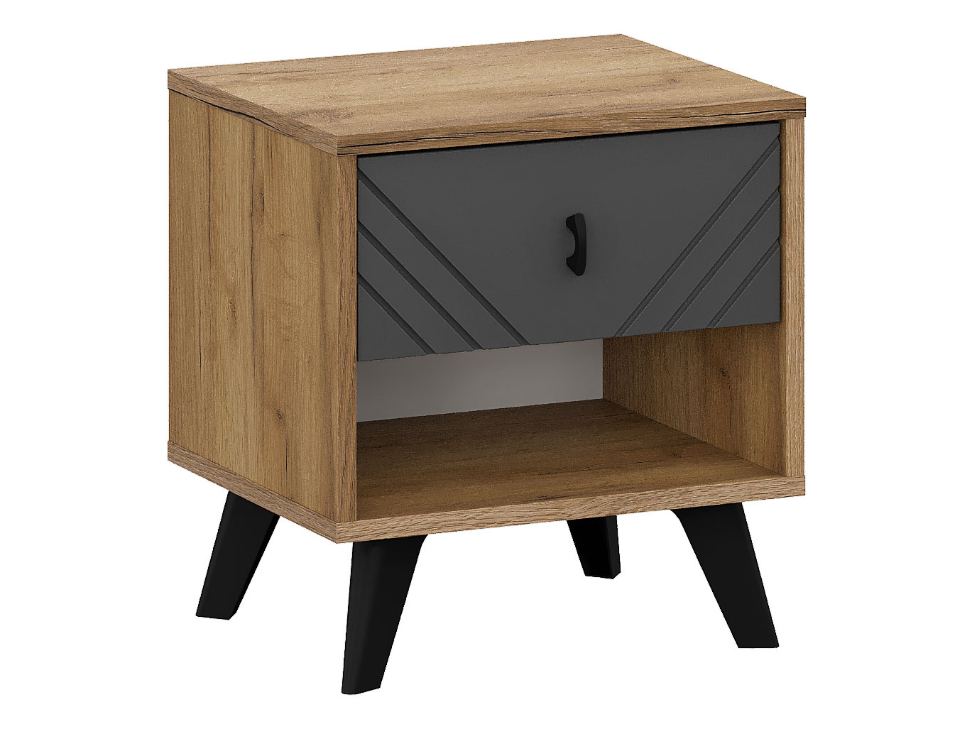Прикроватная тумба Кайло сделает обстановку комфортнее и практичнее. В небольшом выдвижном ящике и открытой нише удобно хранить личные вещи, которые могут потребоваться перед сном или после пробуждения. Контрастные текстуры и фрезеровка на фасаде придают модели особый шарм. Благодаря высоким ножкам, расположенным под углом, под основанием тумбы легко проезжает робот-пылесос.