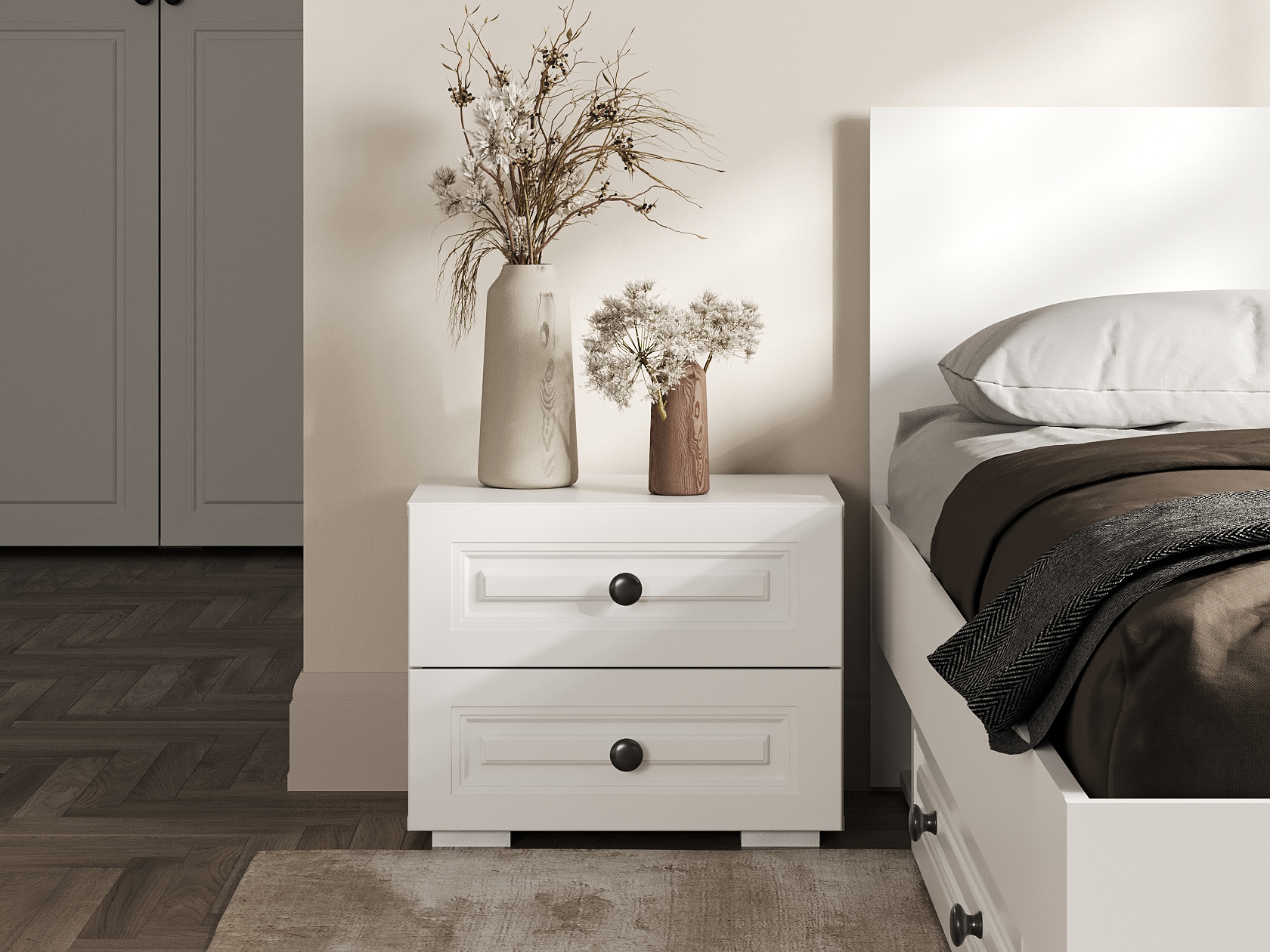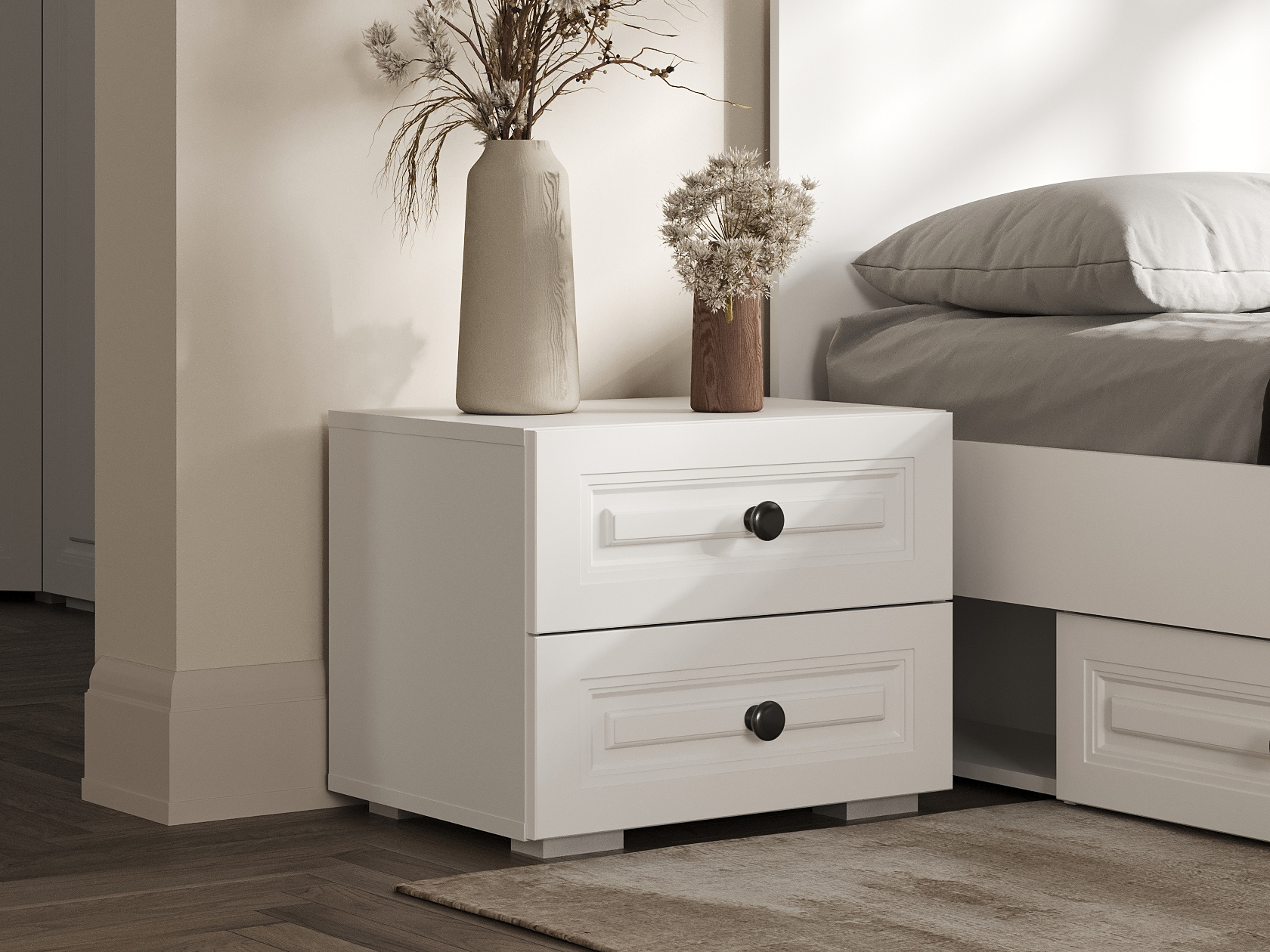 Прикроватная тумба Северина — небольшой, но очень важный предмет мебели для комфорта в спальне. Компактные выдвижные ящики позволяют держать под рукой личный вещи, которые часто нужны перед сном. На столешницу удобно поставить графин с водой, ночник или настольную лампу.