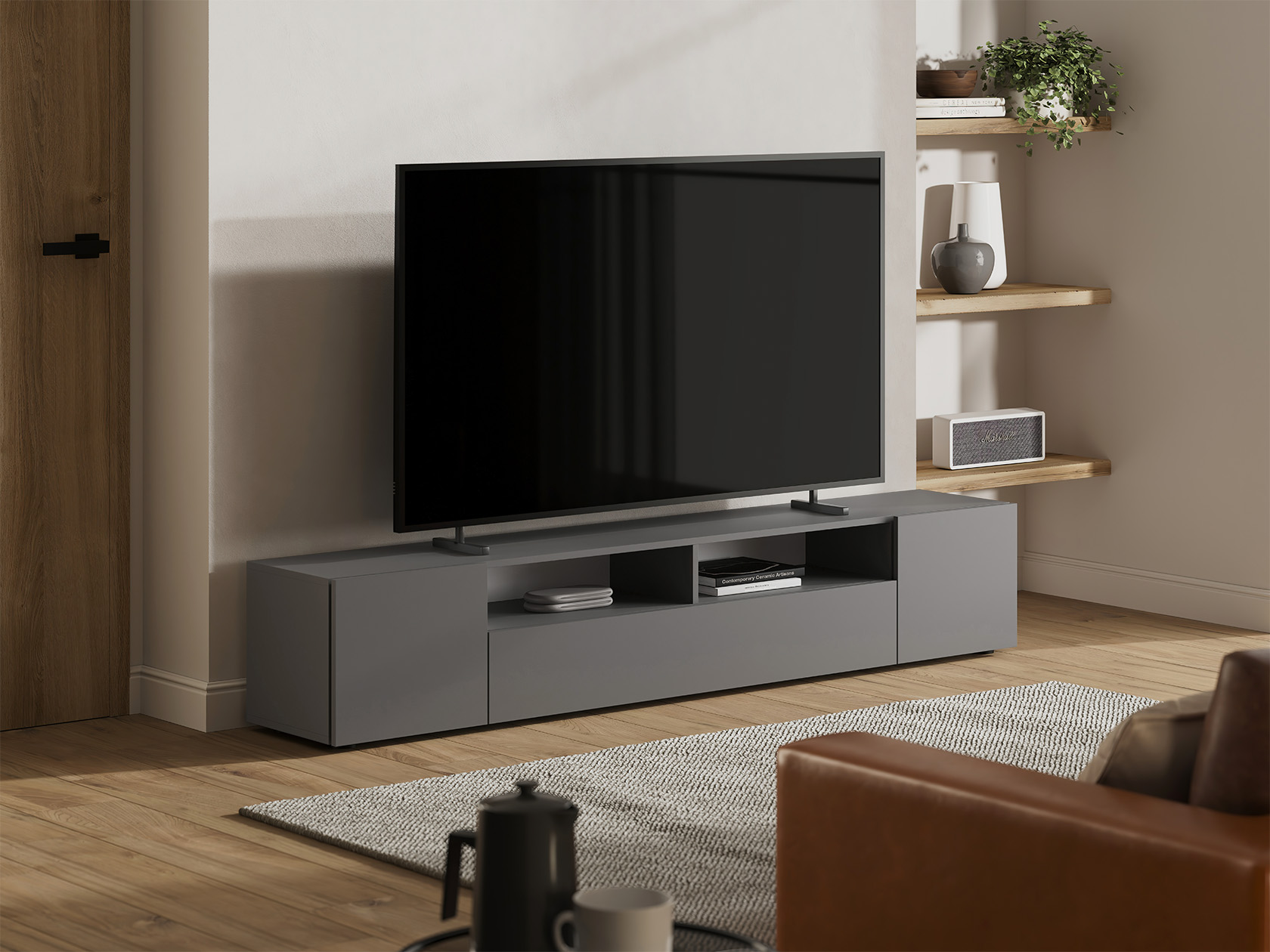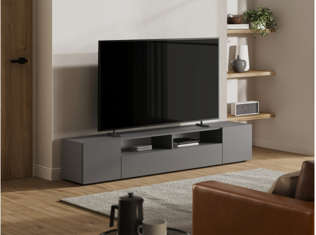 ТВ-тумба Диксон — универсальная модель, которая будет к месту в любой комнате. Широкая поверхность позволит расположить широкоформатный телевизор, а разноплановые отделения подойдут для хранения аксессуаров, гаджетов и аппаратуры.
