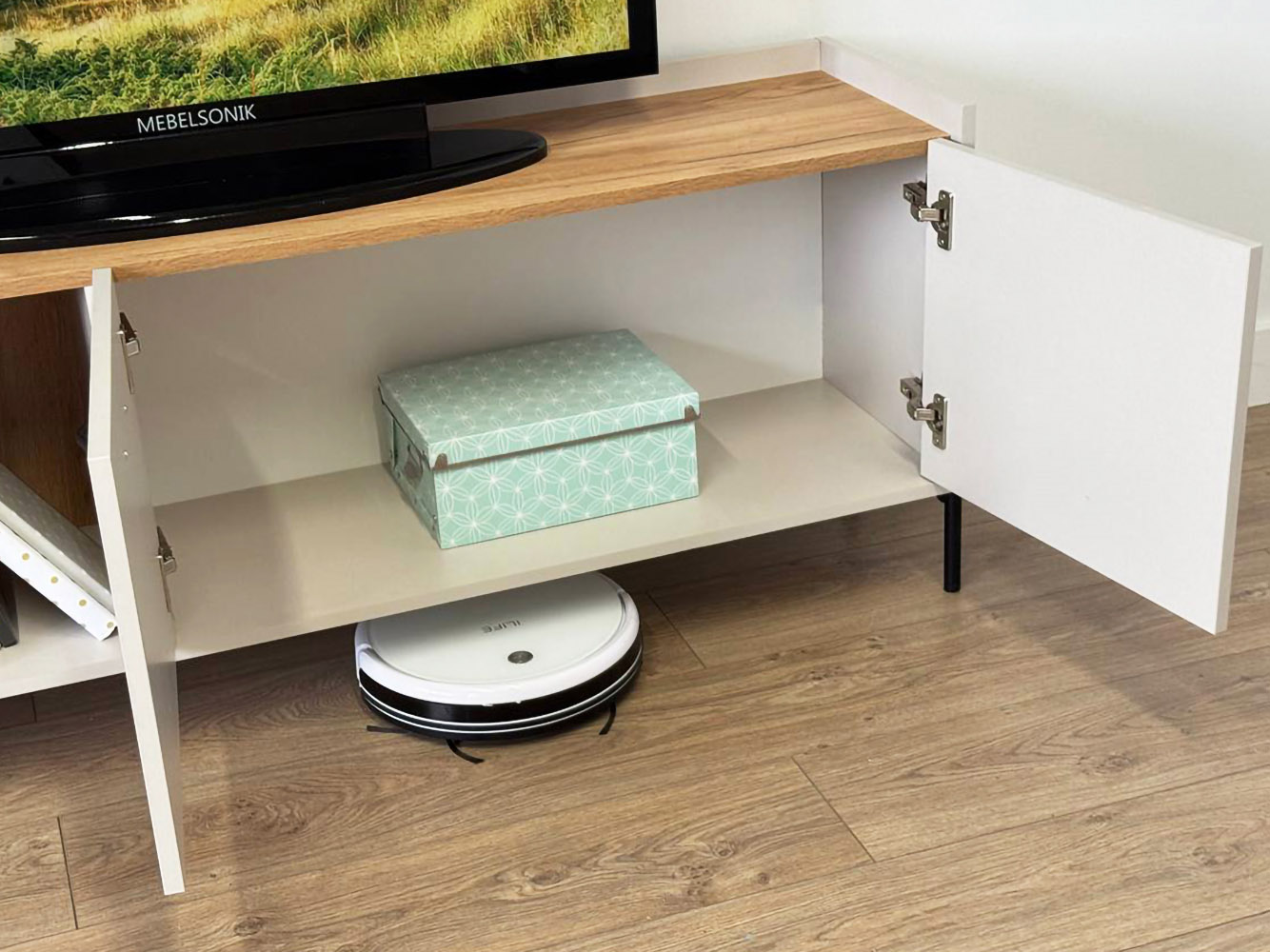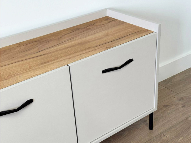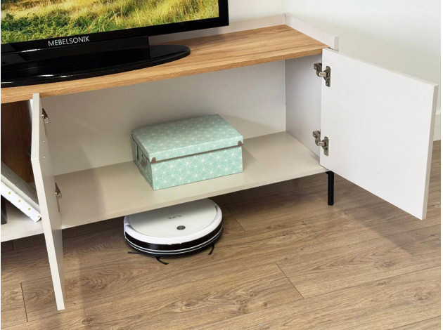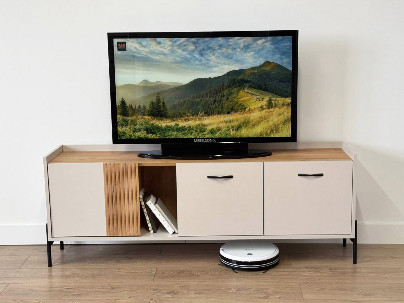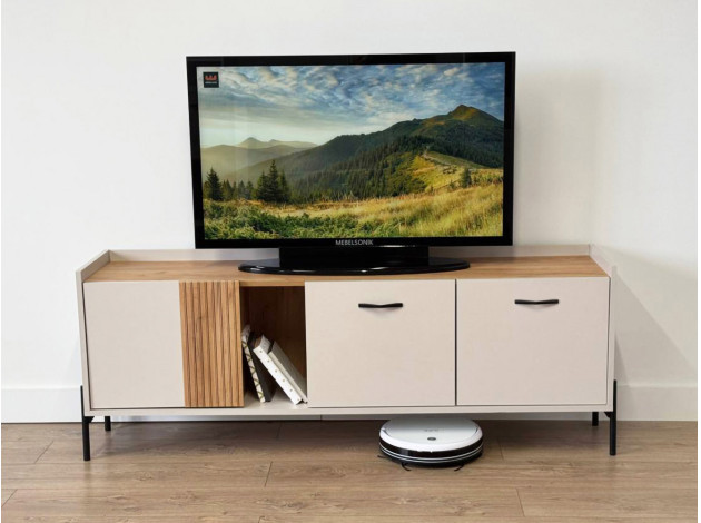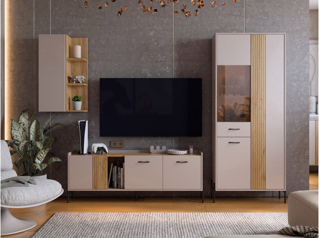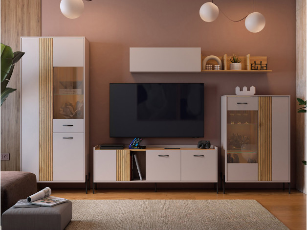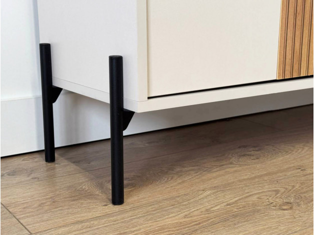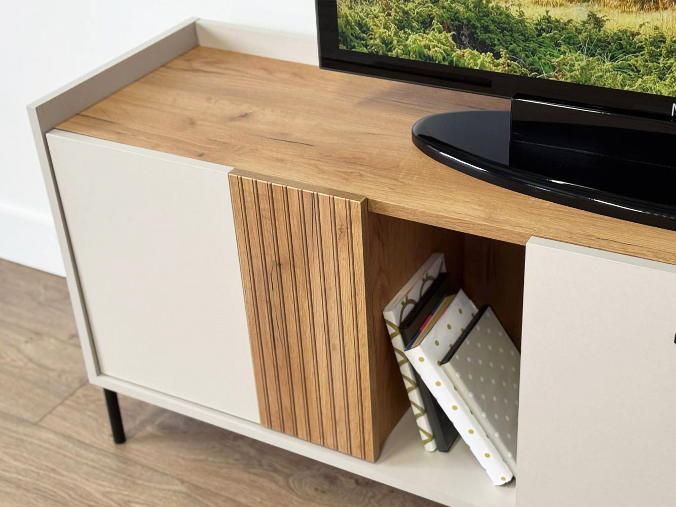 ТВ-тумба Доминика Макси — компактная модель с оригинальным дизайном. Контрастные детали и вертикальный декор превращают мебель в акцентный элемент интерьера. В открытой нише удобно хранить сопутствующую технику и аксессуары, а за дверцами — спрятать разные мелочи и предметы обихода.