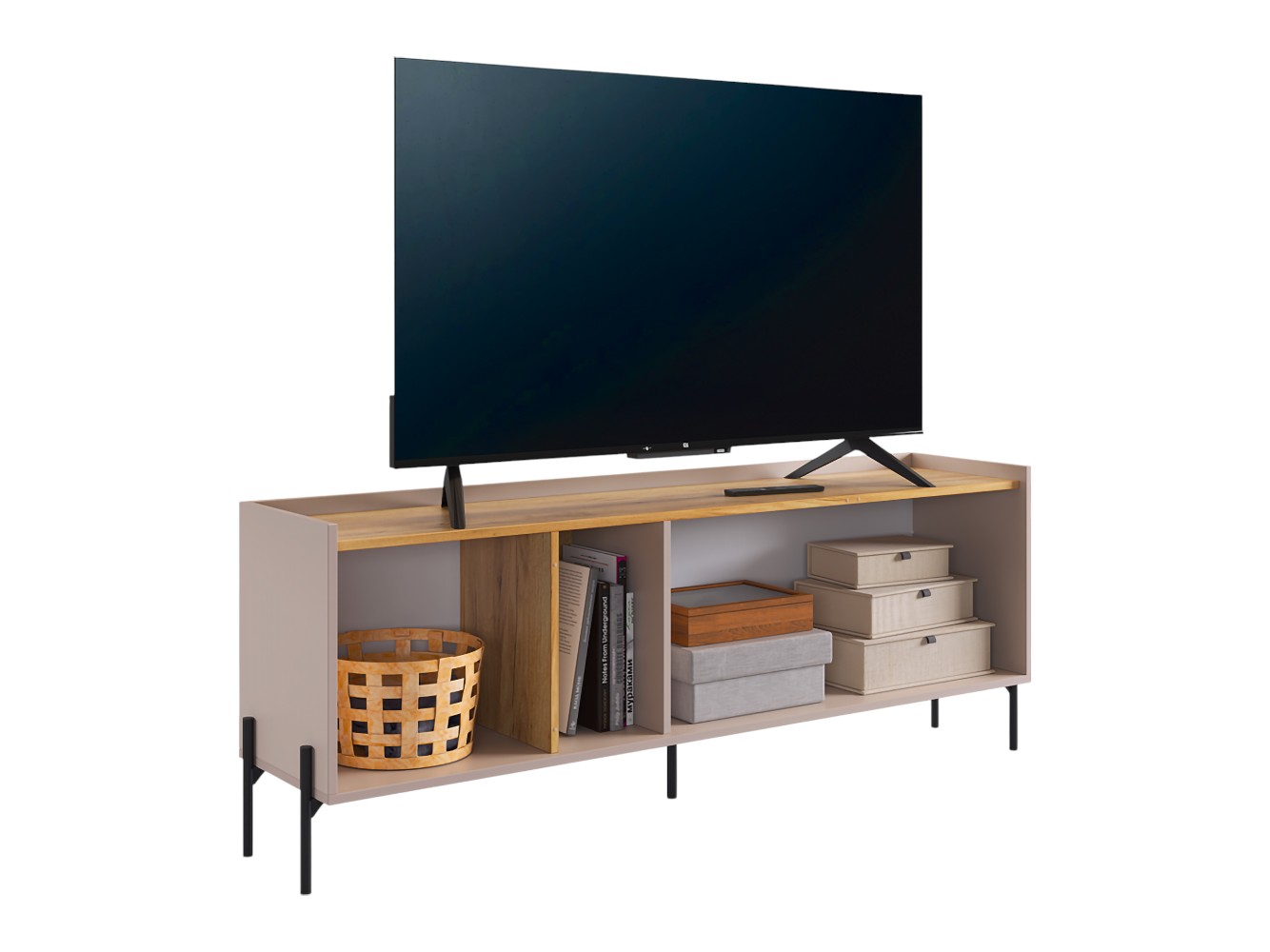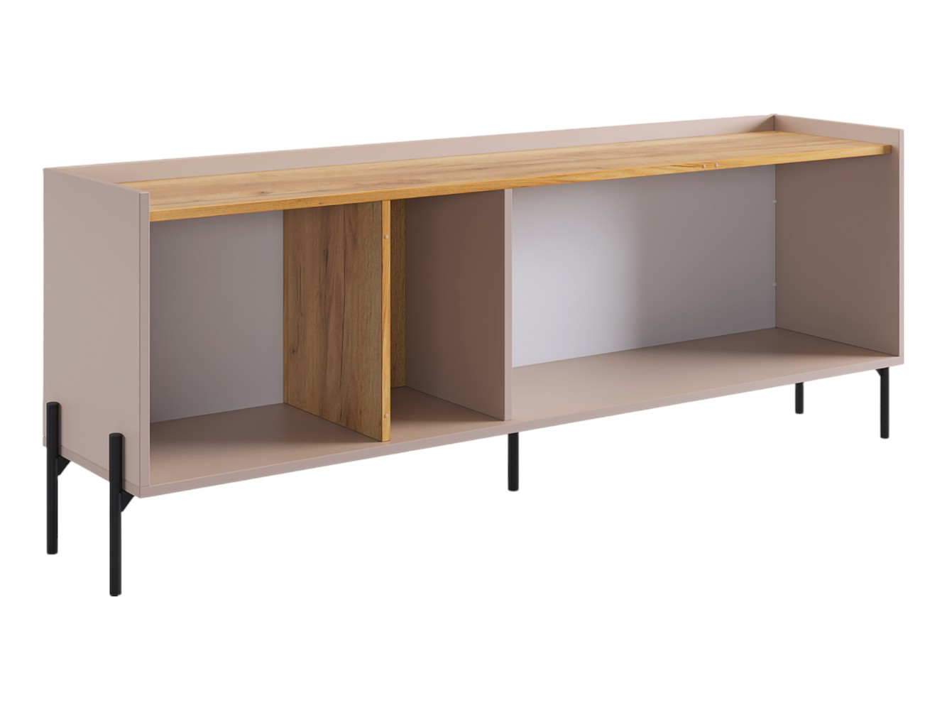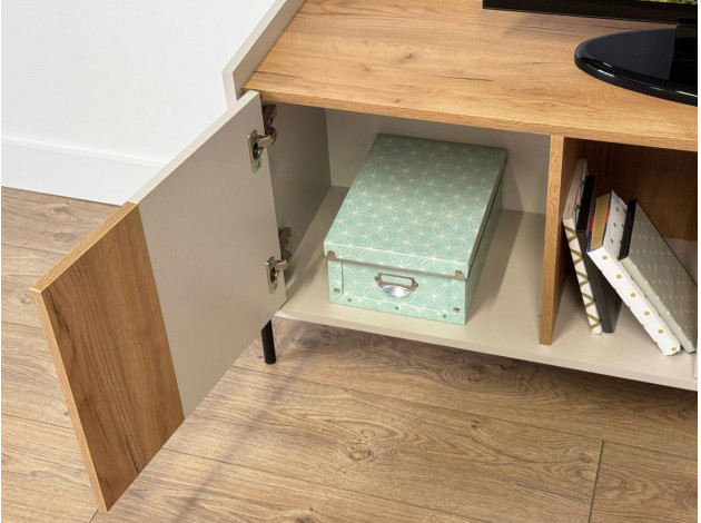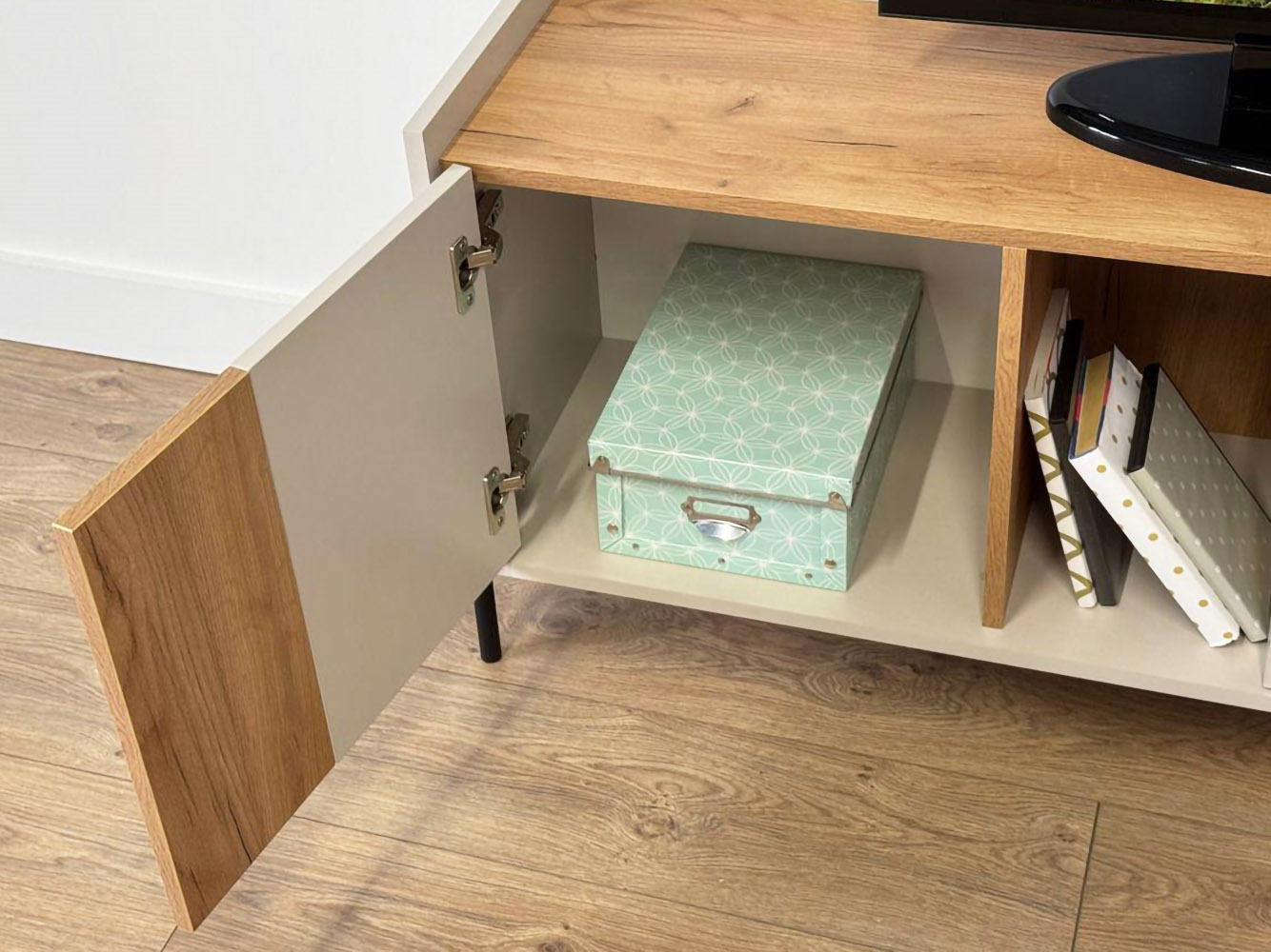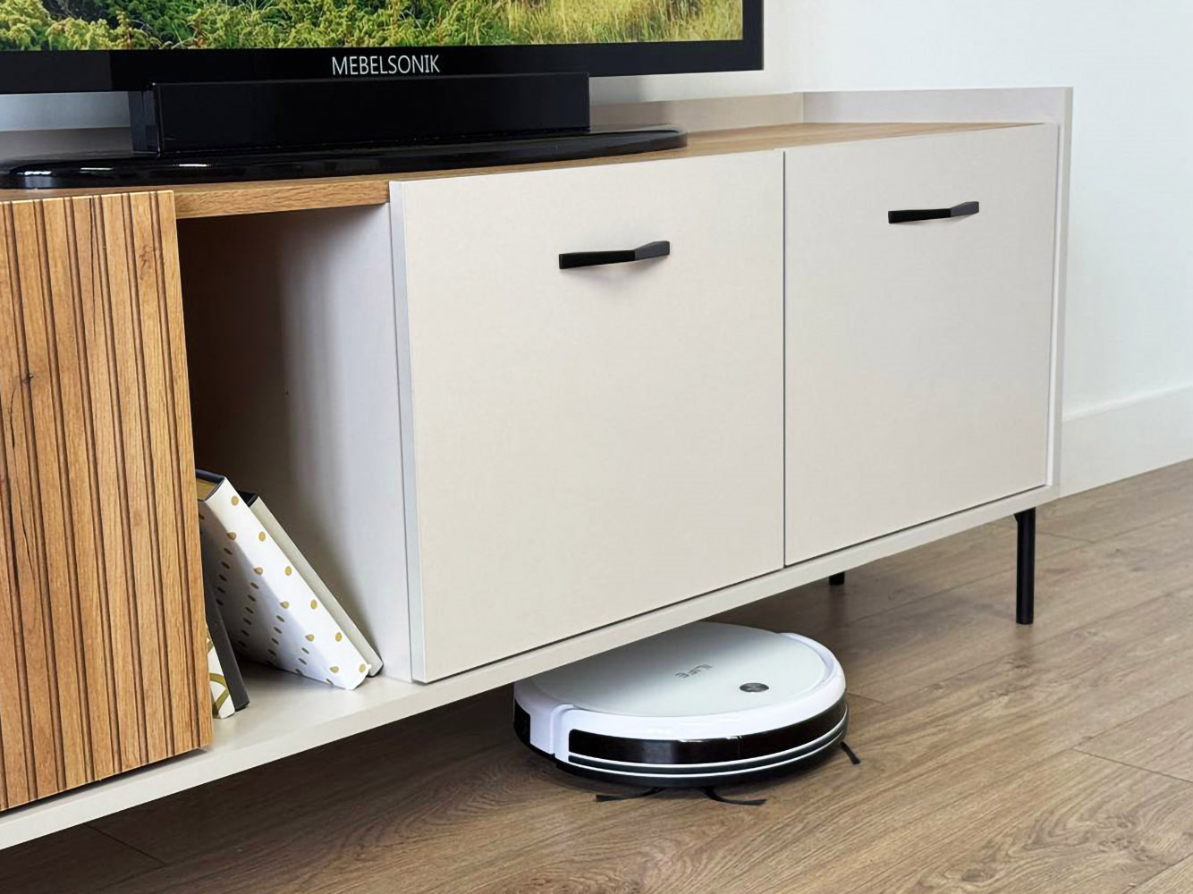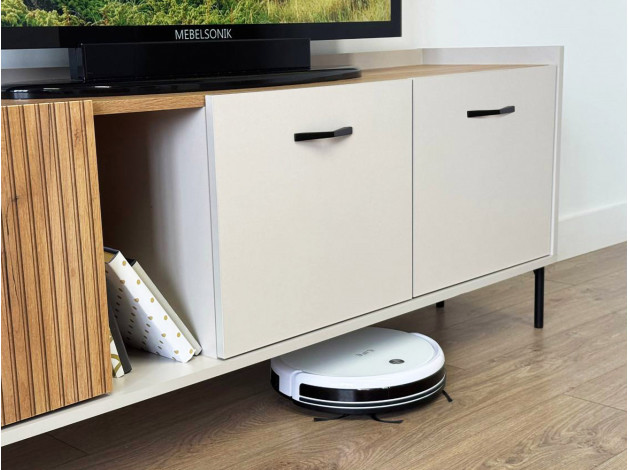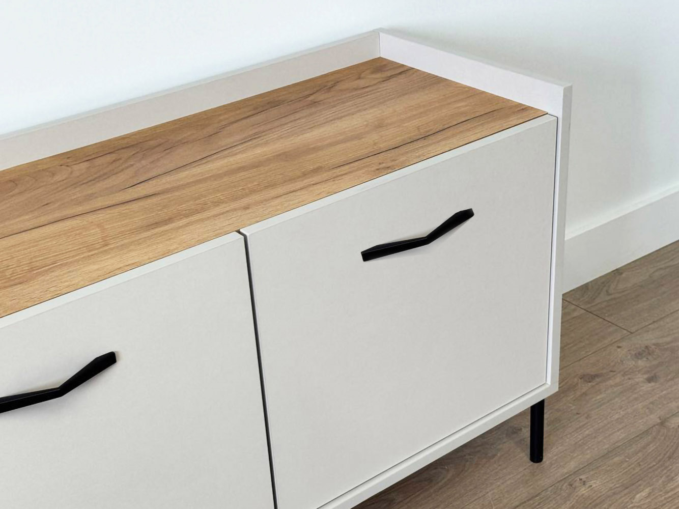 ТВ-тумба Доминика Макси — компактная модель с оригинальным дизайном. Контрастные детали и вертикальный декор превращают мебель в акцентный элемент интерьера. В открытой нише удобно хранить сопутствующую технику и аксессуары, а за дверцами — спрятать разные мелочи и предметы обихода.