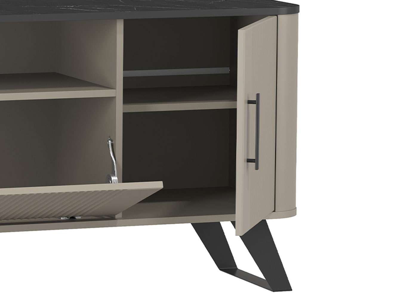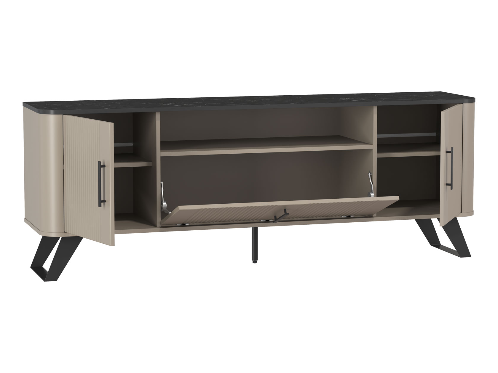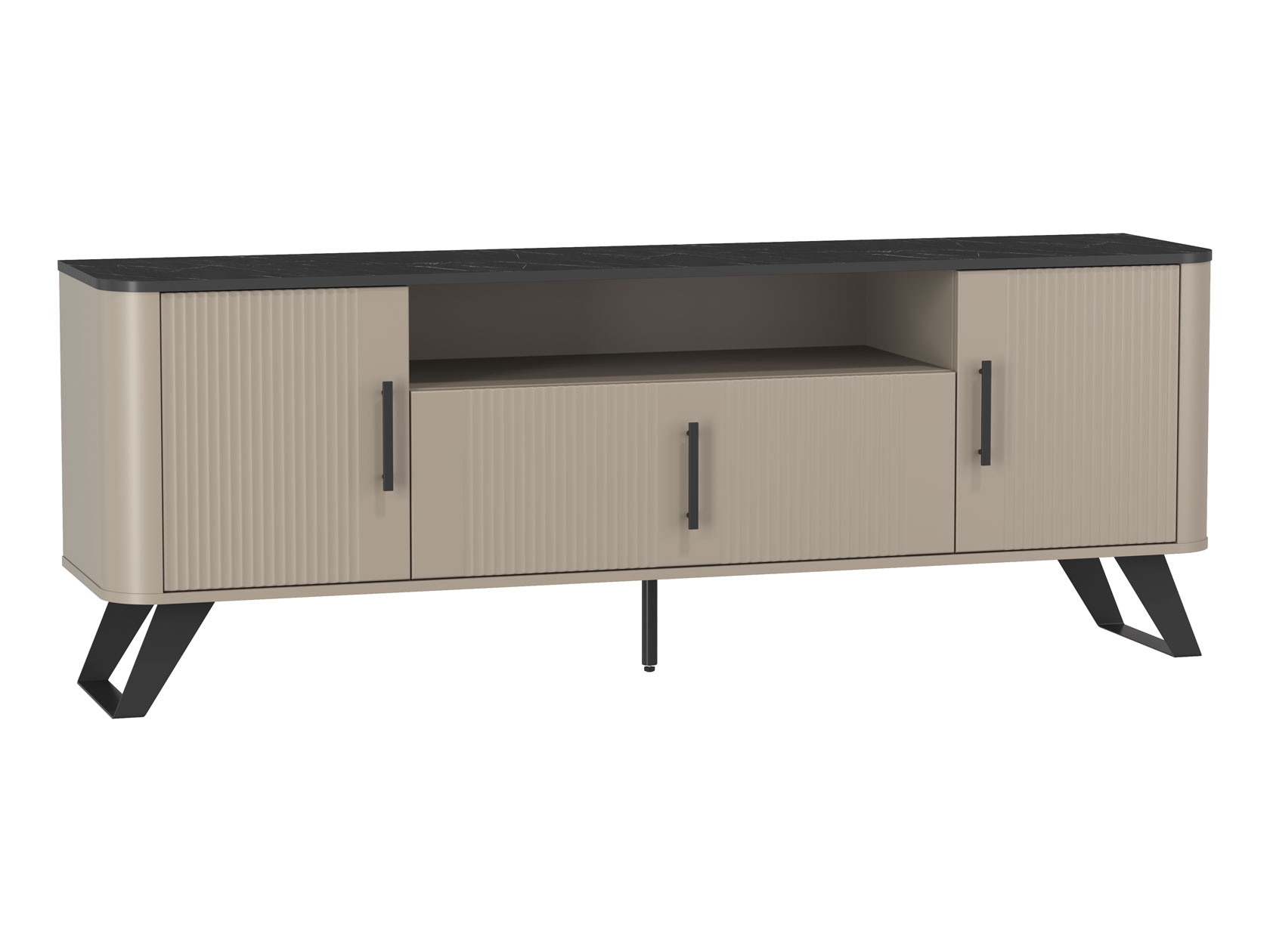 ТВ-тумба Фиделия станет незаменимым элементом любой комнаты, позволяя установить на поверхности телевизор с широкой диагональю, а за распашными дверцами и в открытой нише — найти место для книг, пультов и зарядок. Высокие ножки облегчают уборку: под ними легко пройдет робот-пылесос. Фрезеровка в виде вертикальных линий и ручки-скобы добавляют обстановке стильные акценты.