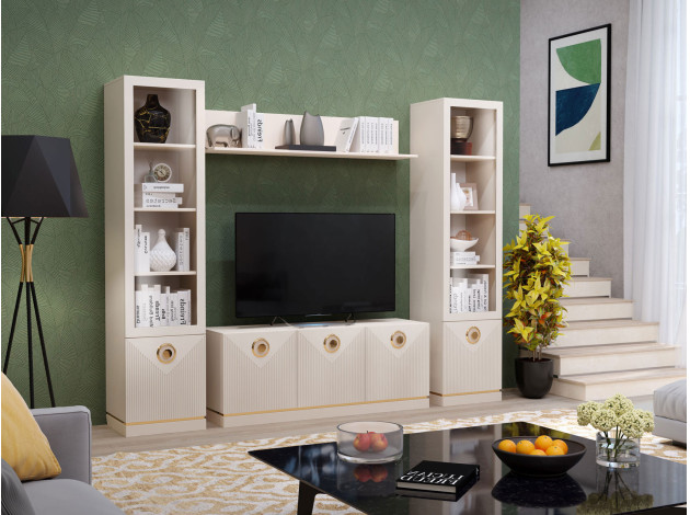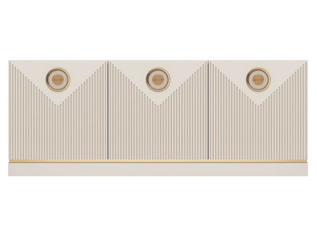 ТВ-тумба Капри станет ярким акцентом в интерьере гостиной, позволит разместить широкоформатный телевизор и дополнит систему хранения тремя отделениями за глухими дверцами. Модель выполнена в приятных кремовых оттенках, а фасады украшены декоративной фрезеровкой. Дверцы оснащены петлями с доводчиками, что поможет избежать хлопков и резкого закрывания.