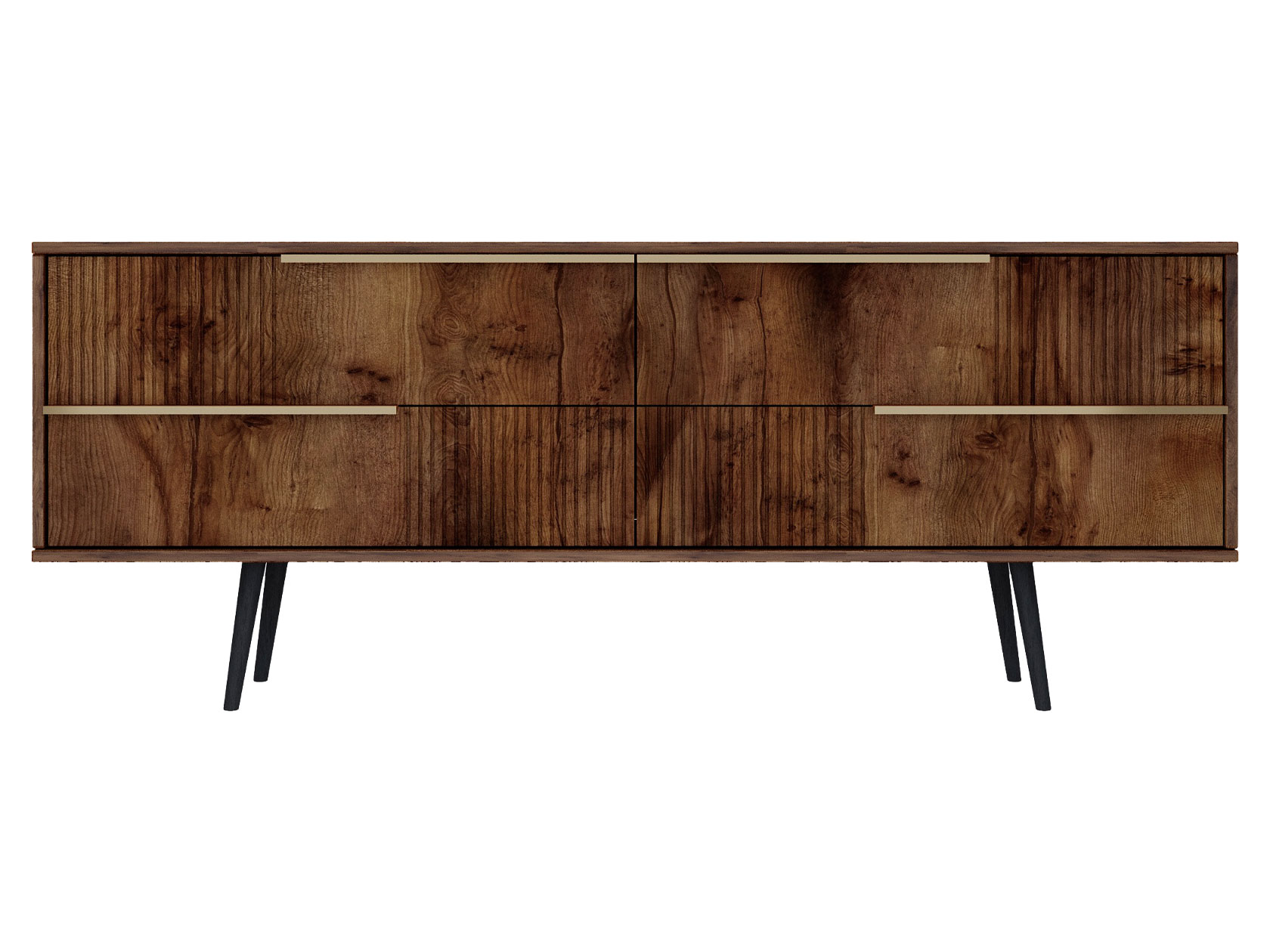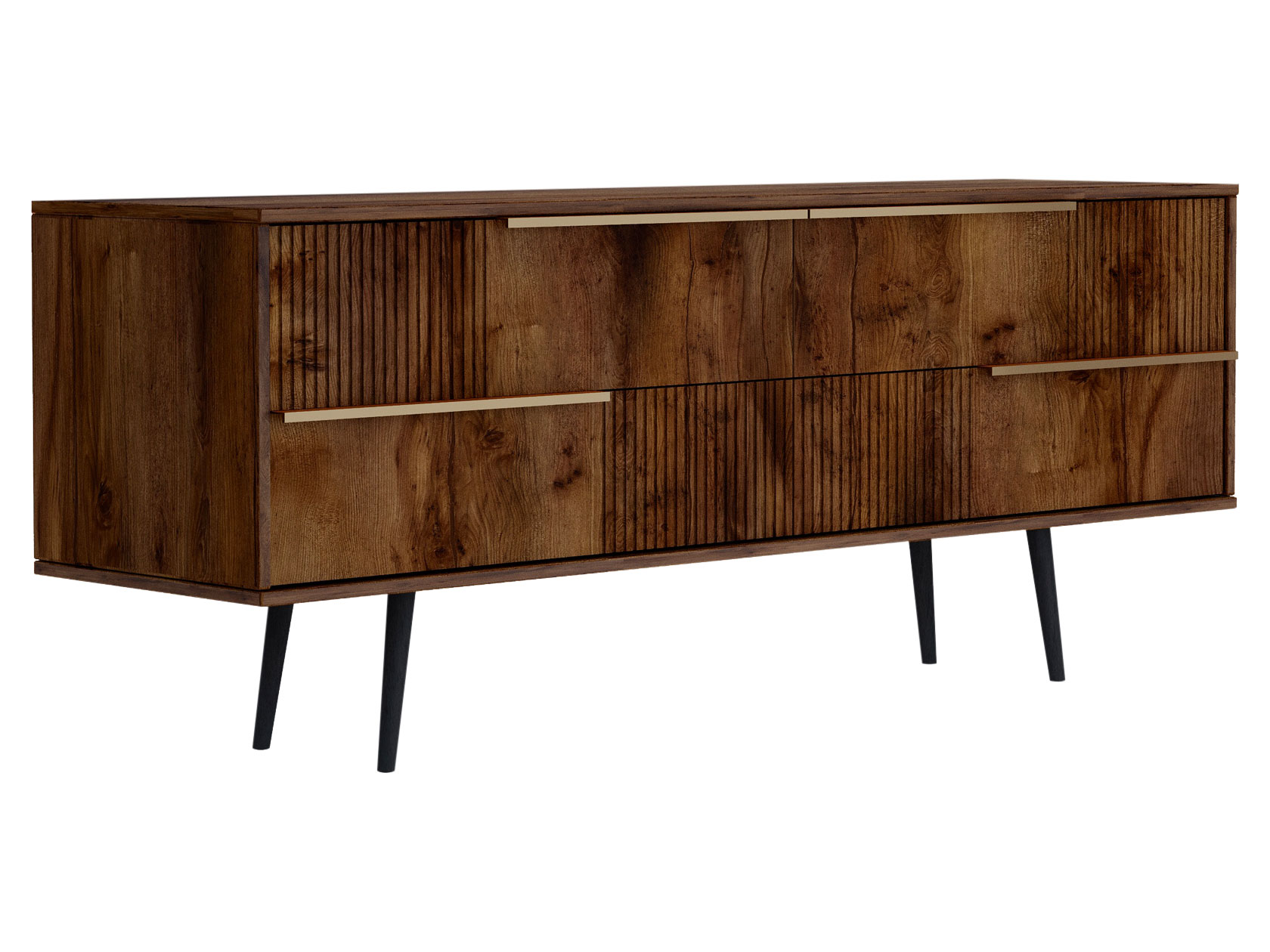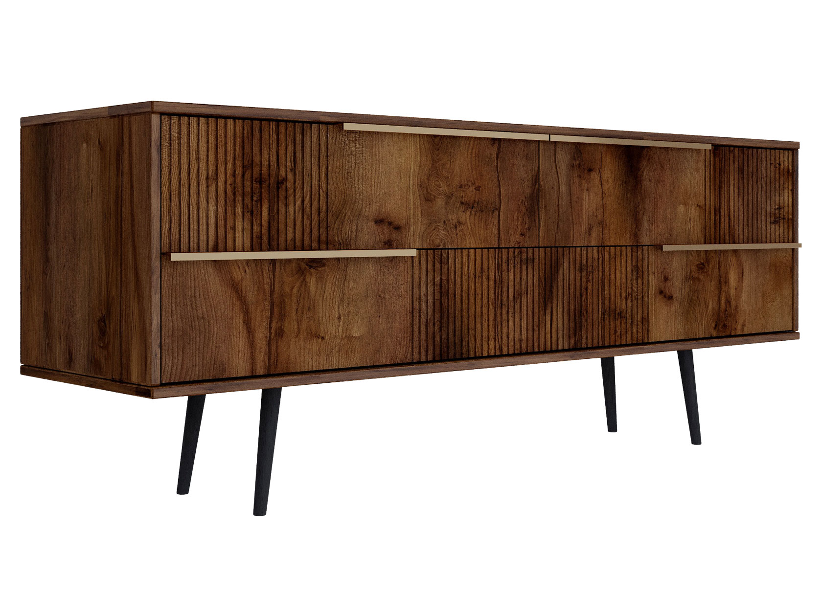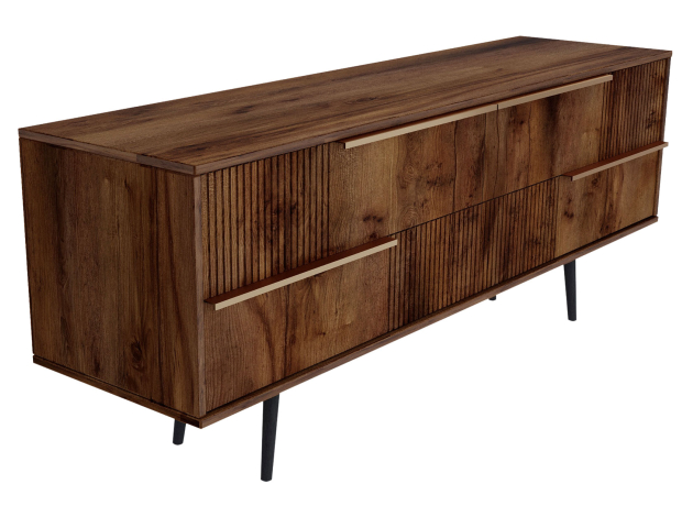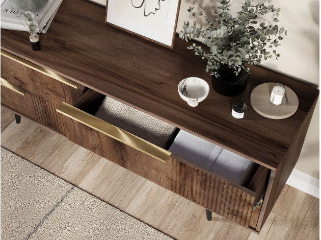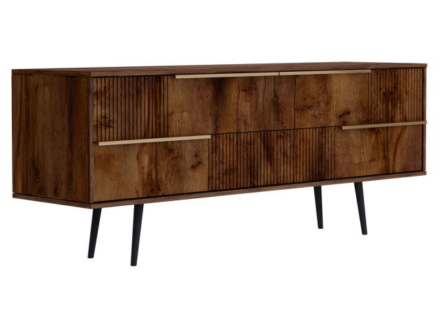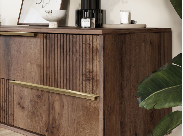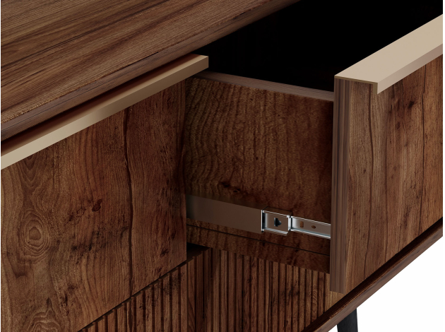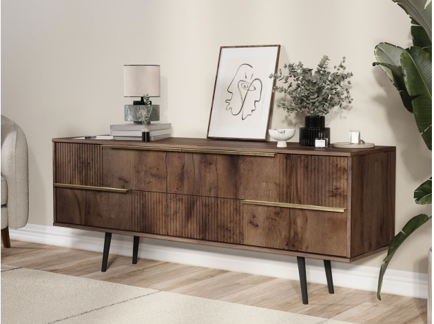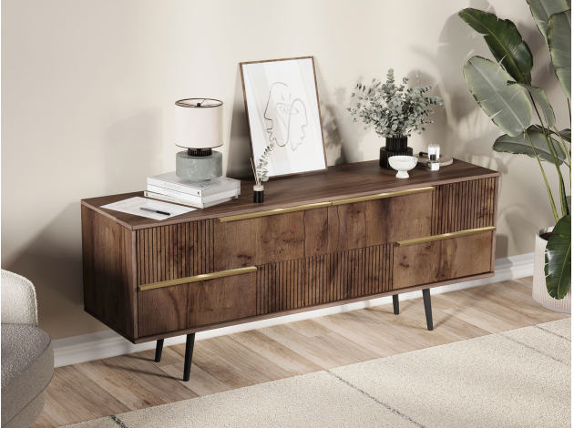 ТВ-тумба Луиджи добавит стильный акцент в оформление интерьера. Фрезеровка на фасадах и фурнитура золотого оттенка создают аристократичный облик модели. Вместительные ящики позволяют разместить внутри необходимые вещи: от предметов одежды до папок с документами. Наличие высоких ножек облегчает уборку под тумбой.