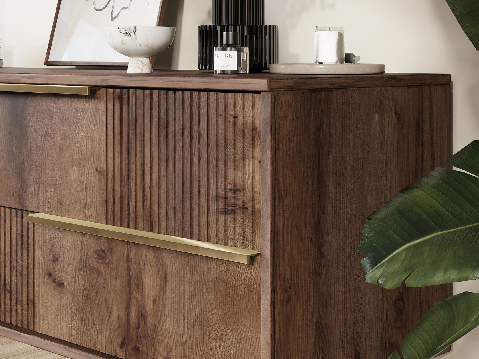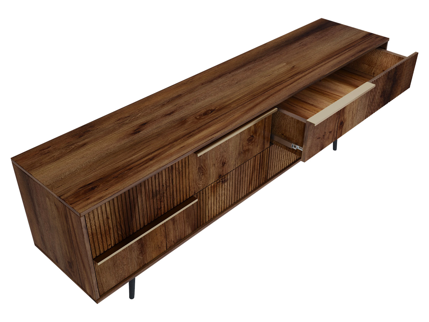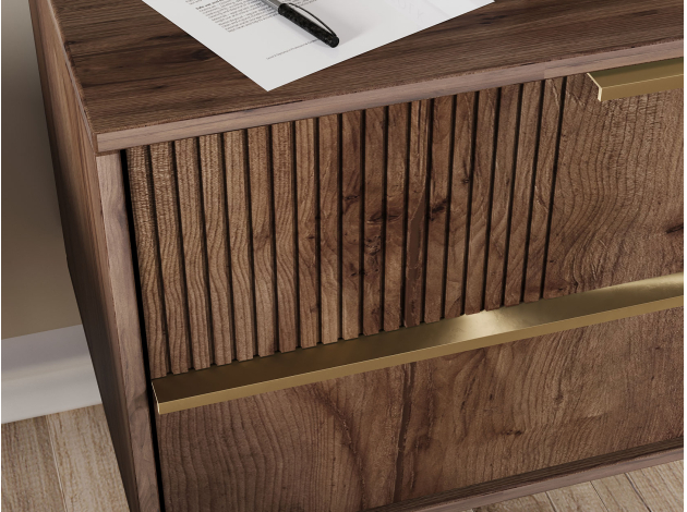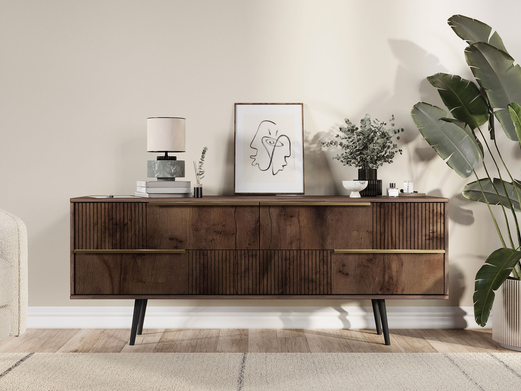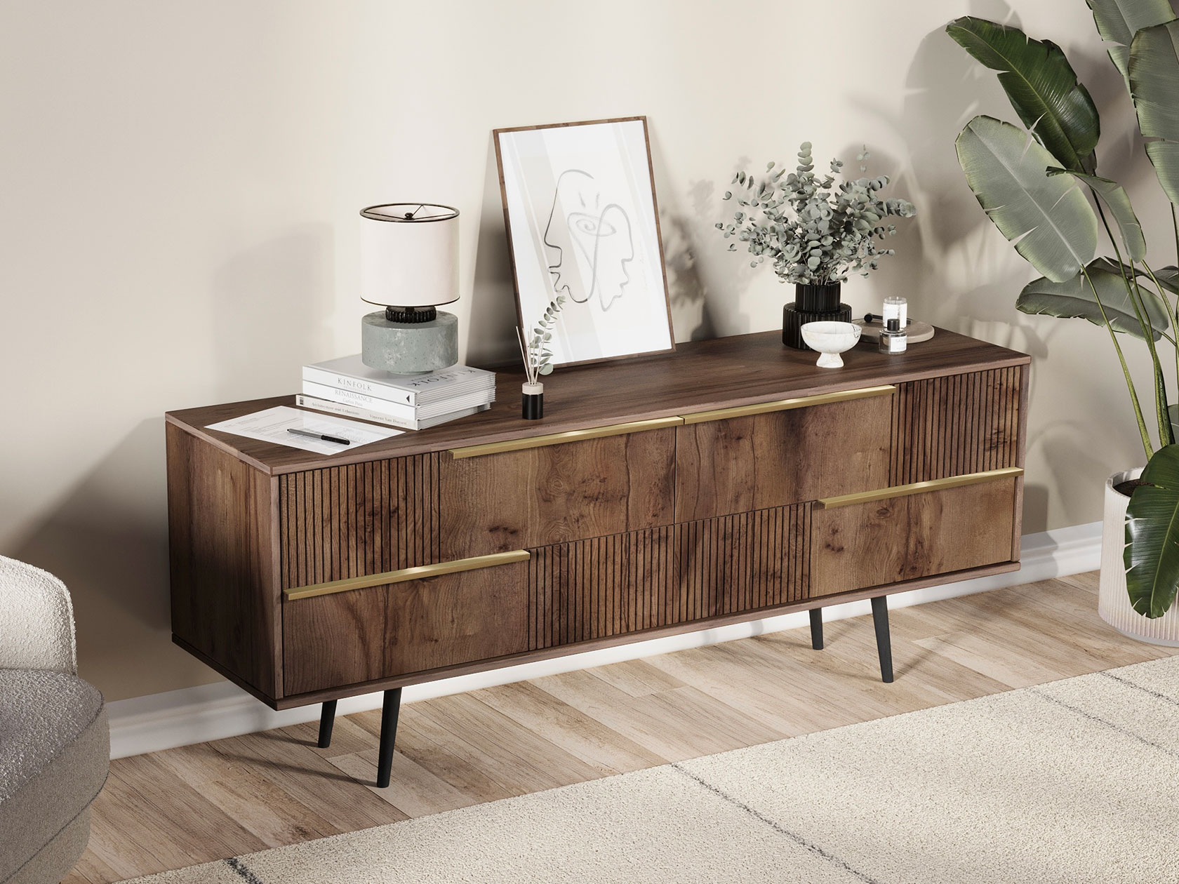 ТВ-тумба Луиджи добавит стильный акцент в оформление интерьера. Фрезеровка на фасадах и фурнитура золотого оттенка создают аристократичный облик модели. Вместительные ящики позволяют разместить внутри необходимые вещи: от предметов одежды до папок с документами. Наличие высоких ножек облегчает уборку под тумбой.
