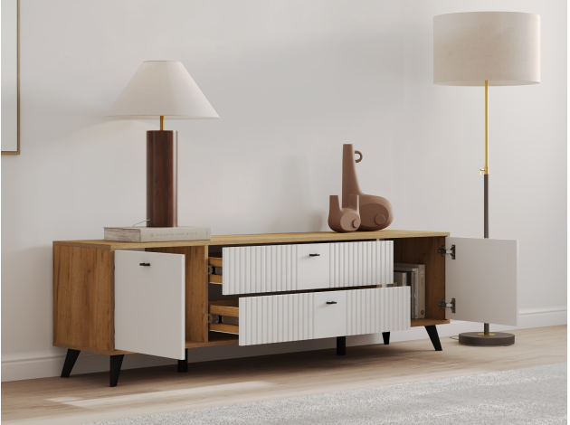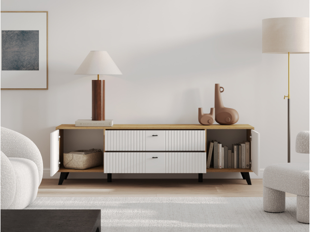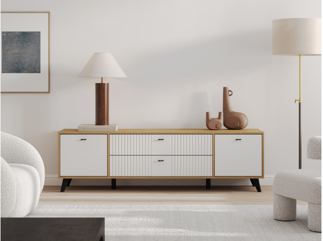• ТВ-тумба Милан с ящиками подойдет для размещения монитора с большой диагональю и других мультимедийных устройств. Разноплановые отделения помогут поддерживать порядок в комнате. Вертикальная фрезеровка по центру и мягкий древесный оттенок в сочетании с матовыми фасадами добавят обстановке уютный акцент. Небольшие ножки в ретро-стиле придают мебели визуальную легкость.