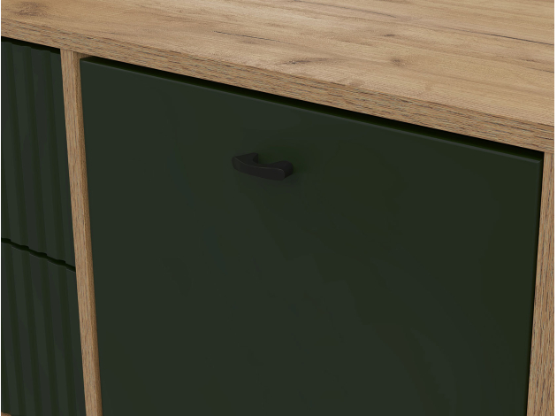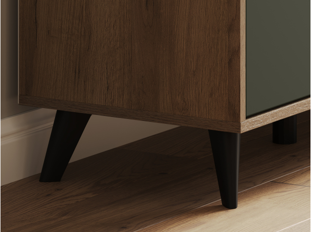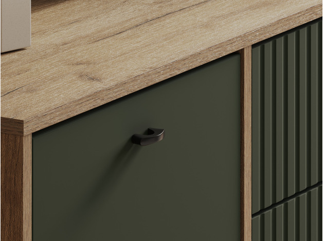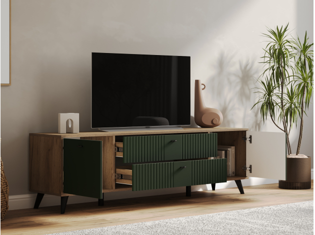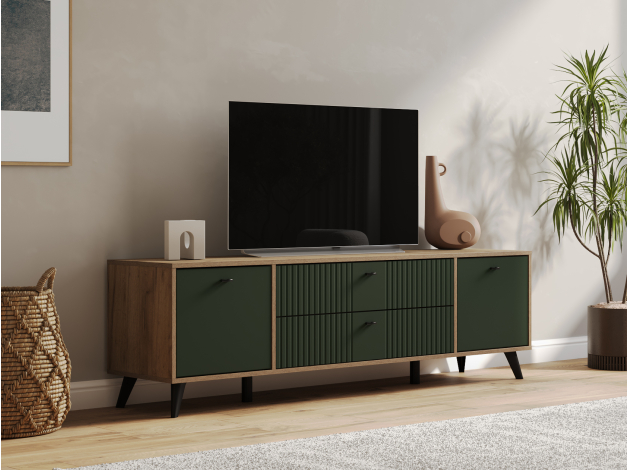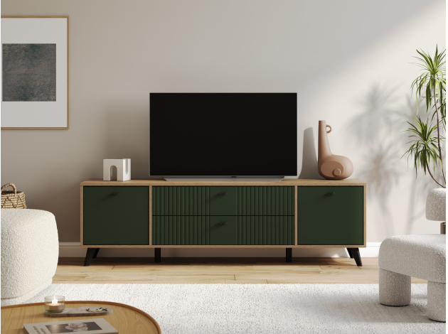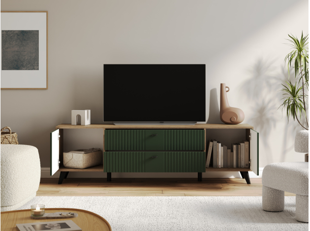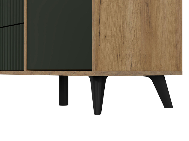 ТВ-тумба Милан с ящиками подойдет для размещения монитора с большой диагональю и других мультимедийных устройств. Разноплановые отделения помогут поддерживать порядок в комнате. Вертикальная фрезеровка по центру и мягкий древесный оттенок в сочетании с матовыми фасадами добавят обстановке уютный акцент. Небольшие ножки в ретро-стиле придают мебели визуальную легкость.