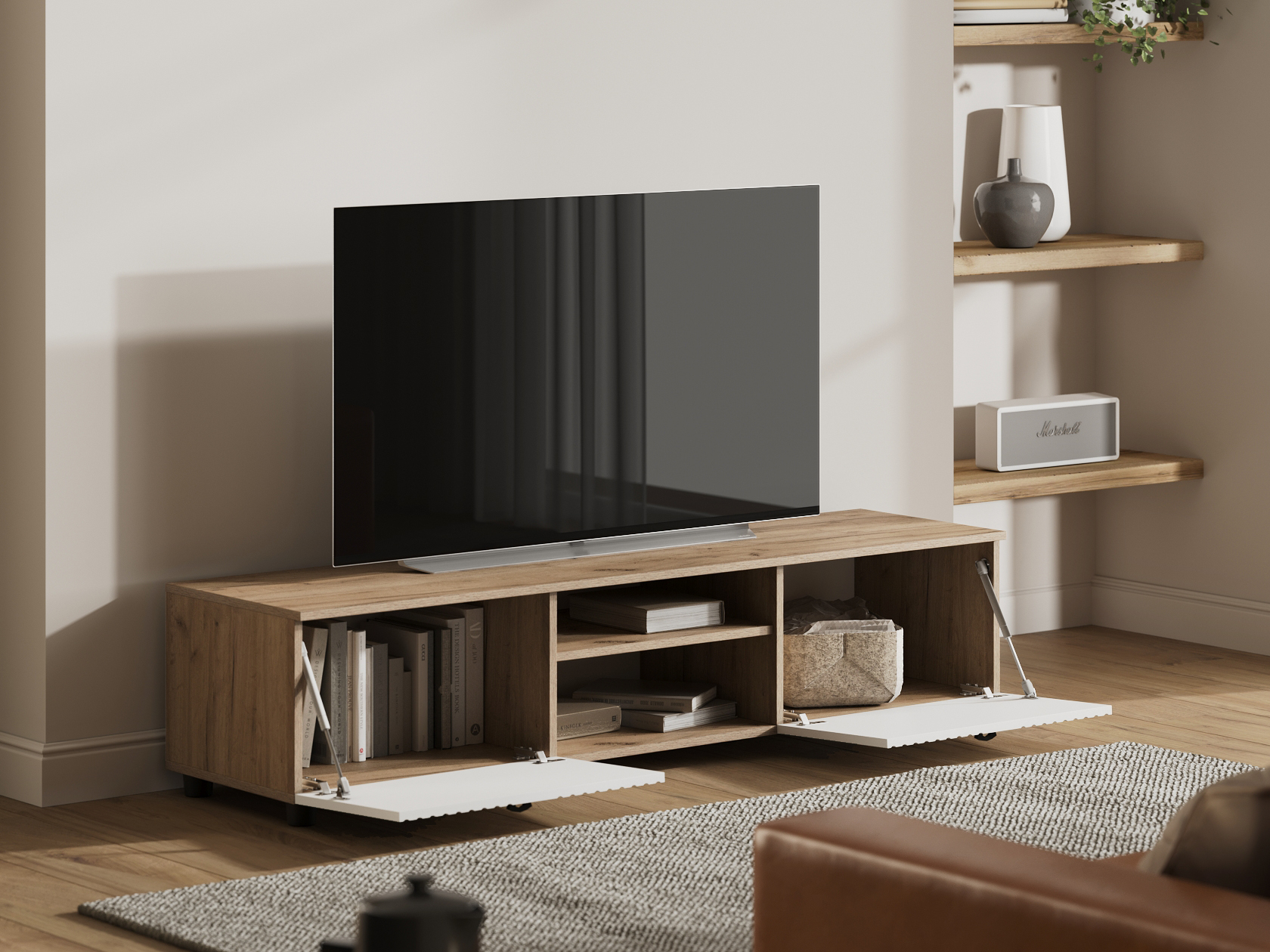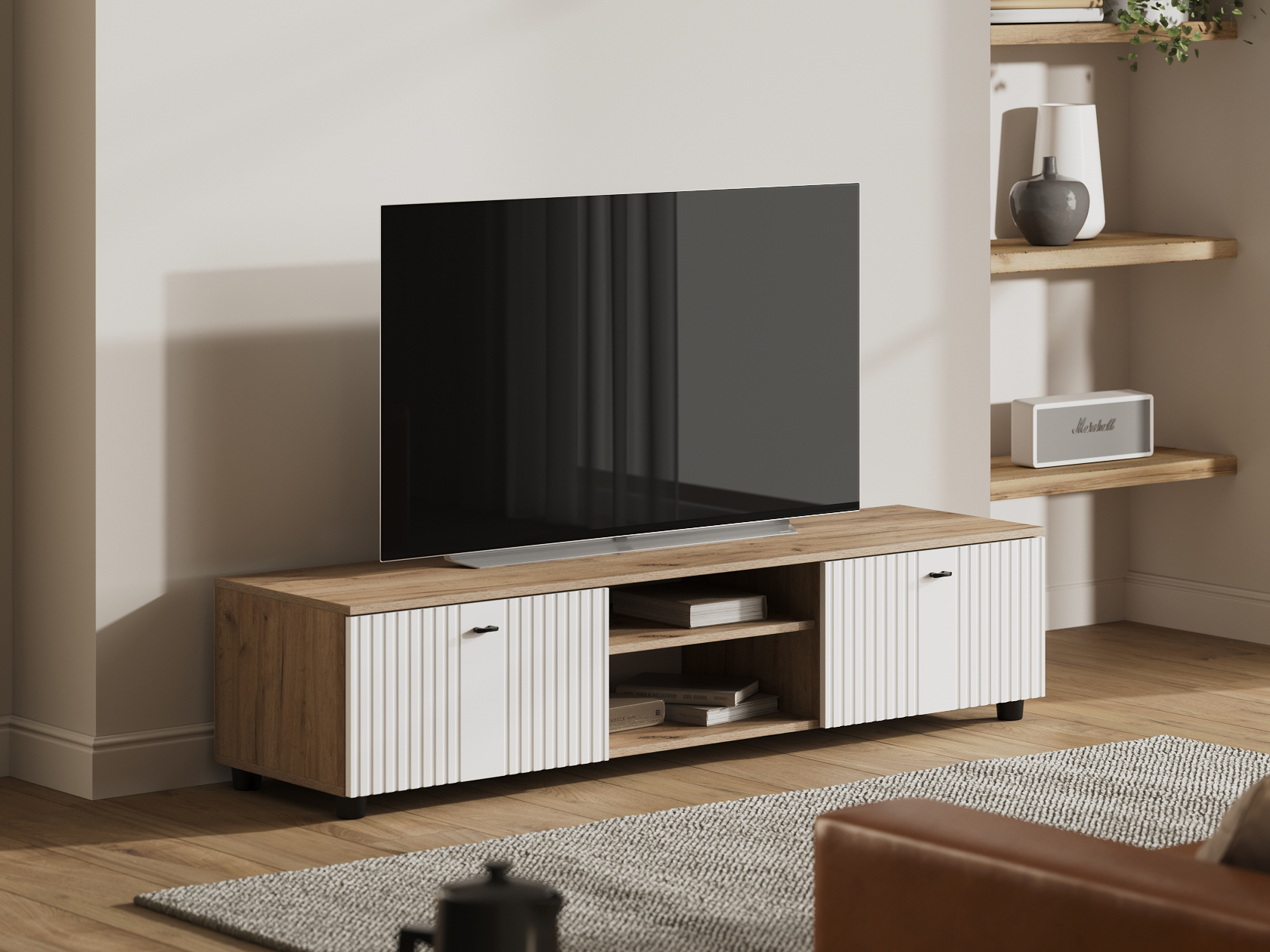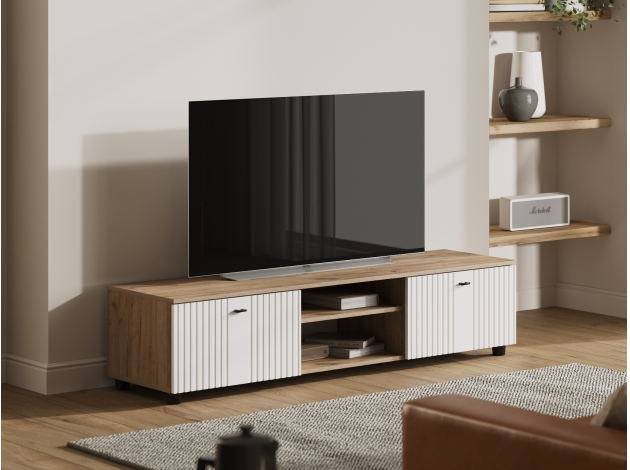 ТВ-тумба Милан позволит разместить телевизор любой диагонали, а две открытые ниши под столешницей подойдут для сопутствующей видеотехники. Система хранения представлена двумя вместительными отделениями за откидными дверцами для постельного белья, сложенной одежды и личных вещей. Фасады выполнены из качественного экологичного материала и украшены вертикальной фрезеровкой.