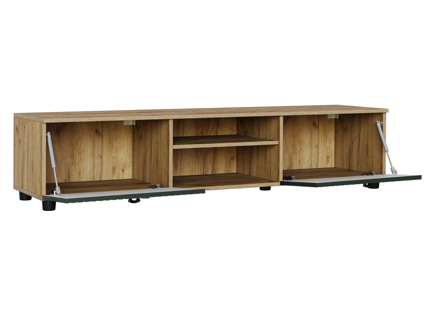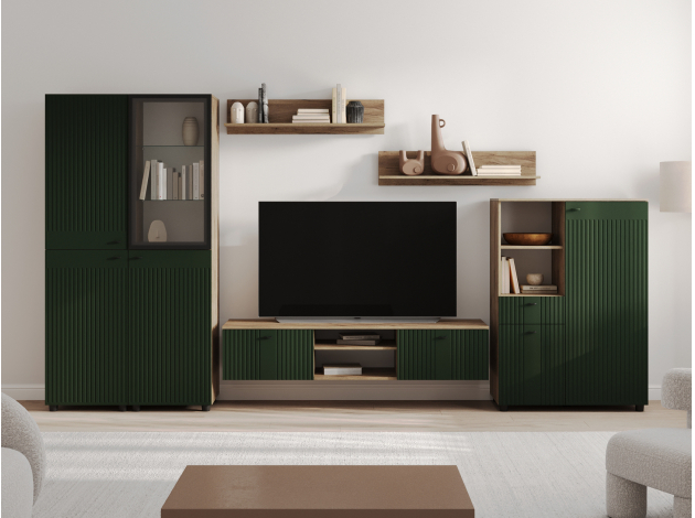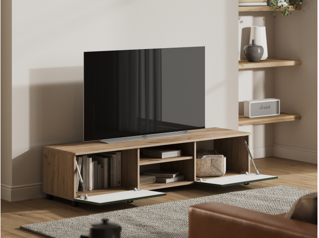 ТВ-тумба Милан позволит разместить телевизор любой диагонали, а две открытые ниши под столешницей подойдут для сопутствующей видеотехники. Система хранения представлена двумя вместительными отделениями за откидными дверцами для постельного белья, сложенной одежды и личных вещей. Фасады выполнены из качественного экологичного материала и украшены вертикальной фрезеровкой.