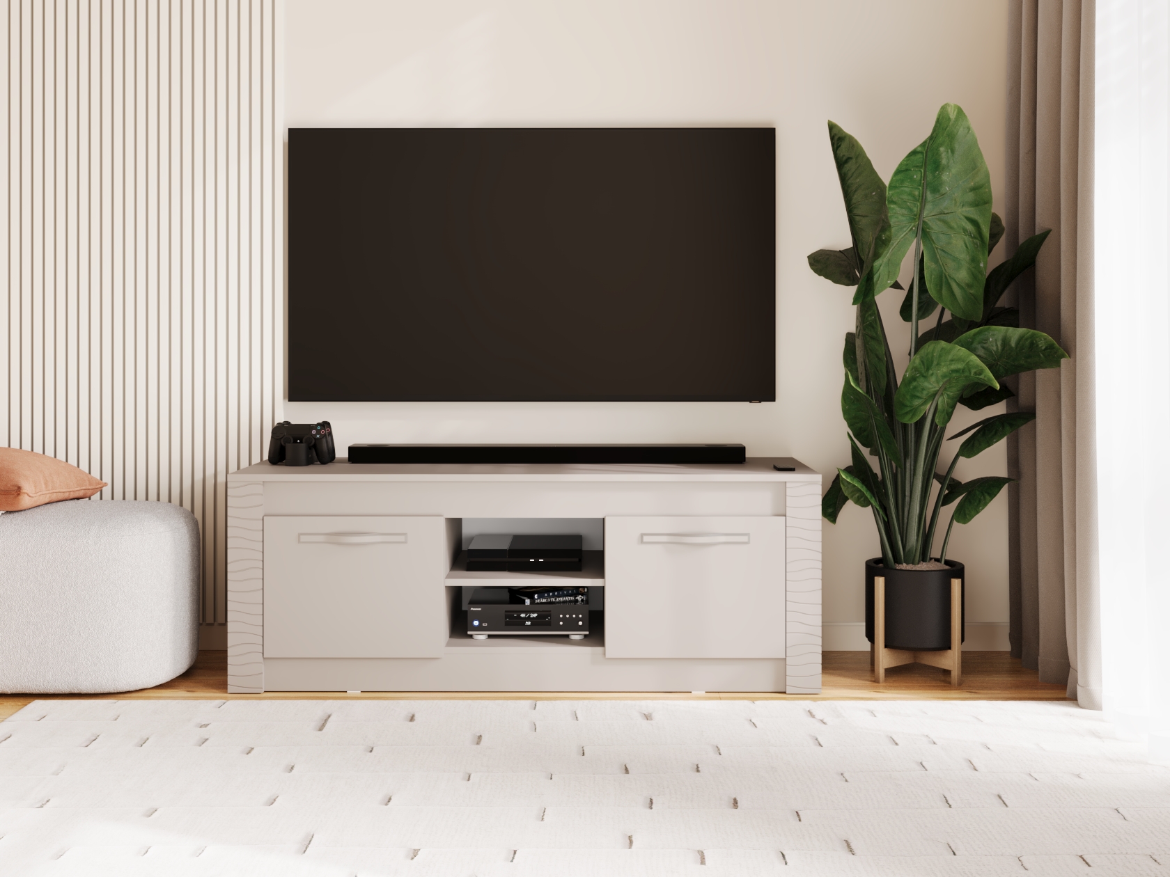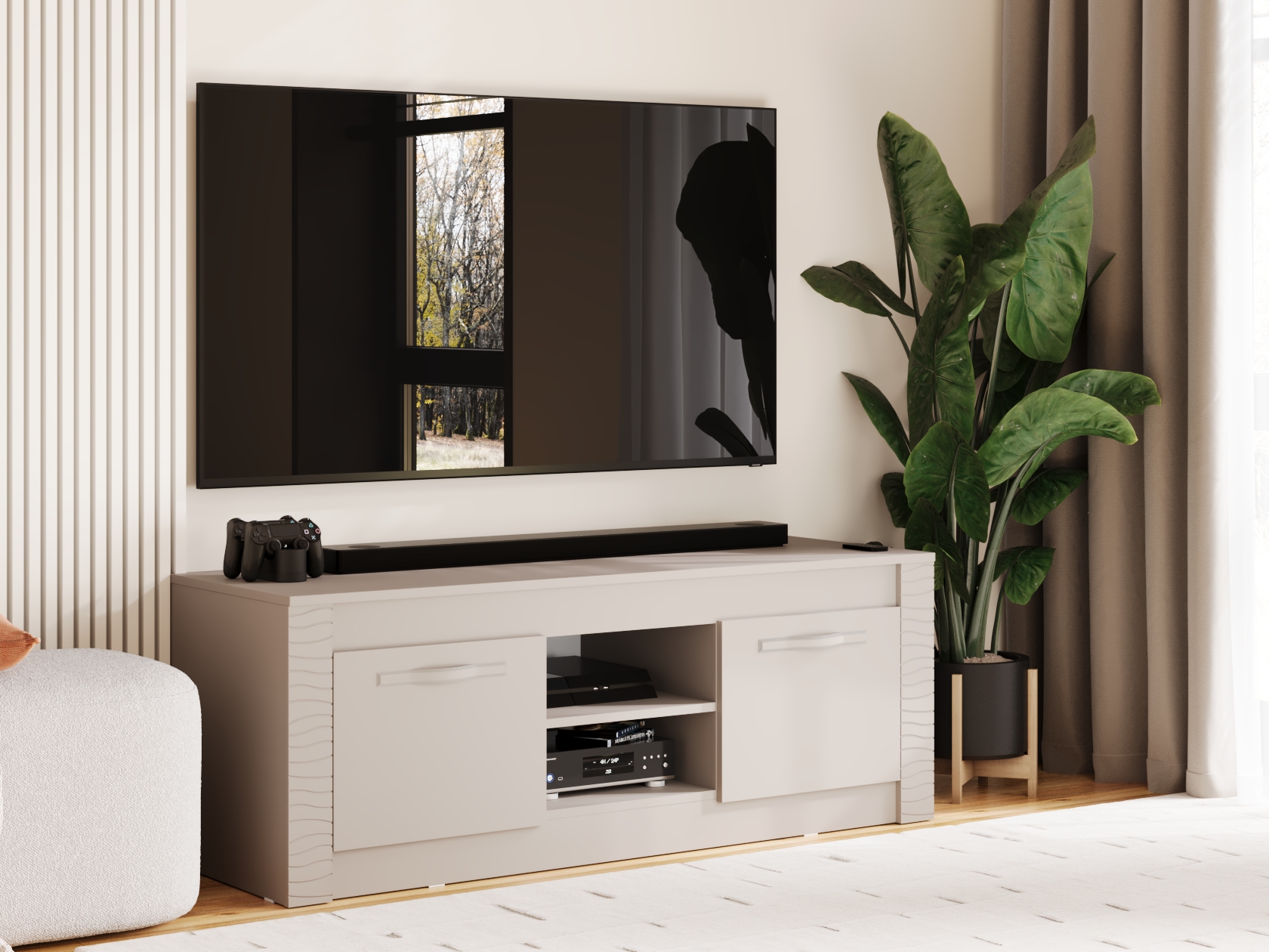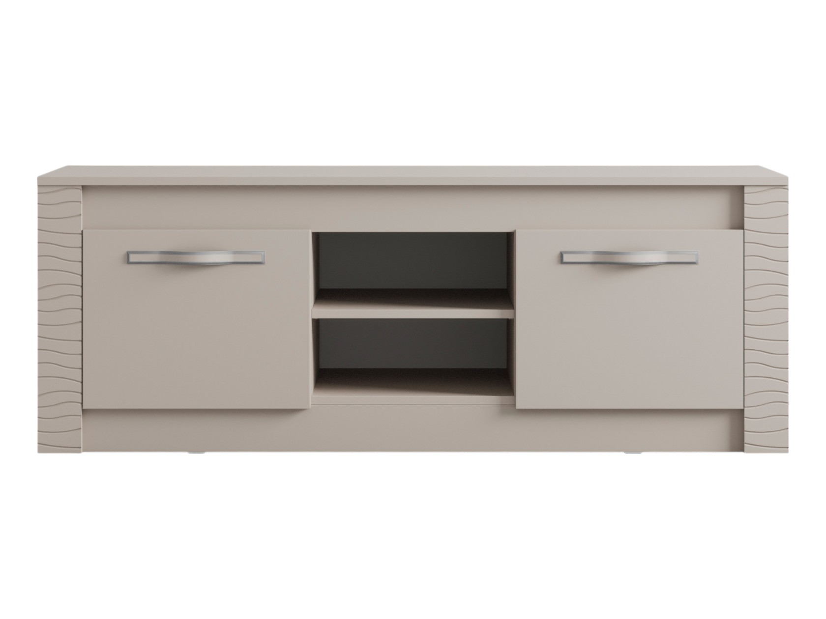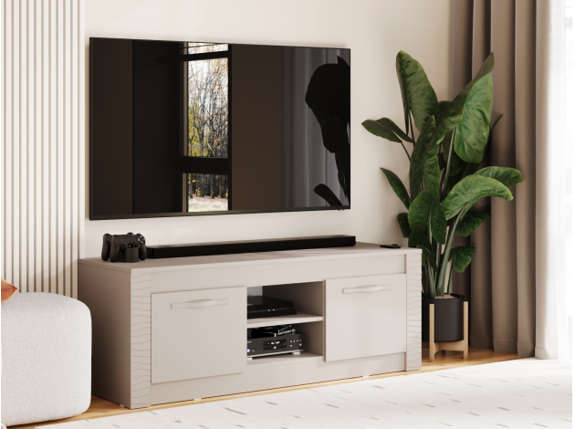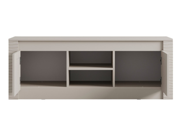 ТВ-тумба Монако — практичная модель для меблировки гостиной или спальни. В отделениях за распашными дверцами и открытой нише достаточно места для мультимедийной техники, дисков и различных гаджетов. Фрезеровка по бокам добавляет стильные акценты интерьеру комнаты.
