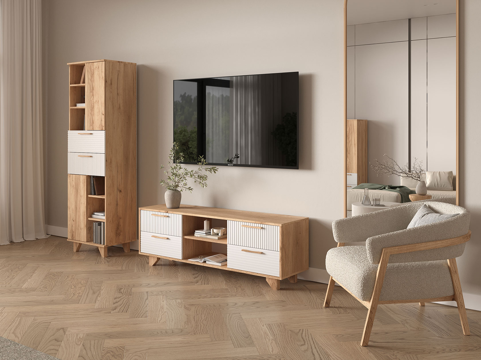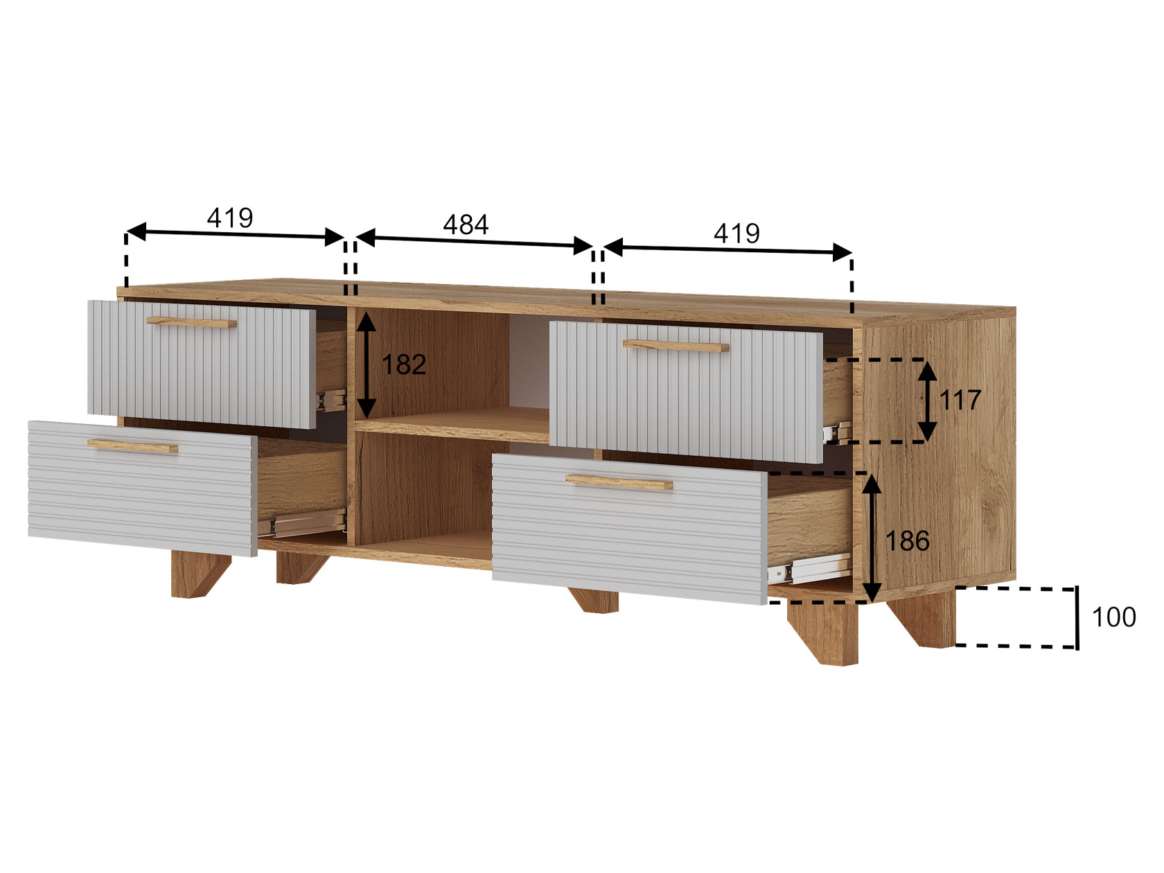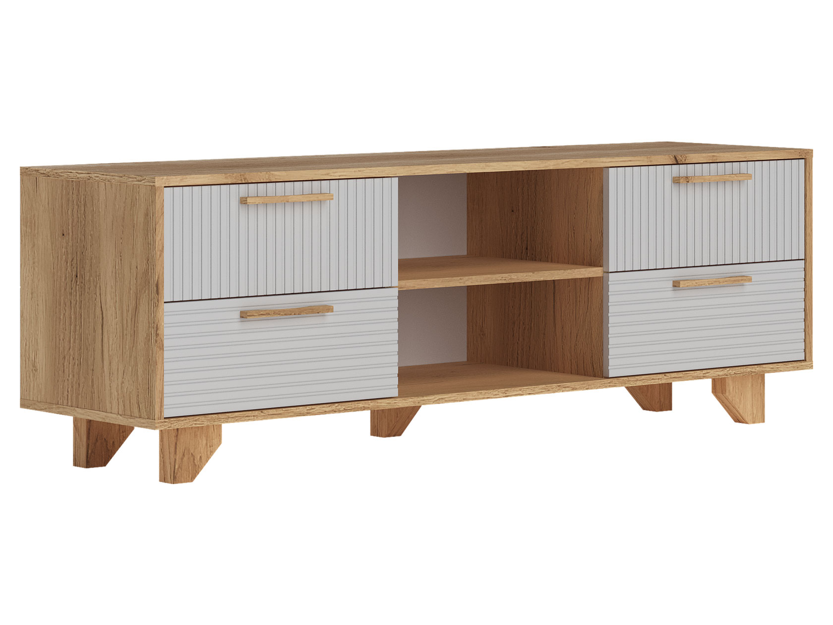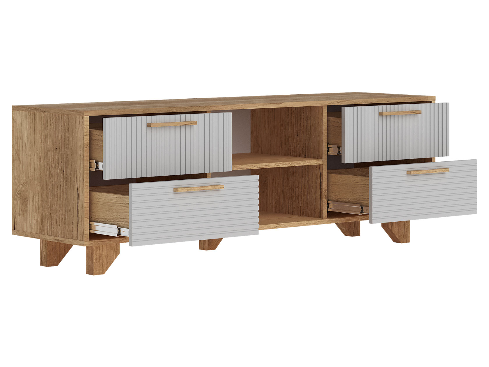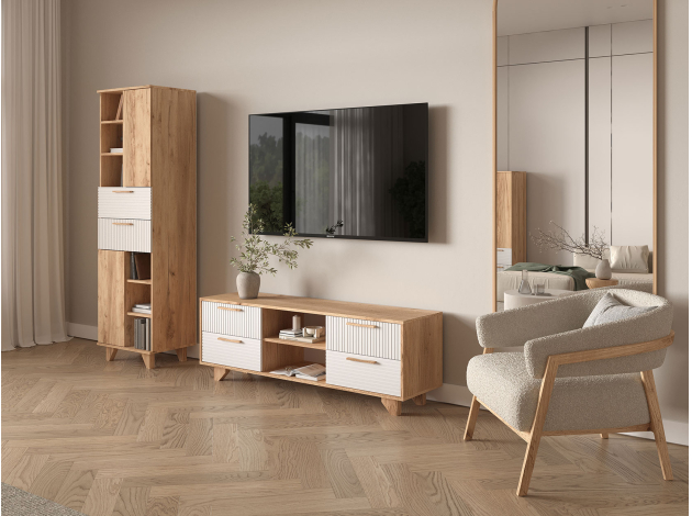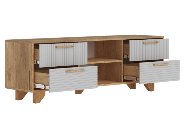 ТВ-тумба Ньерд с нишами понравится тем, кто ценит изящество и простоту. Минималистичная модель может похвастаться вместительной системой хранения. В выдвижных ящиках и на открытых полках удобно расположить различные вещи. Просторная поверхность предназначена для установки широкоформатного телевизора и другой техники.