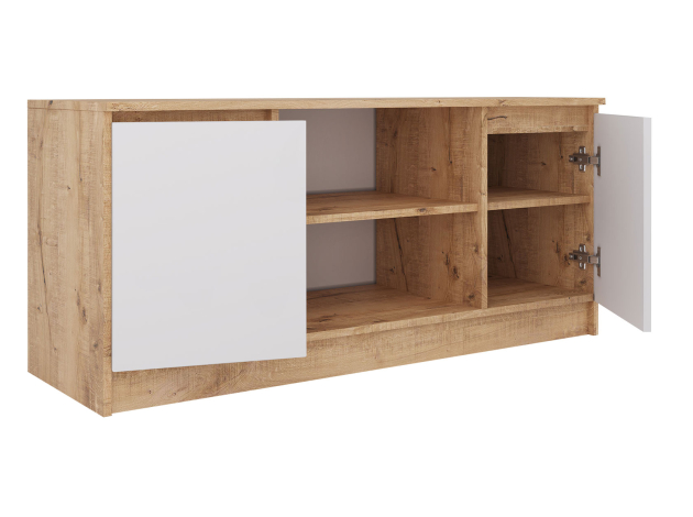 ТВ-тумба Охта Лайт позволит разместить широкоформатный телевизор в спальне или гостиной с современным интерьером. Для сопутствующей видеотехники найдется место в открытых нишах под столешницей. В отделениях с полками за распашными дверцами можно хранить домашнюю медиатеку и личные вещи.