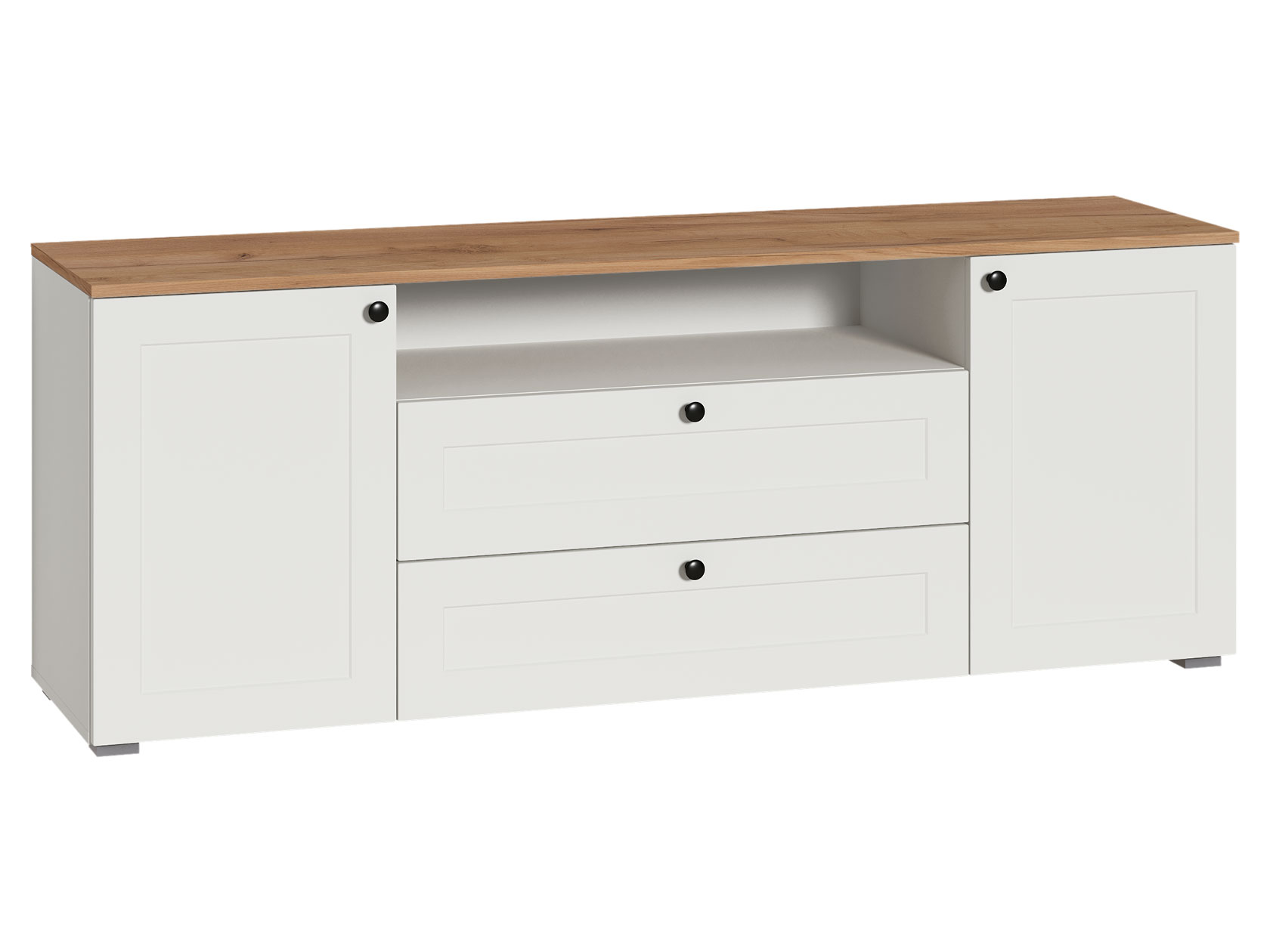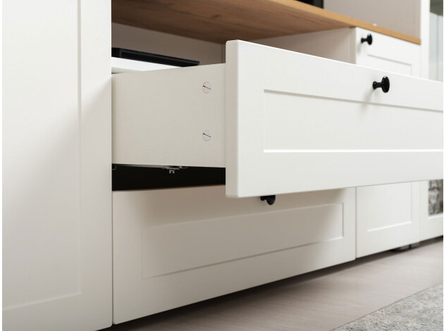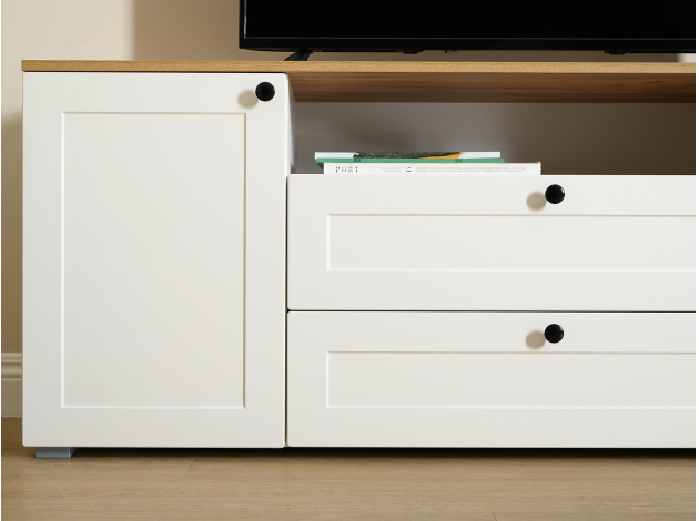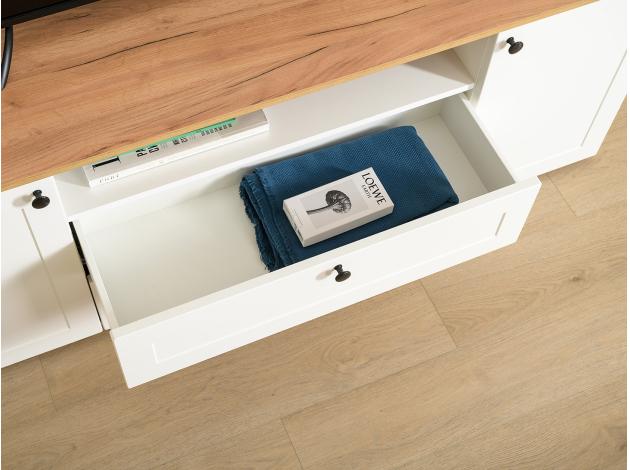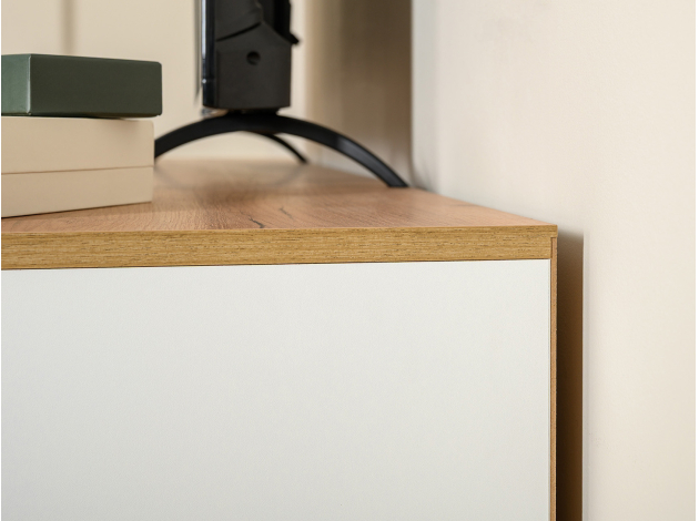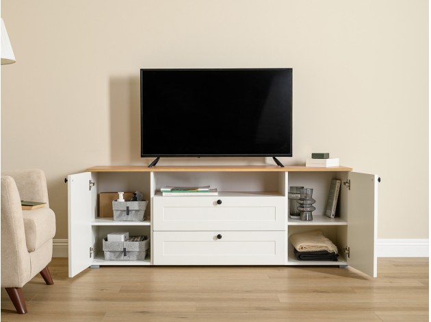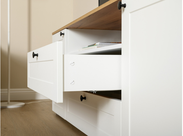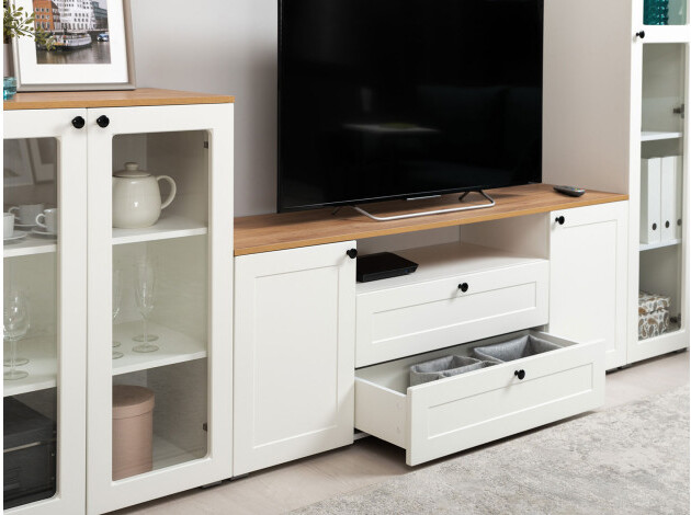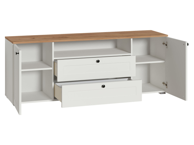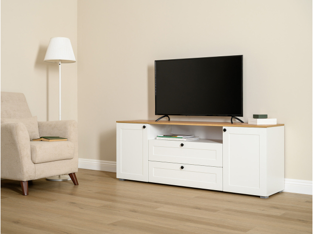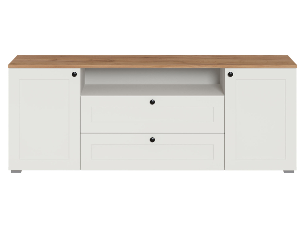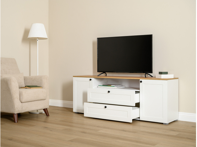 ТВ-тумба Остин — практичное решение для мультимедиа-техники, аксессуаров и других нужных вещей. Для быстрого доступа к содержимому предусмотрена пара ящиков, которые плавно выдвигаются на всю глубину. Рамочные фасады с акцентными ручками гармонично сочетаются с древесным оттенком столешницы.