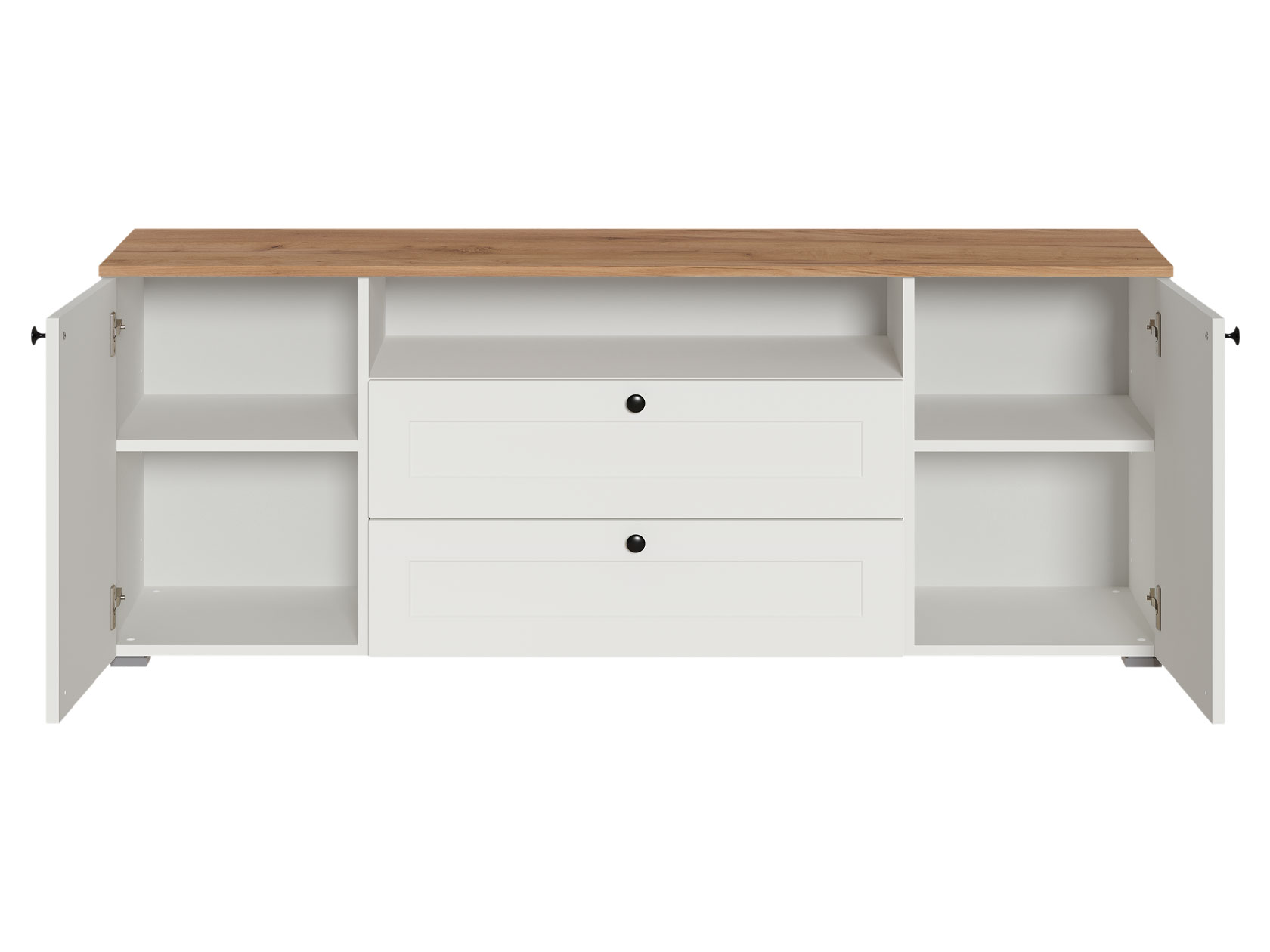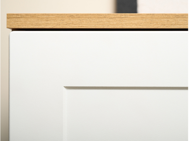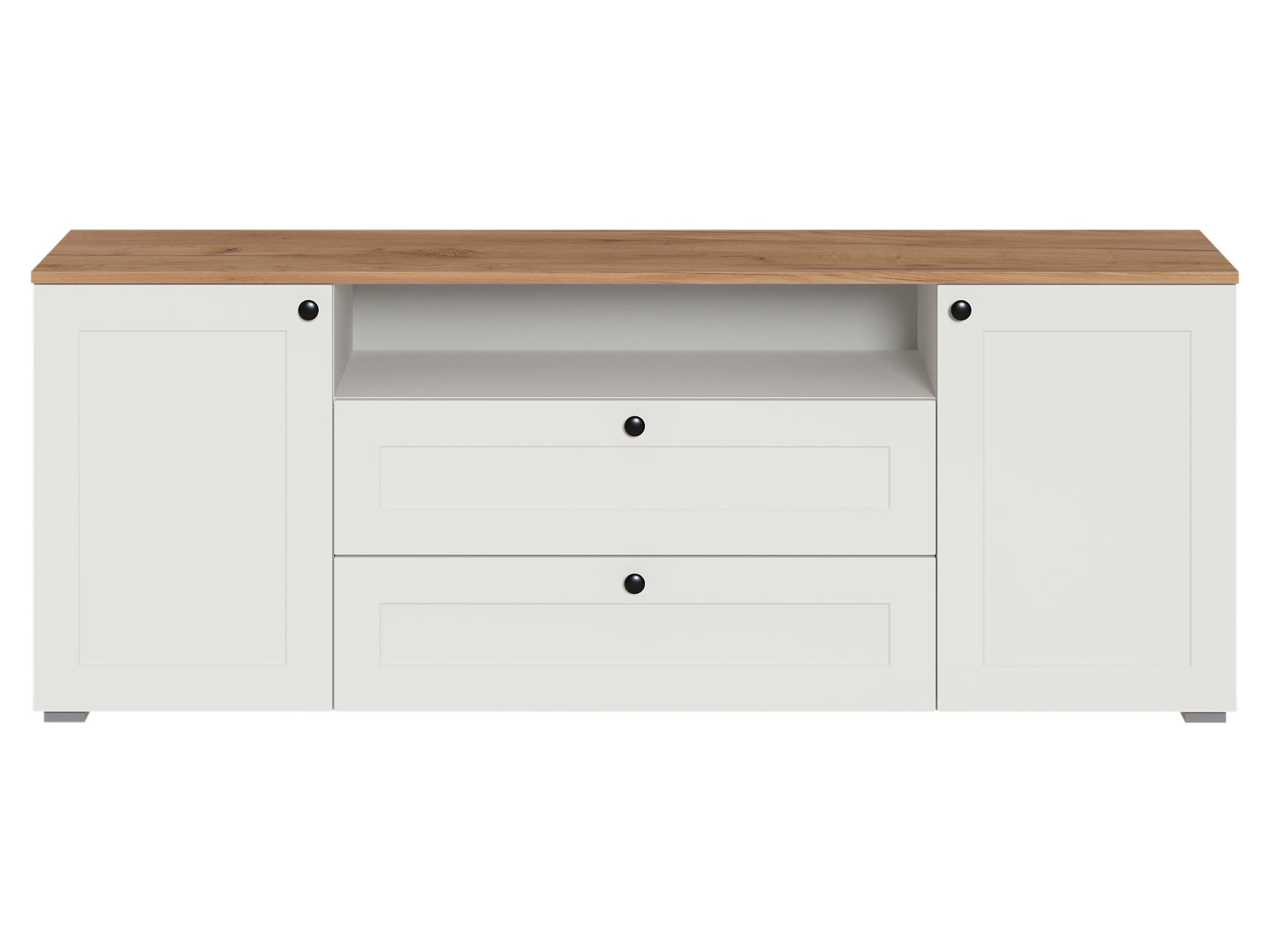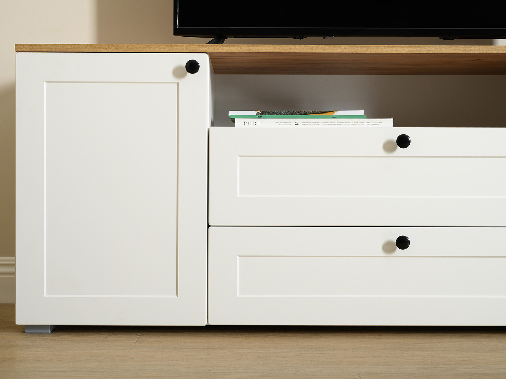 ТВ-тумба Остин — практичное решение для мультимедиа-техники, аксессуаров и других нужных вещей. Для быстрого доступа к содержимому предусмотрена пара ящиков, которые плавно выдвигаются на всю глубину. Рамочные фасады с акцентными ручками гармонично сочетаются с древесным оттенком столешницы.