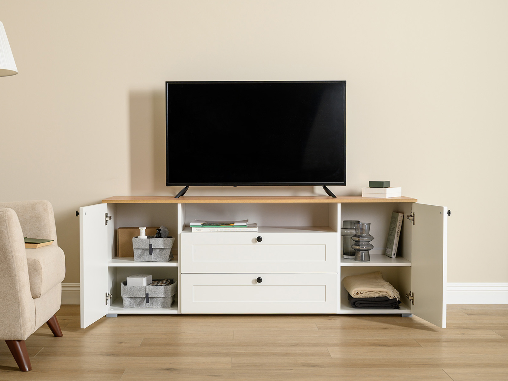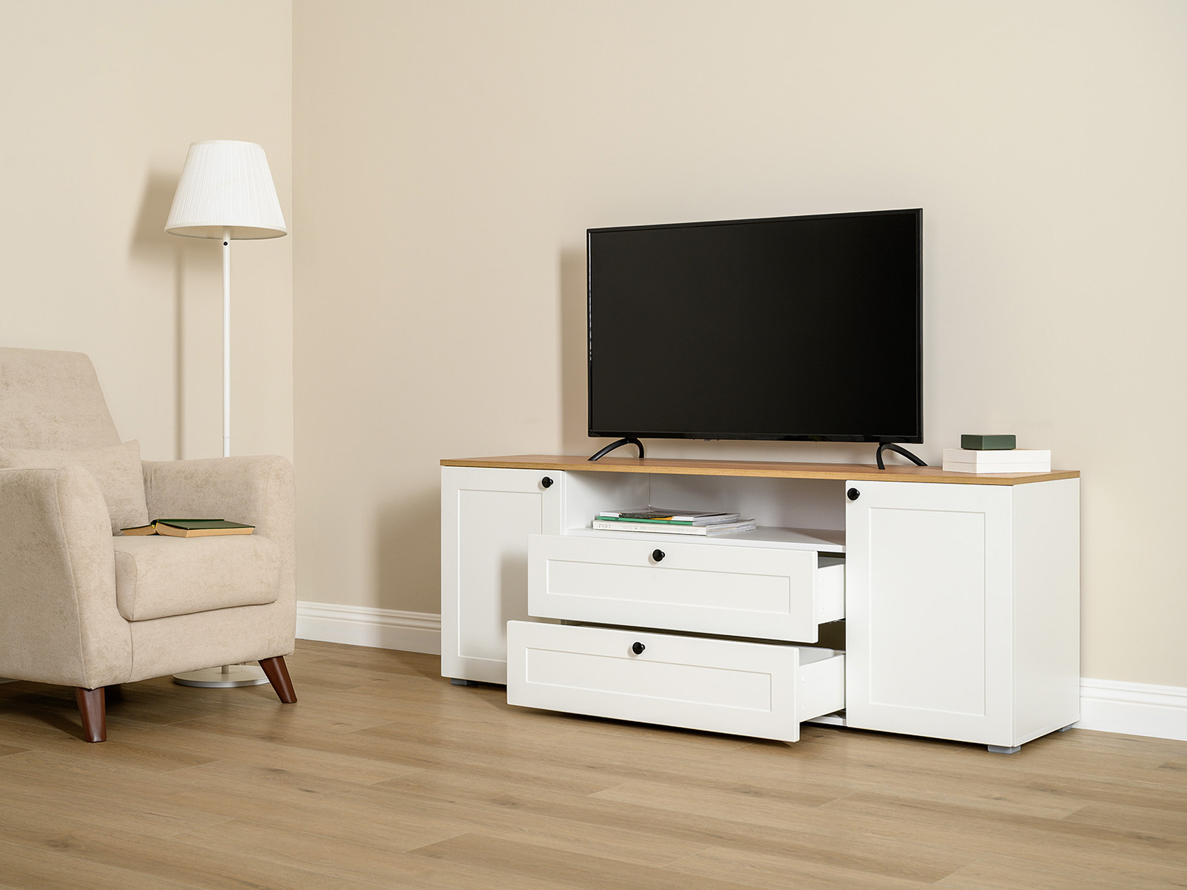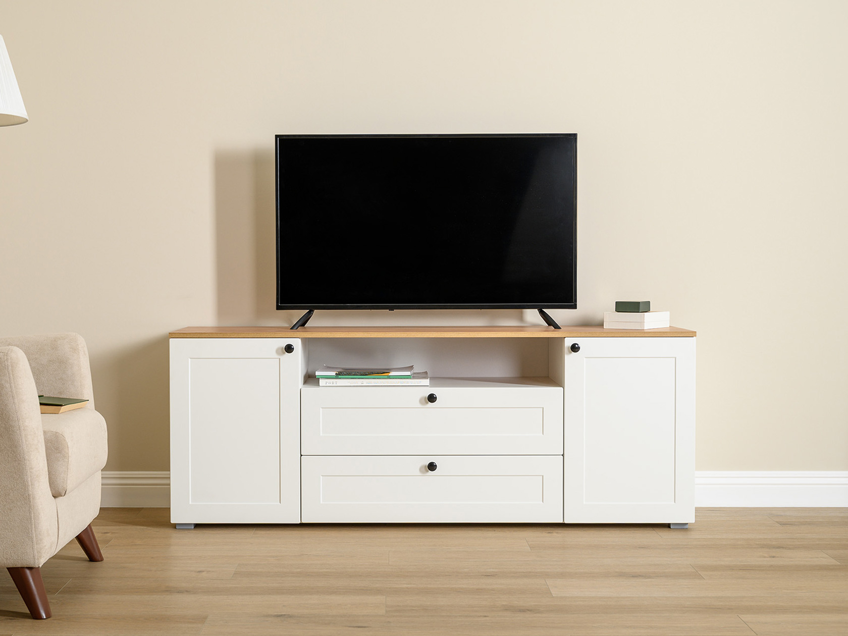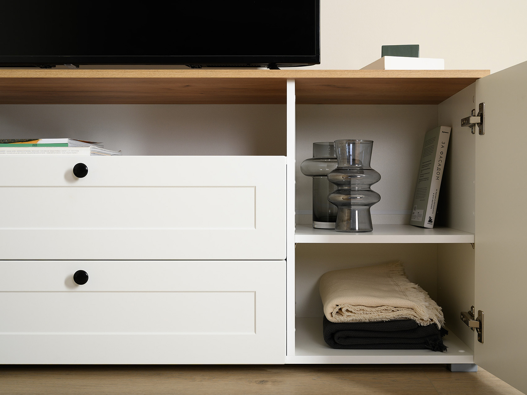 ТВ-тумба Остин — практичное решение для мультимедиа-техники, аксессуаров и других нужных вещей. Для быстрого доступа к содержимому предусмотрена пара ящиков, которые плавно выдвигаются на всю глубину. Рамочные фасады с акцентными ручками гармонично сочетаются с древесным оттенком столешницы.