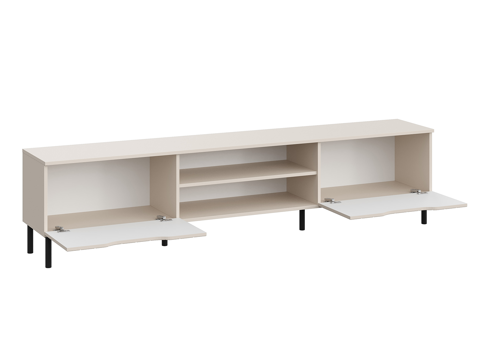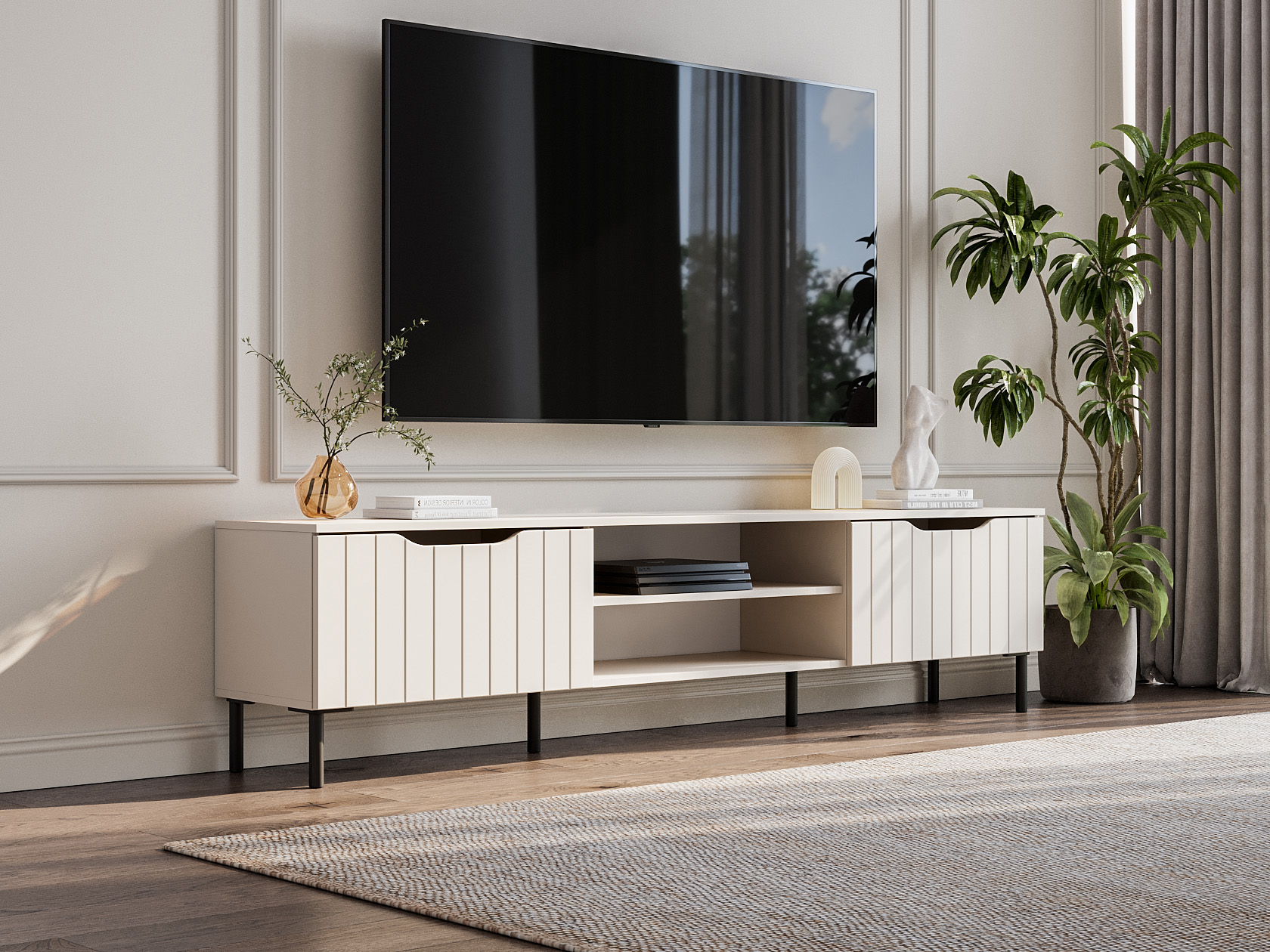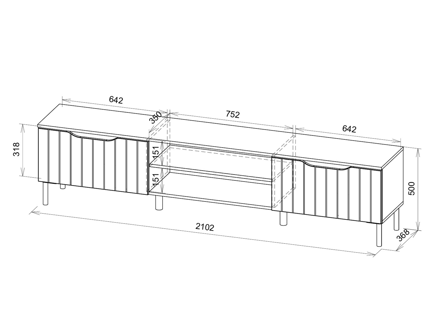 ТВ-тумба Памир Макси — функциональная модель с оригинальным дизайном. Вырезы вместо выступающей фурнитуры и вертикальный декор превращают мебель в акцентный элемент интерьера. На открытых полках удобно хранить сопутствующую технику и аксессуары, а за откидными дверцами — спрятать разные мелочи и предметы обихода. Тумбу можно подвесить на стену или установить на металлические опоры.