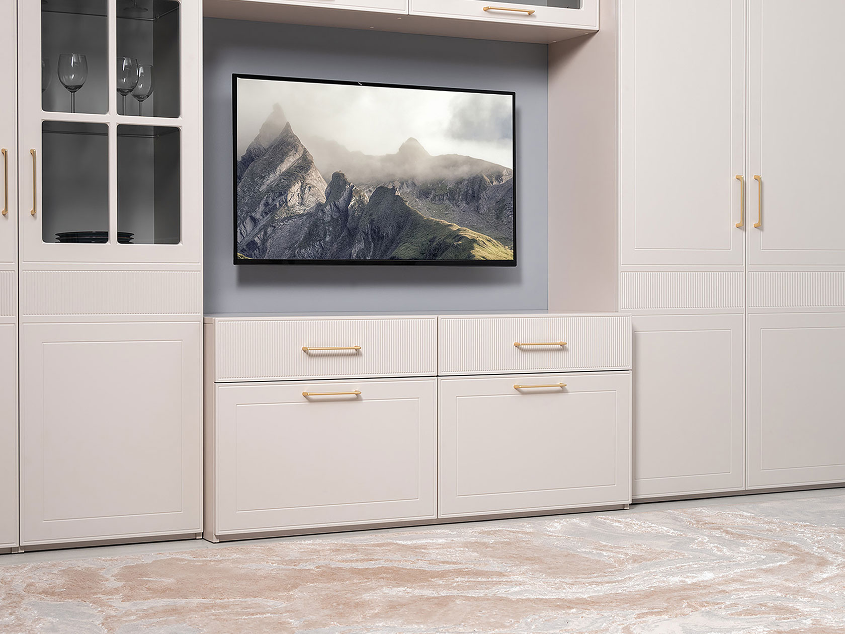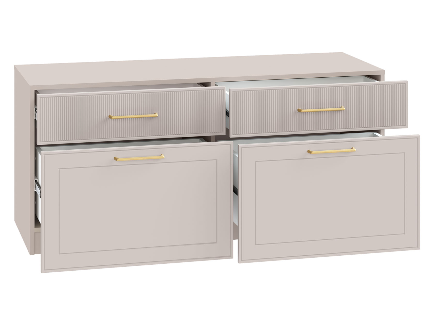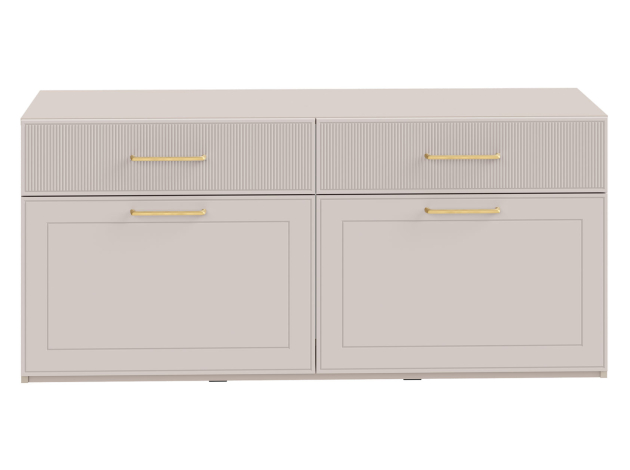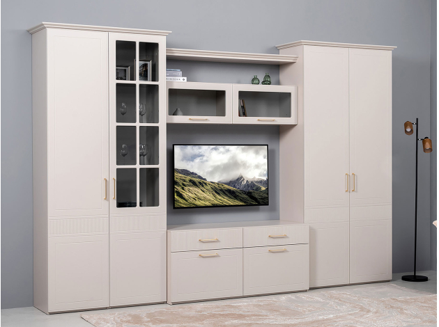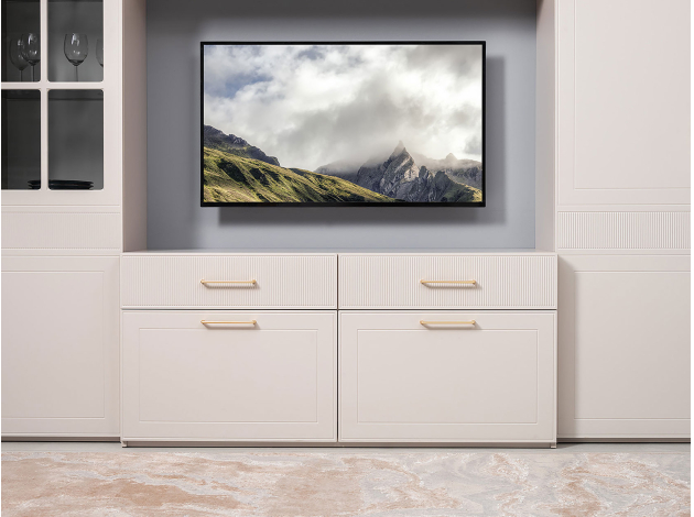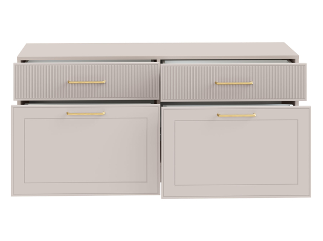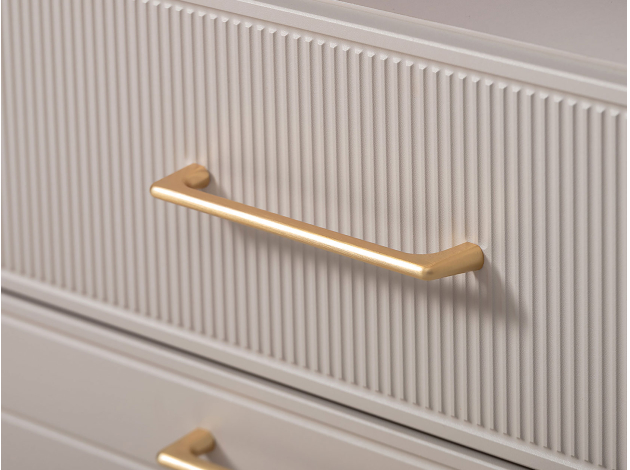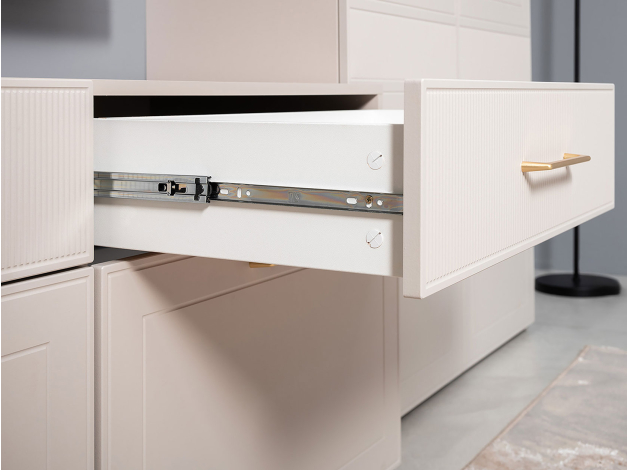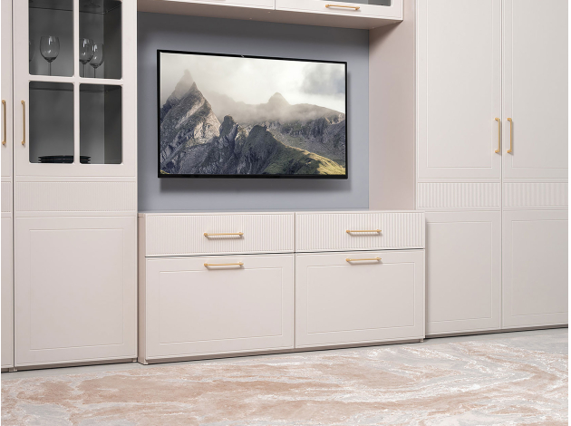 ТВ-тумба Ричфорд идеально подходит для организации рационального хранения в гостиной. На широкой поверхности легко поместится телевизор большой диагонали. Ящики разной высоты плавно выдвигаются на всю глубину, обеспечивая удобный доступ к вещам. В верхних секциях удобно хранить пульты и зарядки от гаджетов и другие элементы мультимедиа-системы. Фасады с фрезеровкой гармонично сочетаются с металлическими ручками в золотом оттенке.