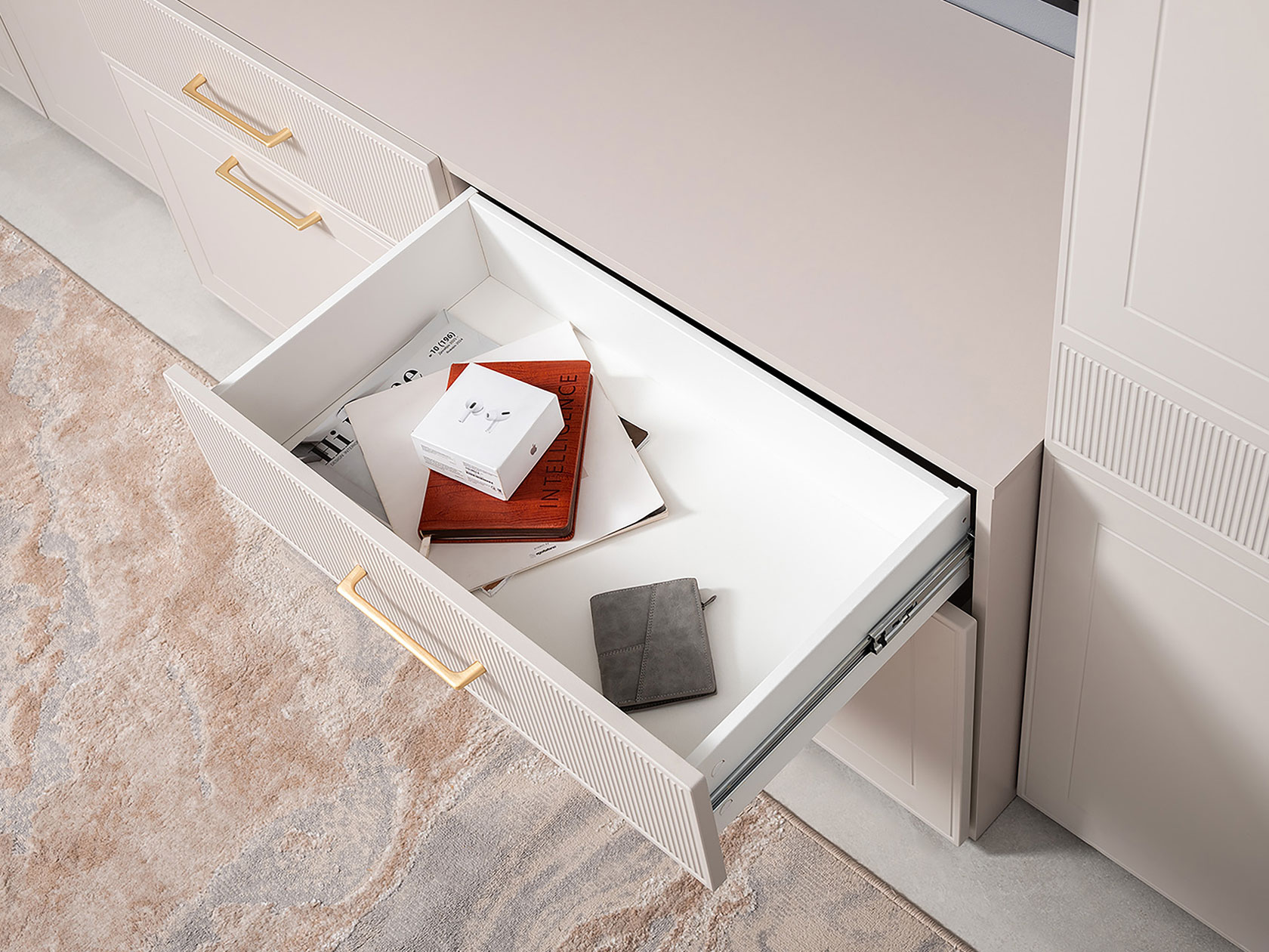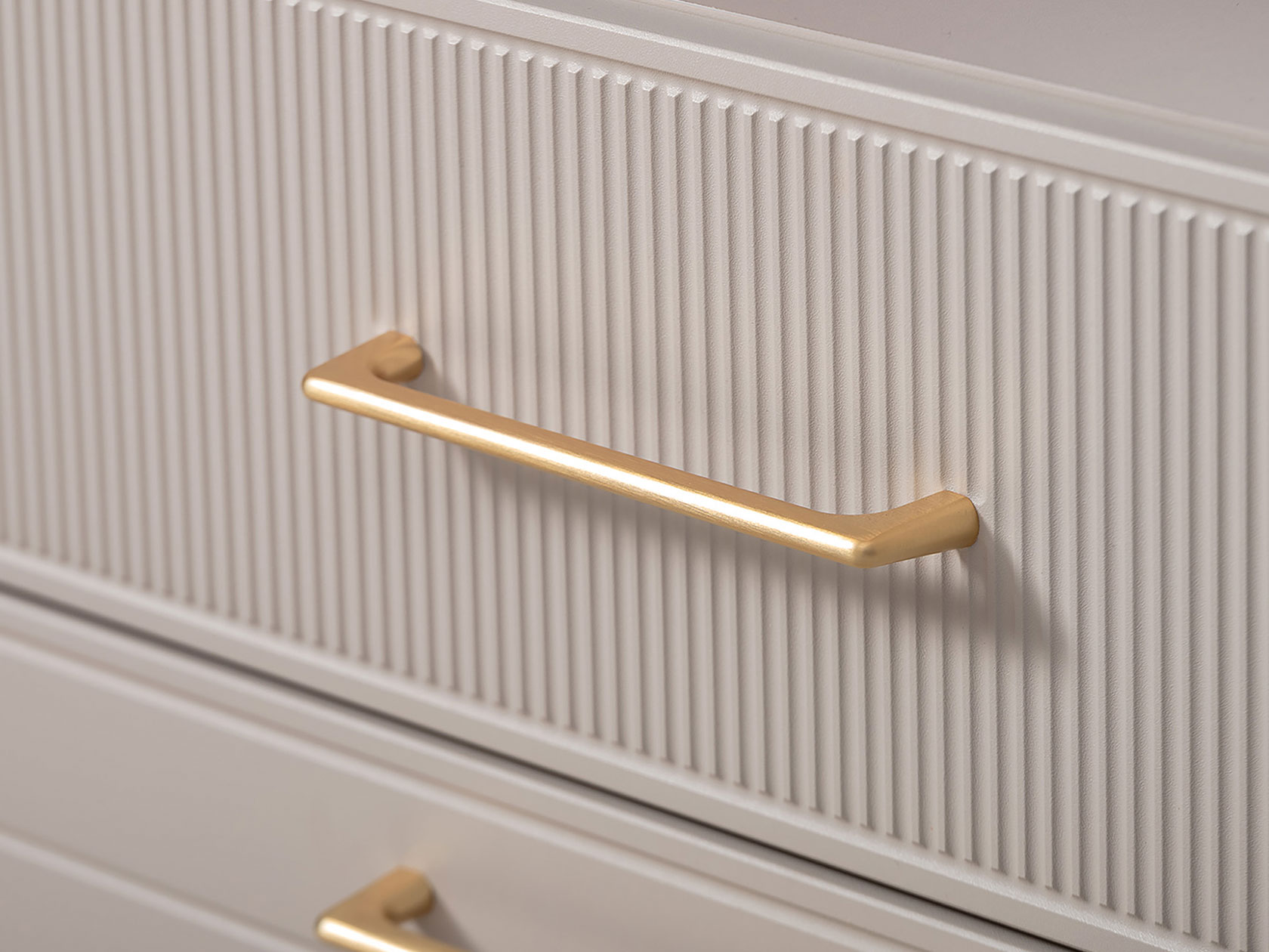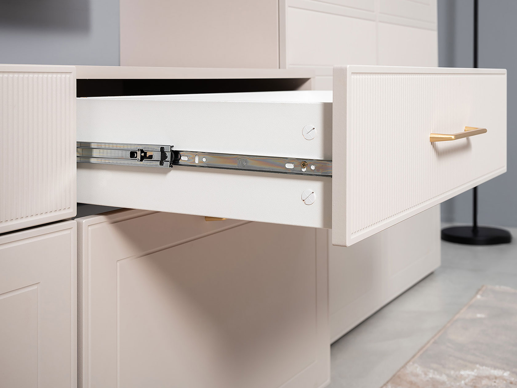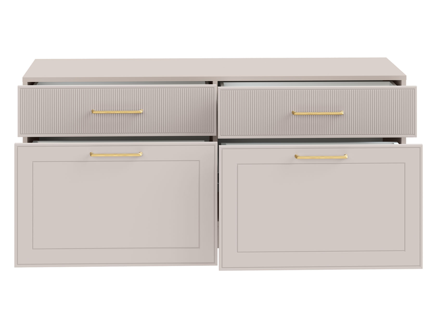 ТВ-тумба Ричфорд идеально подходит для организации рационального хранения в гостиной. На широкой поверхности легко поместится телевизор большой диагонали. Ящики разной высоты плавно выдвигаются на всю глубину, обеспечивая удобный доступ к вещам. В верхних секциях удобно хранить пульты и зарядки от гаджетов и другие элементы мультимедиа-системы. Фасады с фрезеровкой гармонично сочетаются с металлическими ручками в золотом оттенке.