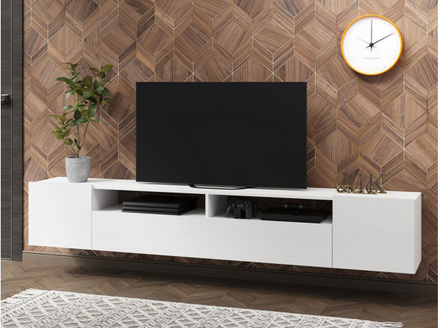 ТВ-тумба Соло — простая и вместе с тем очень функциональная модель для оформления просторной гостиной. Открытые полки для роутера, приставки и джойстика дополнены закрытыми секциями, где можно спрятать от пыли другие нужные вещи. На фасадах нет фурнитуры: все дверцы открываются с помощью специальных выступов.