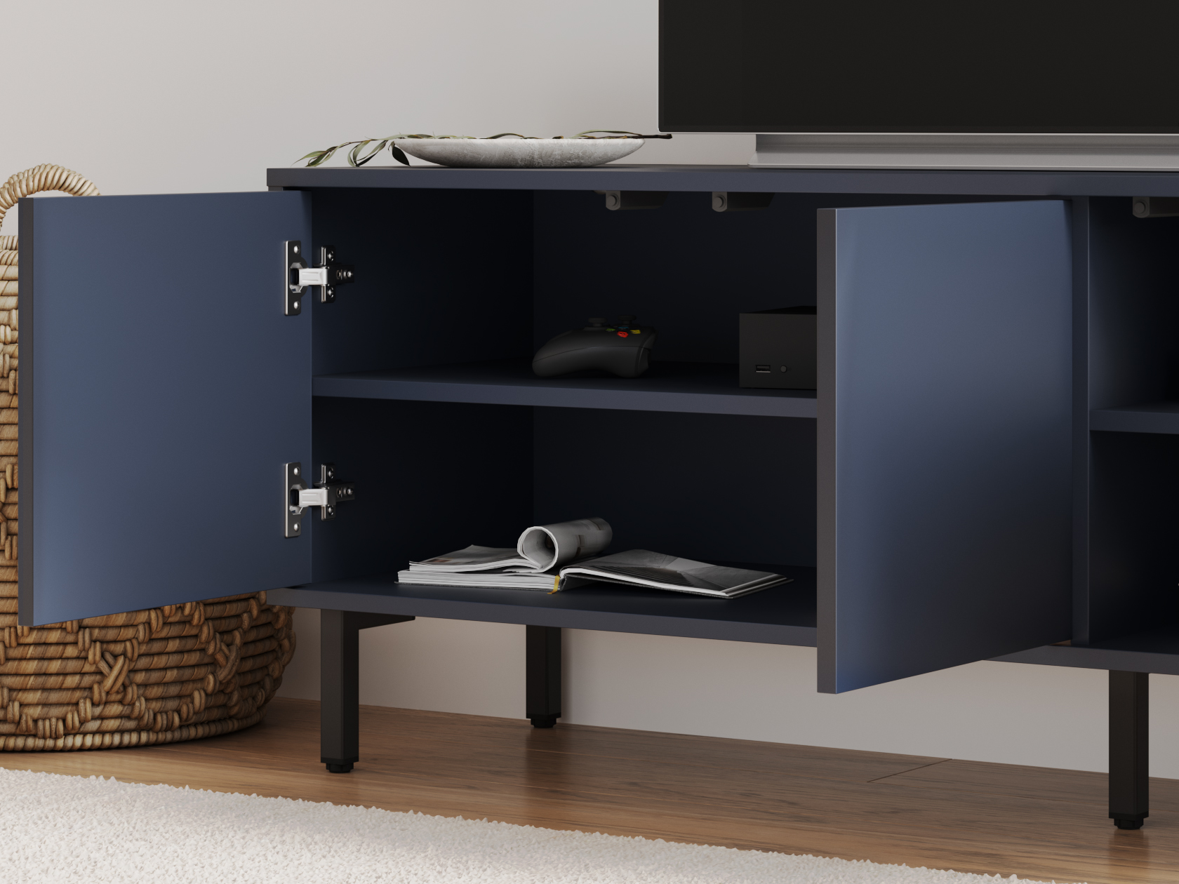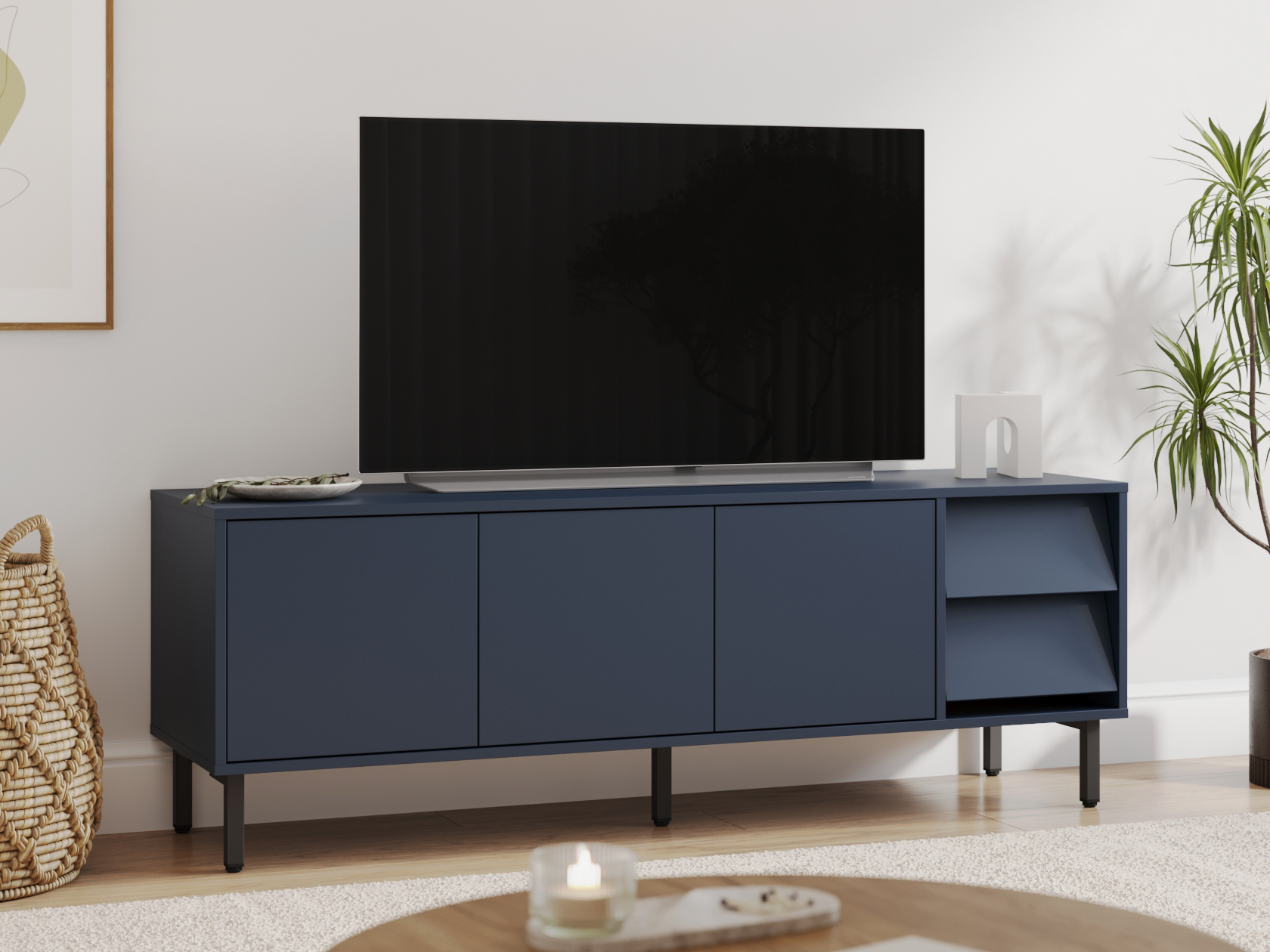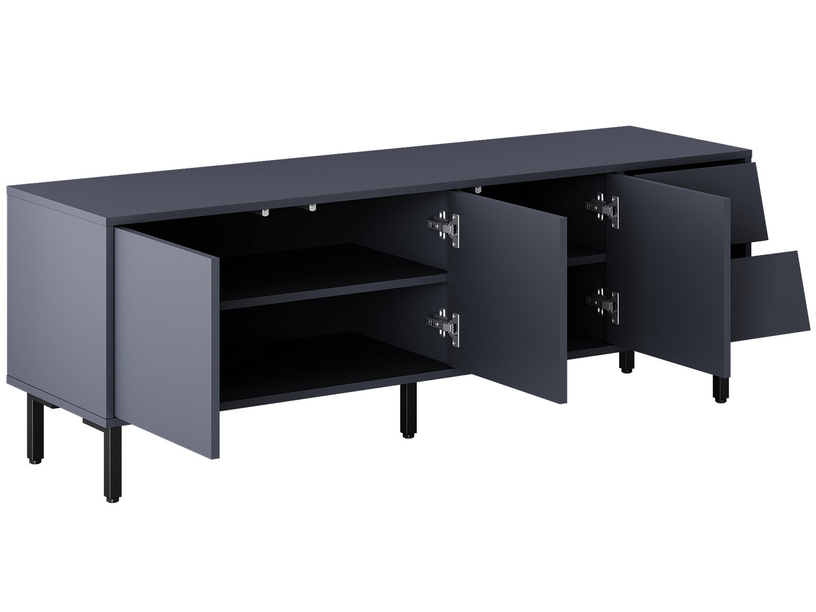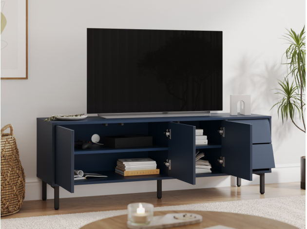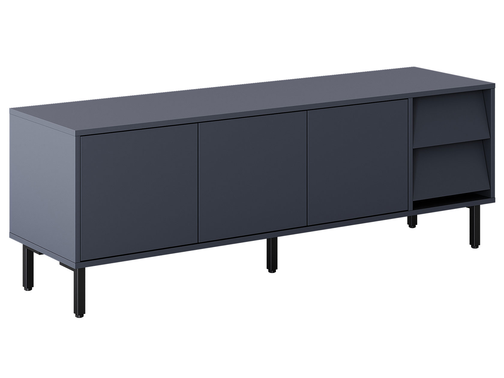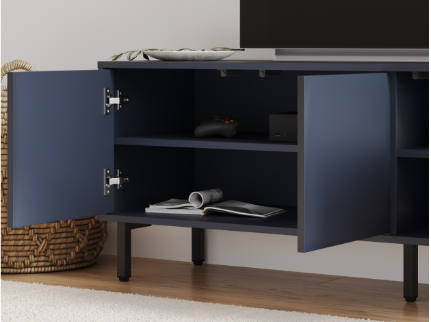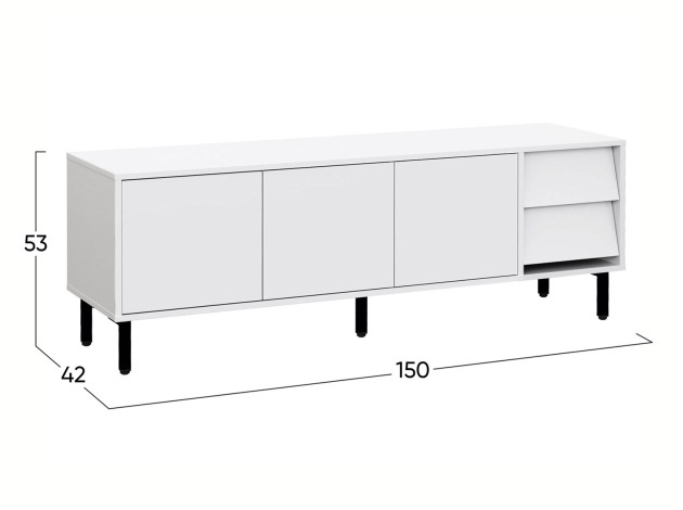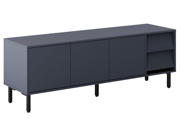 ТВ-тумба Степ привлекает внимание эффектным сочетанием прямых и скошенных фасадов. Дверцы закрываются плавно и бесшумно, а выдвижные ящики предоставляют полный обзор содержимого. На поверхности можно разместить телевизор с широкой диагональю или осветительные приборы. Высокие опоры облегчают уборку.
