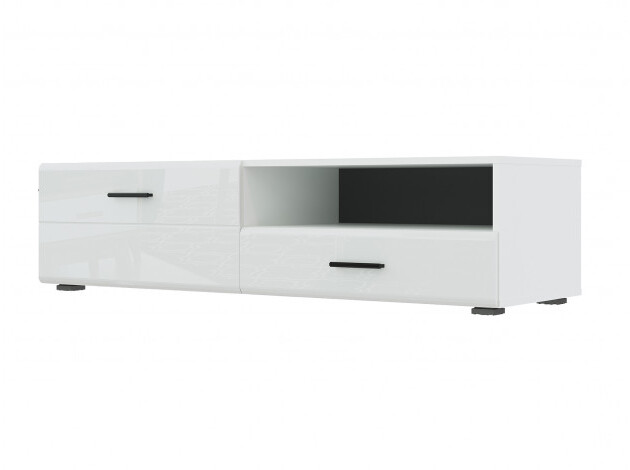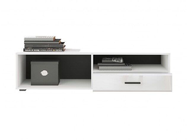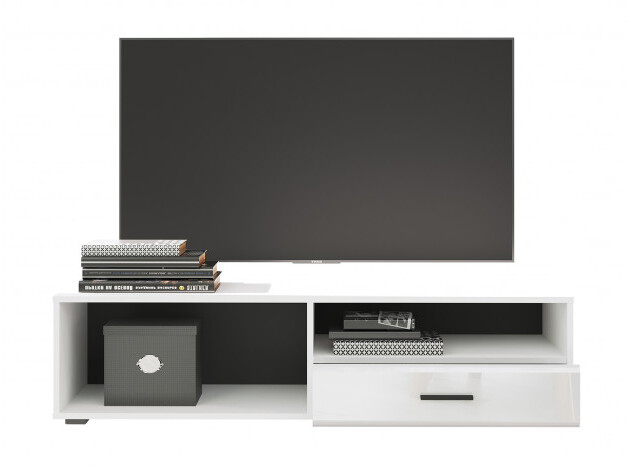 ТВ-тумба Глосс — функциональное решение для меблировки спальни или гостиной. Открытая ниша подойдет для размещения игровой консоли, роутера или пары книг, а выдвижной ящик спрячет полезные мелочи. Универсальное белое исполнение хорошо сочетается с другой мебелью. Оригинальная дверца, снабженная газлифтом и петлями, откидывается вниз для экономии пространства.