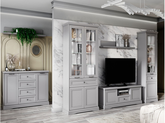 ТВ-тумба Валенсия станет функциональным элементом гостиной и позволит разместить широкоформатный телевизор. Отделения за распашными фасадами подойдут для хранения сложенной одежды и постельного белья, а выдвижной ящик — для пульта и полезных мелочей. В открытую нишу можно поместить игровую консоль или другую видеотехнику.