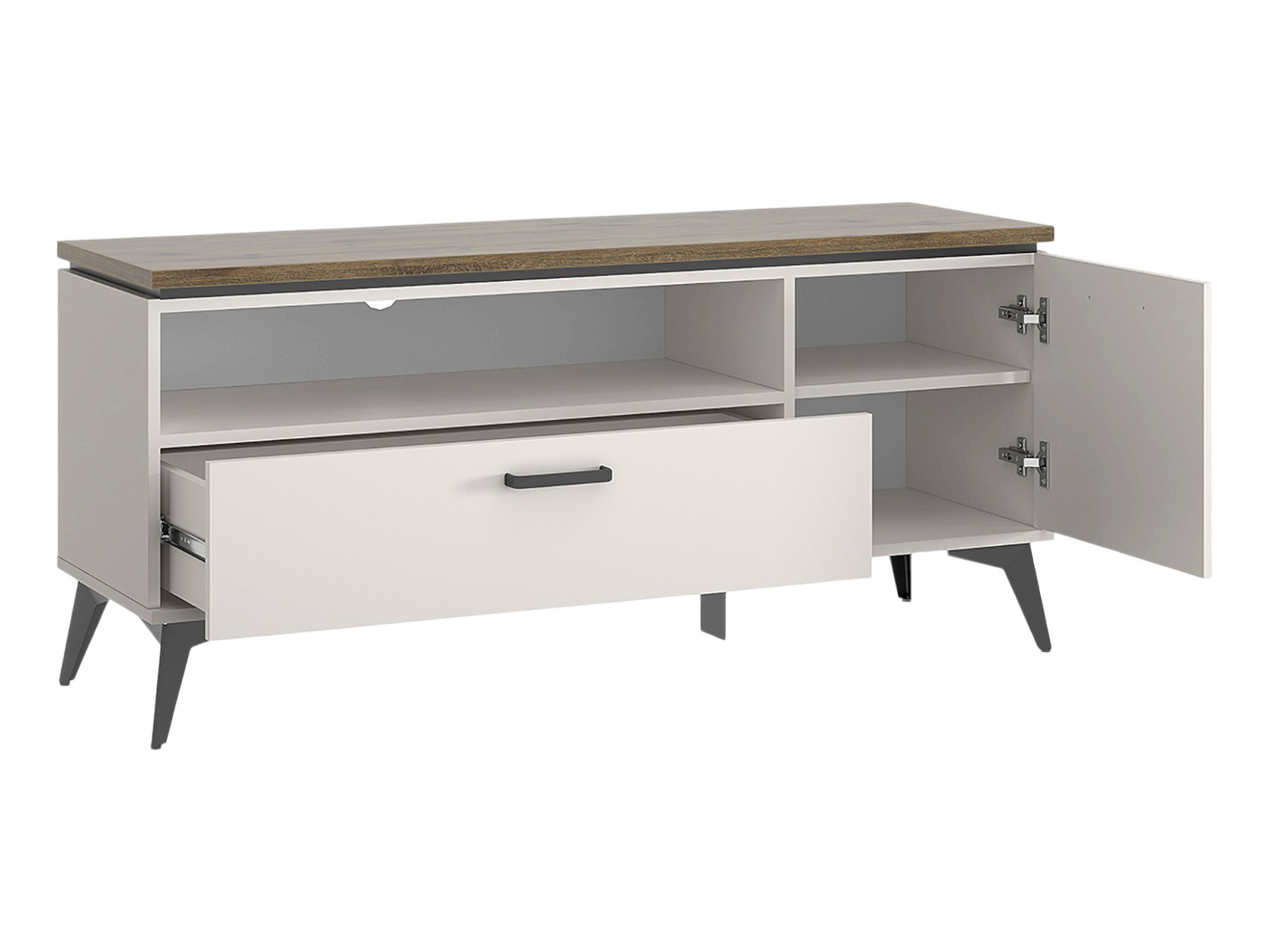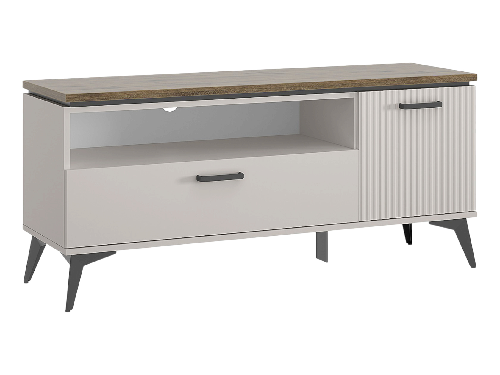 ТВ-тумба Винати — современная модель с оригинальным дизайном, которая украсит гостиную и позволит разместить широкоформатный телевизор. Контрастные ножки и фурнитура в сочетании с рифленым декором создают акценты в интерьере. В открытой нише удобно хранить аксессуары, видео- и аудиотехнику, а за глухими дверцами можно спрятать разные мелочи и предметы обихода.