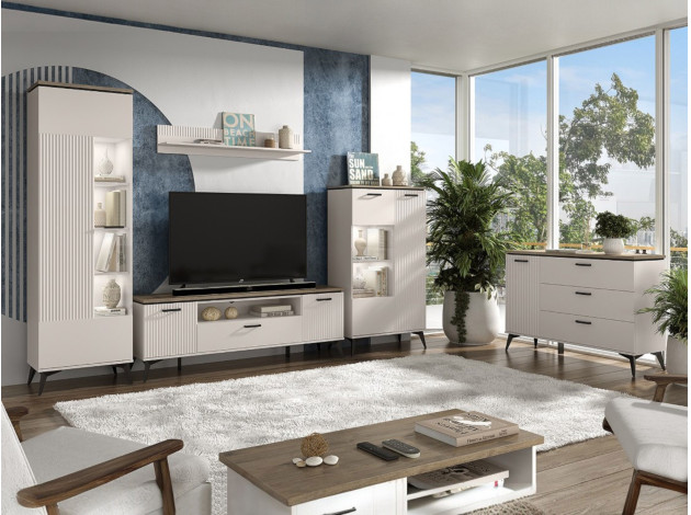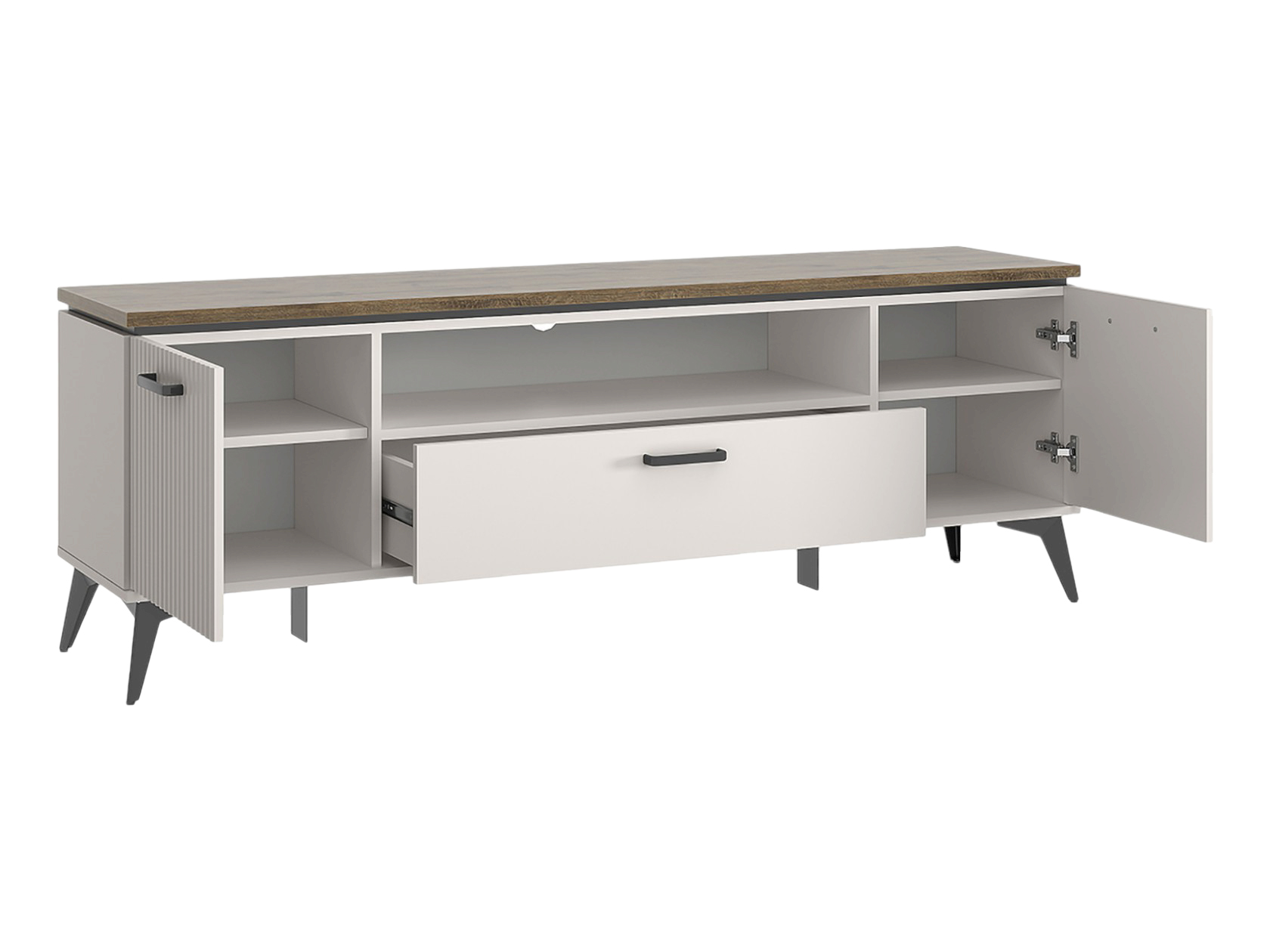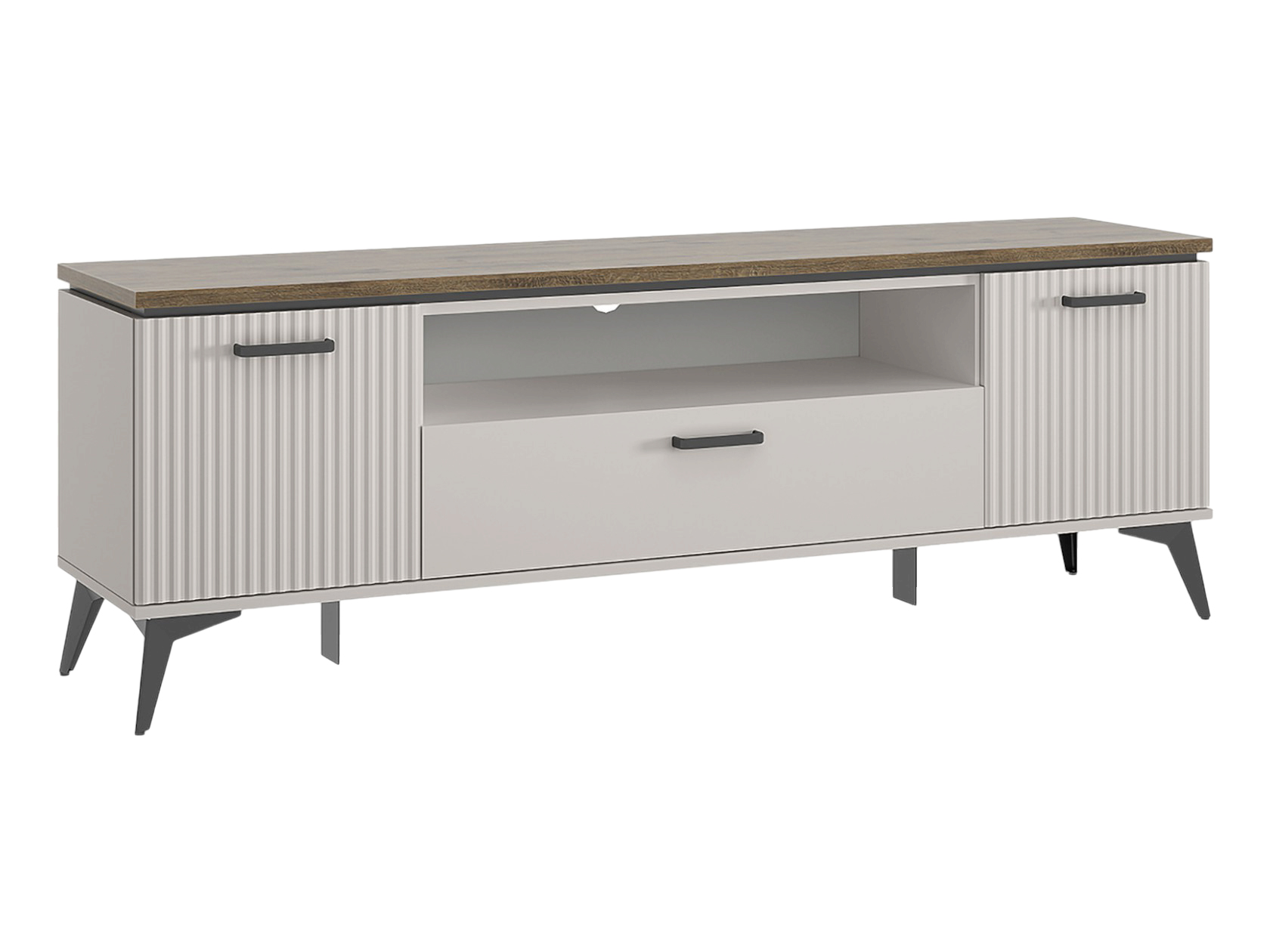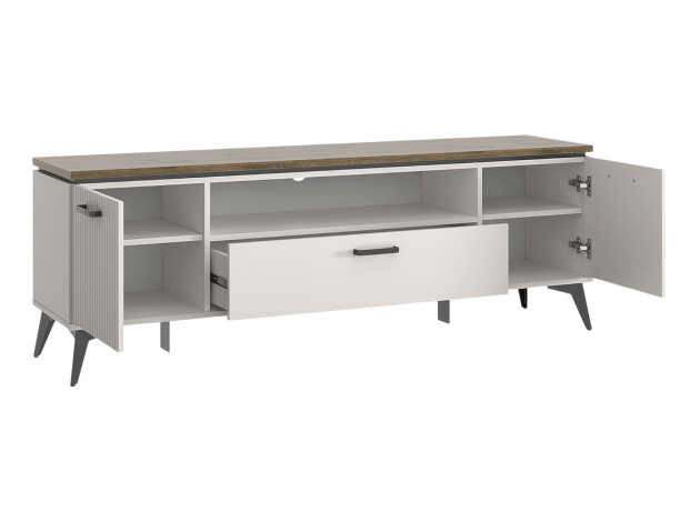 ТВ-тумба Винати Комби подойдет для размещения монитора с большой диагональю и других мультимедийных устройств. Отделения с дверцами, выдвижной ящик и открытая ниша по центру помогут поддерживать порядок в комнате. Вертикальная фрезеровка послужит стильным декором, а древесный оттенок добавит обстановке уютный акцент. Ножки в цвет фурнитуры расположены чуть под углом, что также придает мебели привлекательный вид.